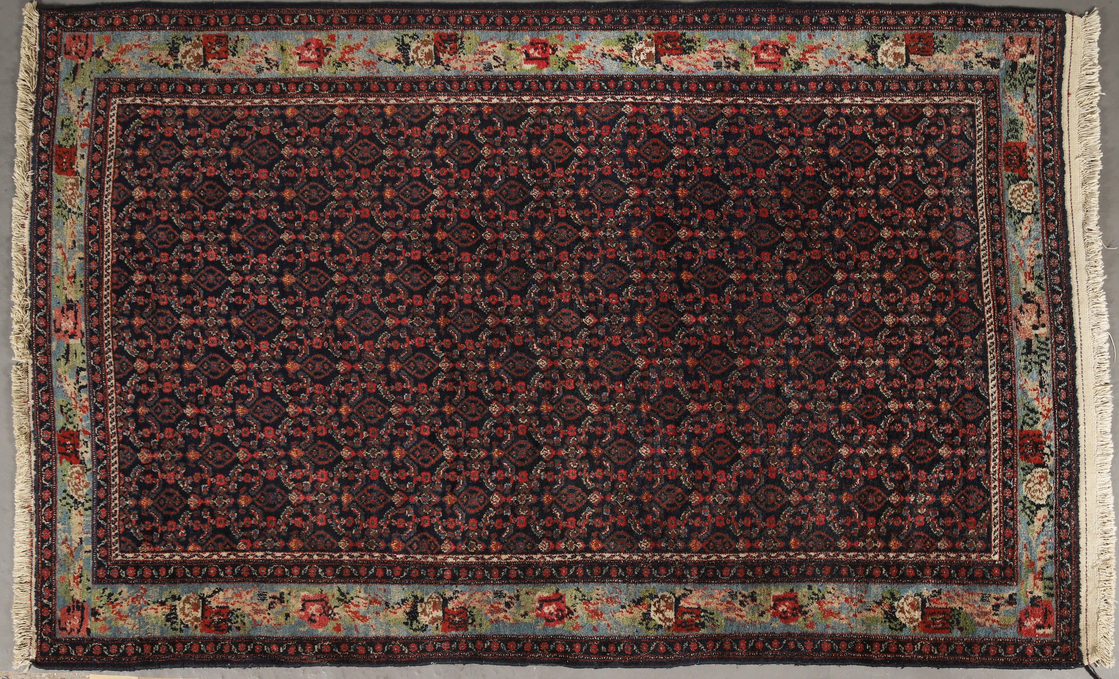 SENNEH CARPET (Iran) circa 1950 in wool and cotton decorated with botehs on a midnight blue background. 210 x 140 cm