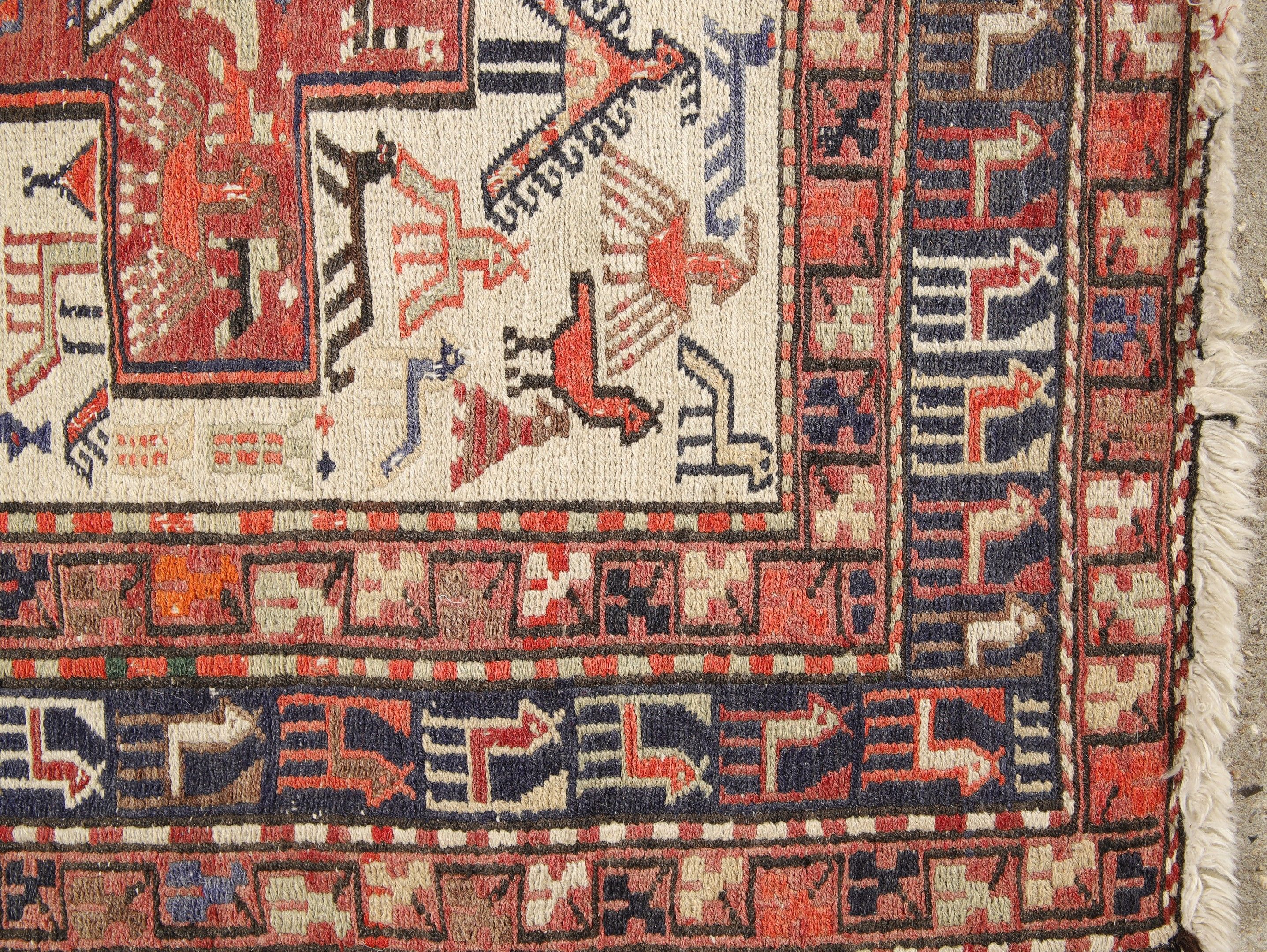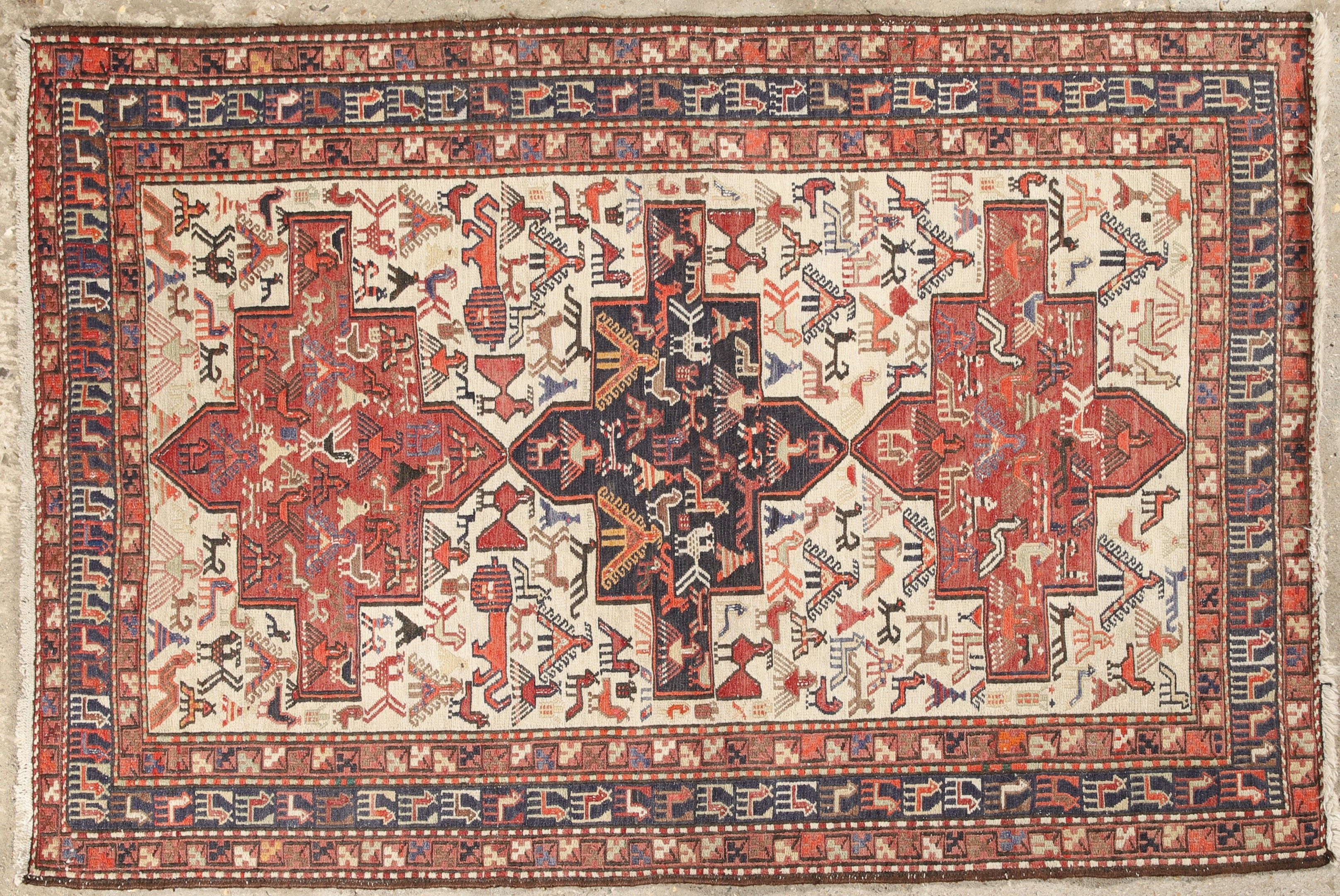 IRAN SOUMAK CARPET Crochet work circa 1970 wool on cotton decorated with medallions and animals on a beige background. 150 x 100 cm