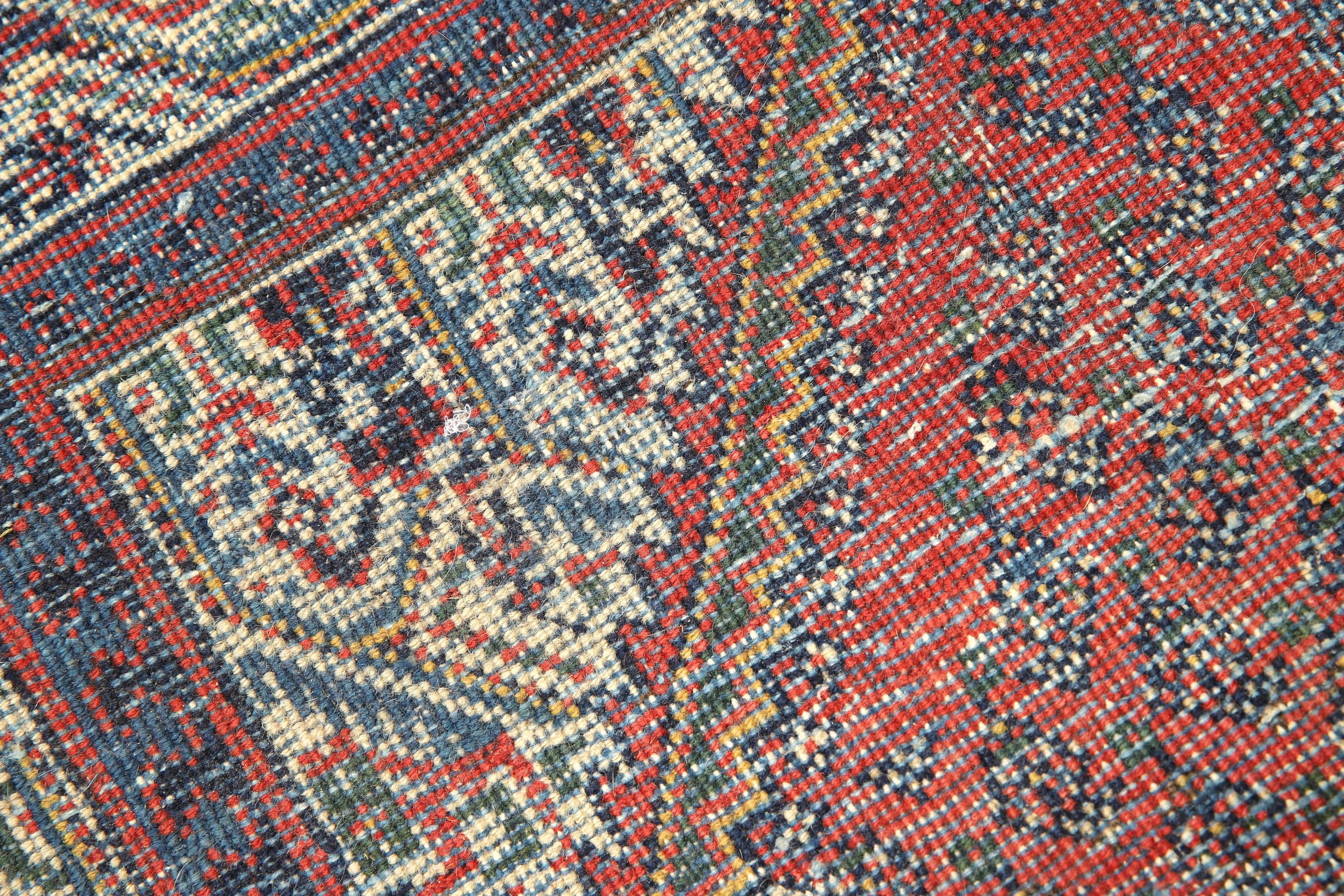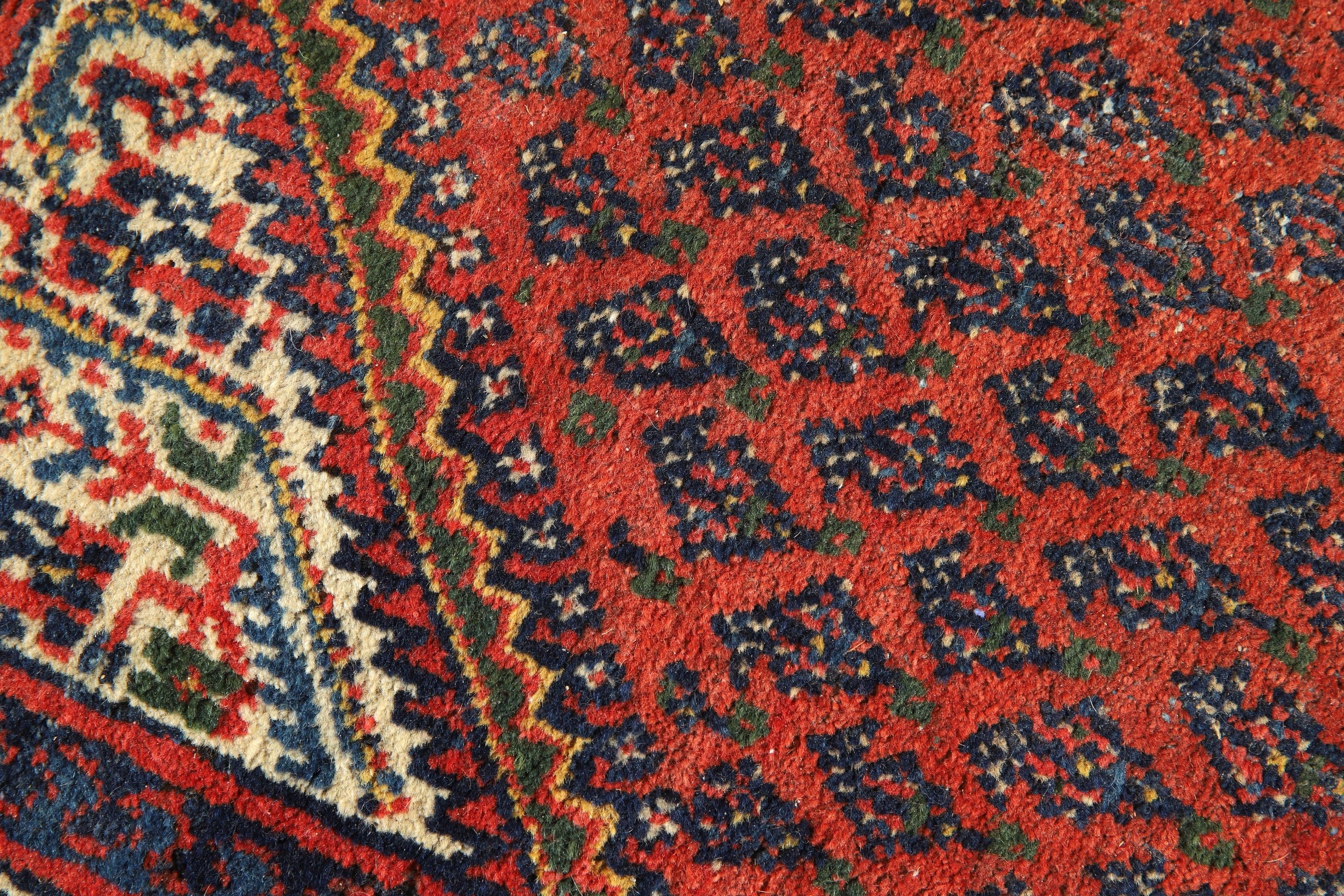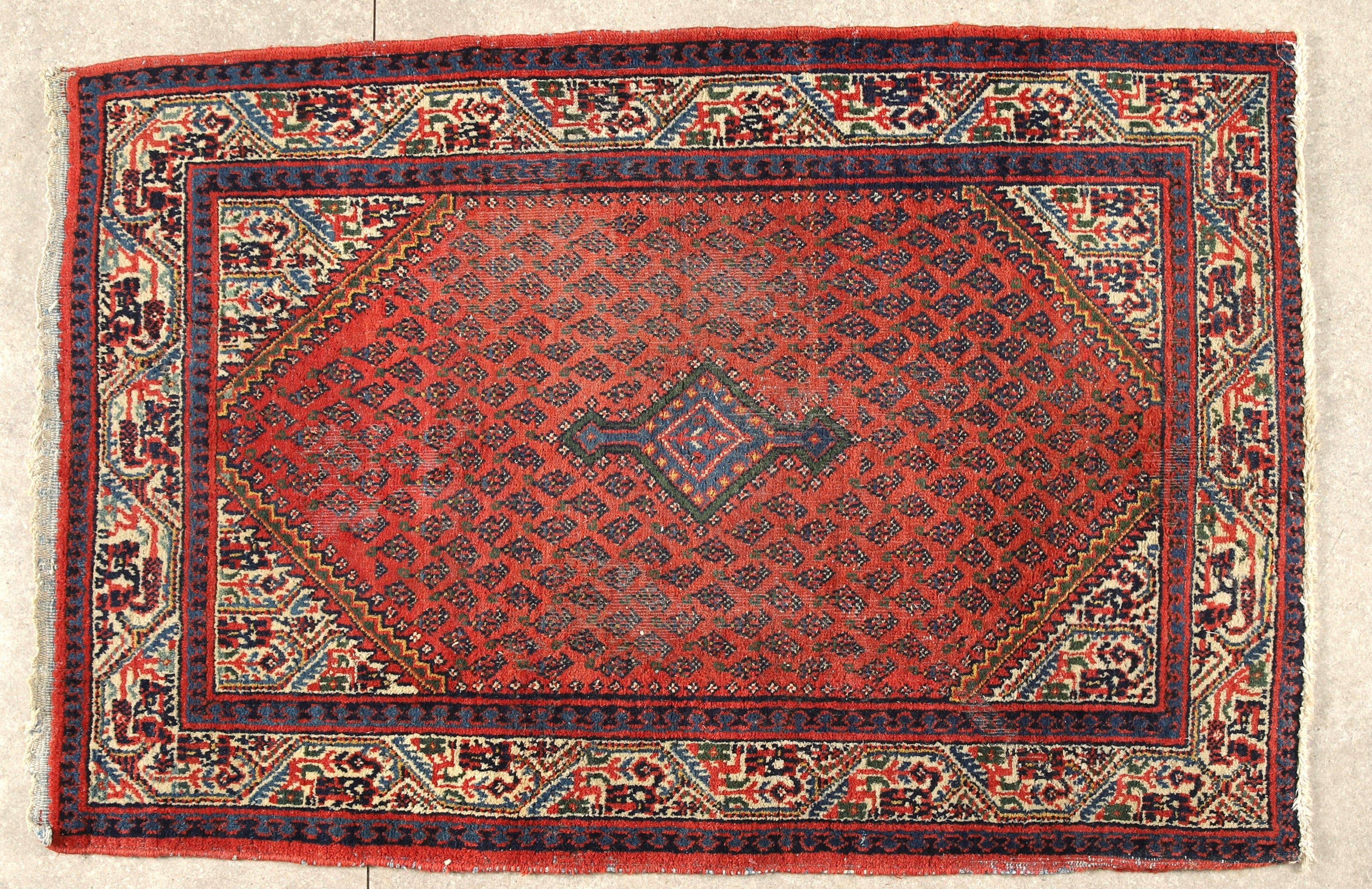 MIR SERABEND RUG (Iran) circa 1960 in wool on cotton decorated with botehs in a red medallion on a beige background (very worn). 126 x 85 cm.