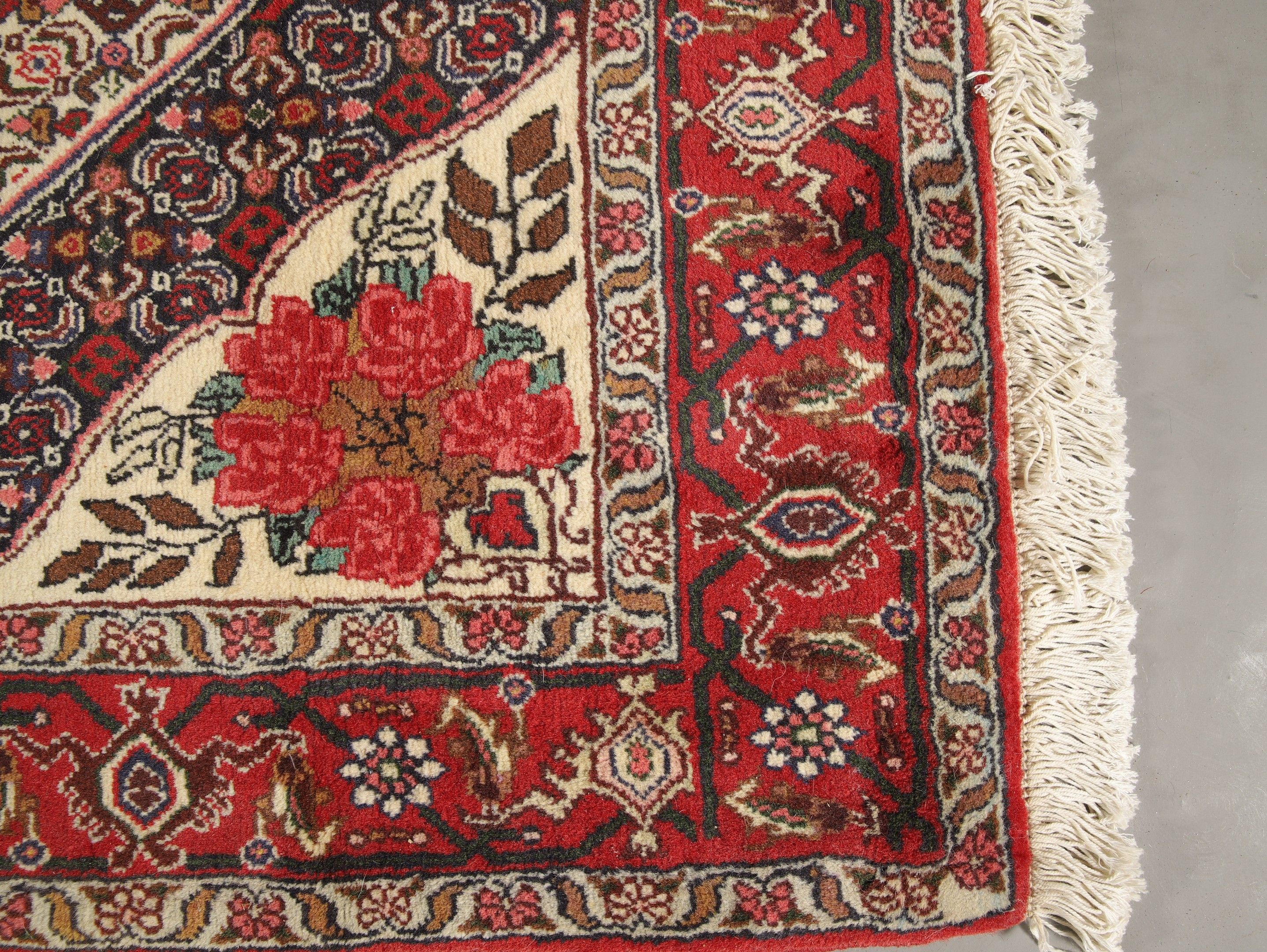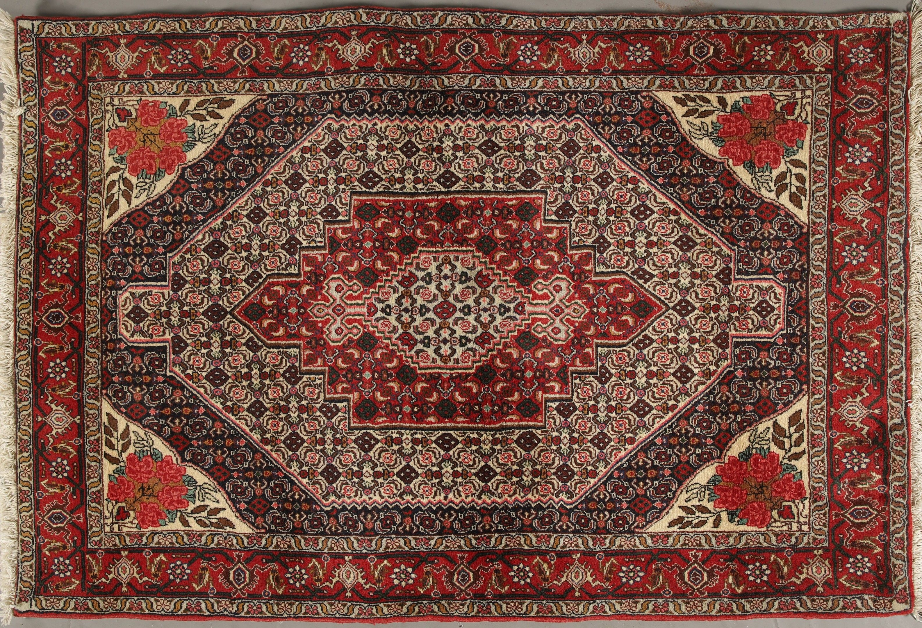 SENNEH RUG (Iran) circa 1975 1980, wool on cotton, decorated with three medallions inlaid with herati motifs, four ivory spandrels with floral bulbs 176 x 118 cm