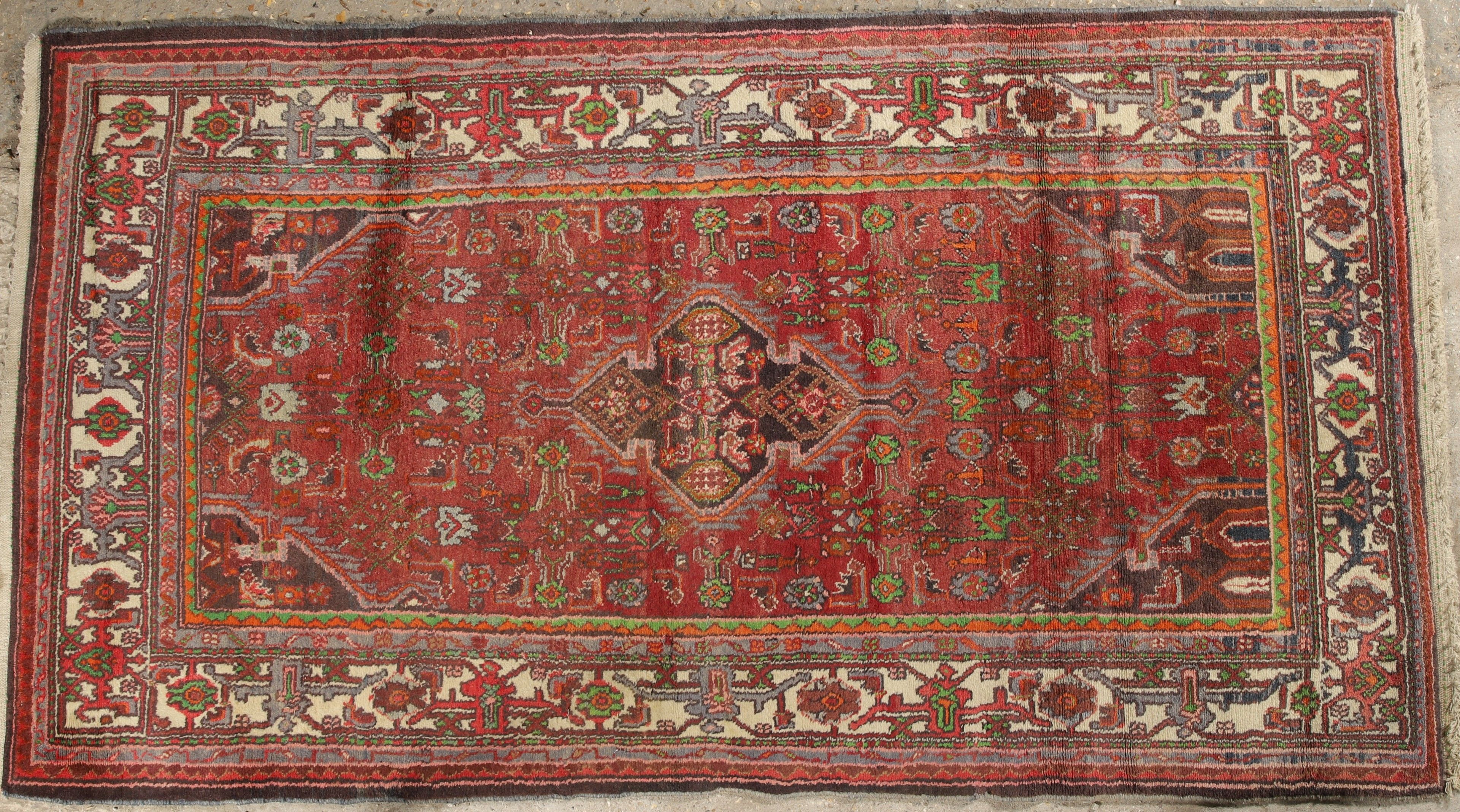 HOSSEINHANAB RUG (HAMADAN region, Iran) circa 1965-1970 wool velvet on cotton backing decorated with a central brown medallion on a red background. 230 x 130 cm
