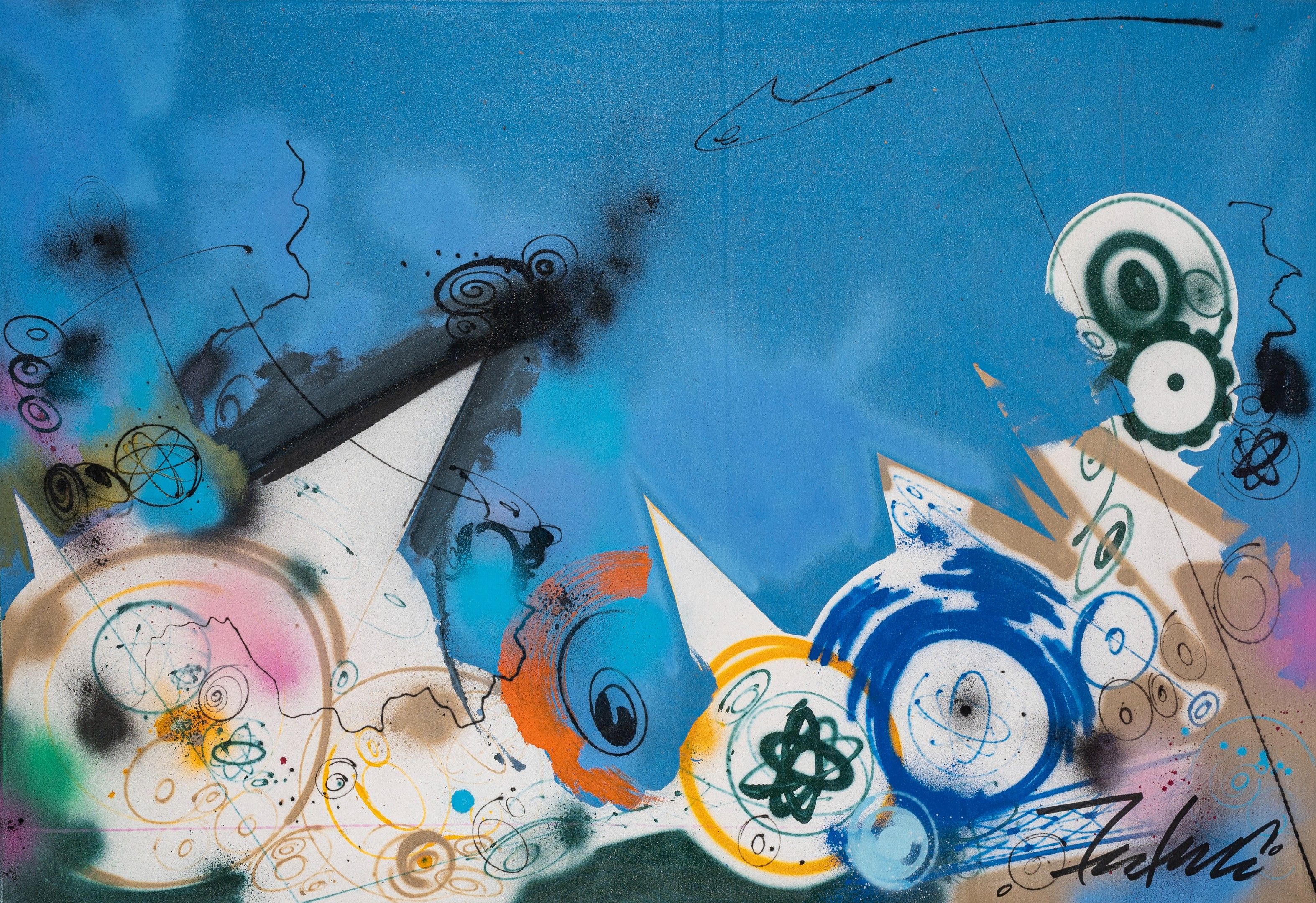 Spray paint and acrylic on canvas, signed lower right, countersigned, titled and dated on the reverse