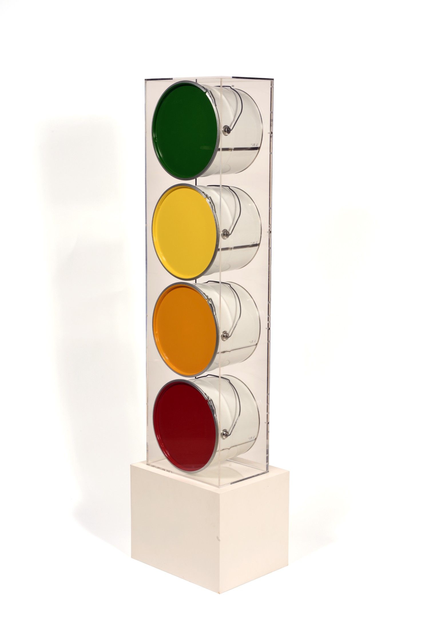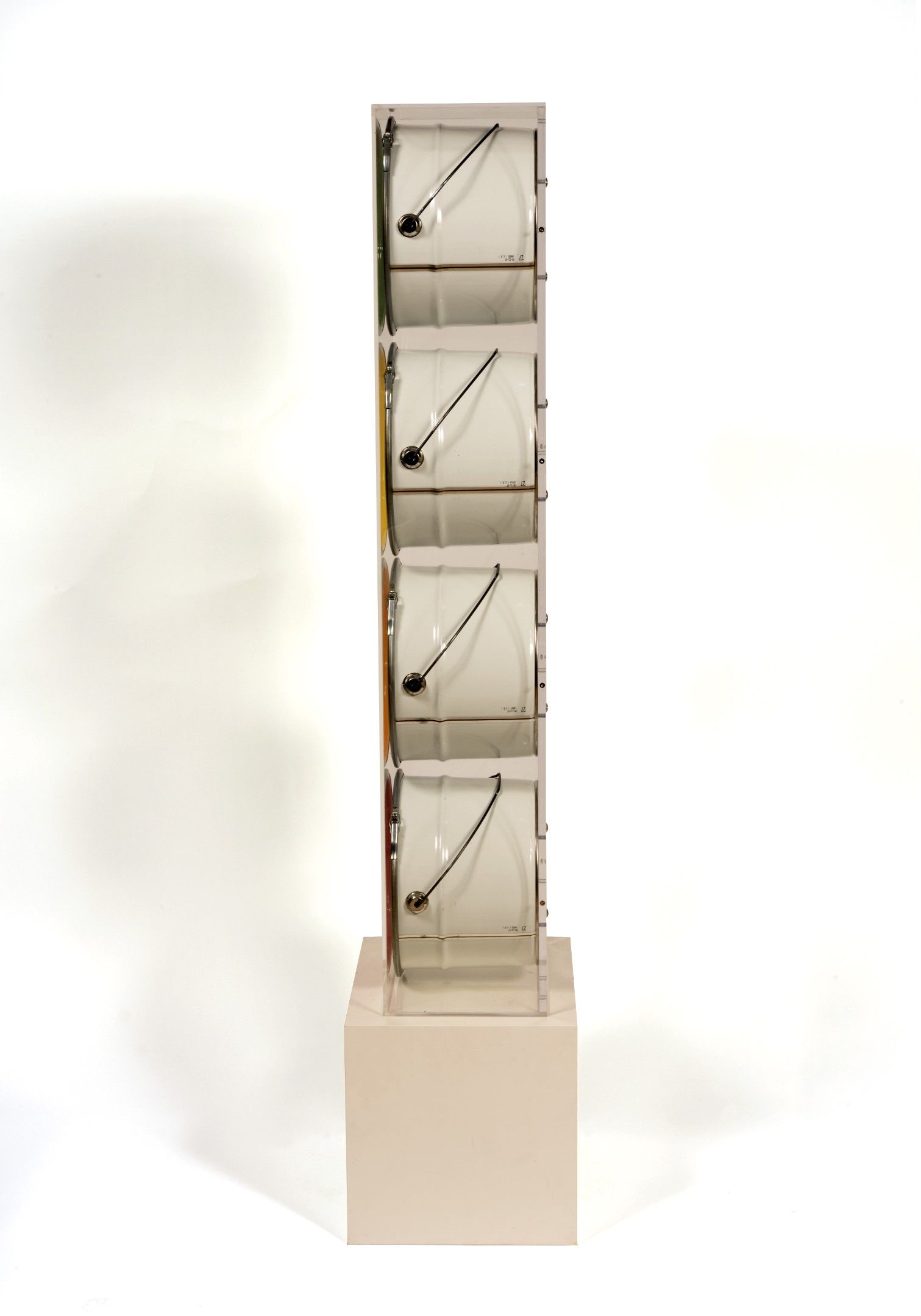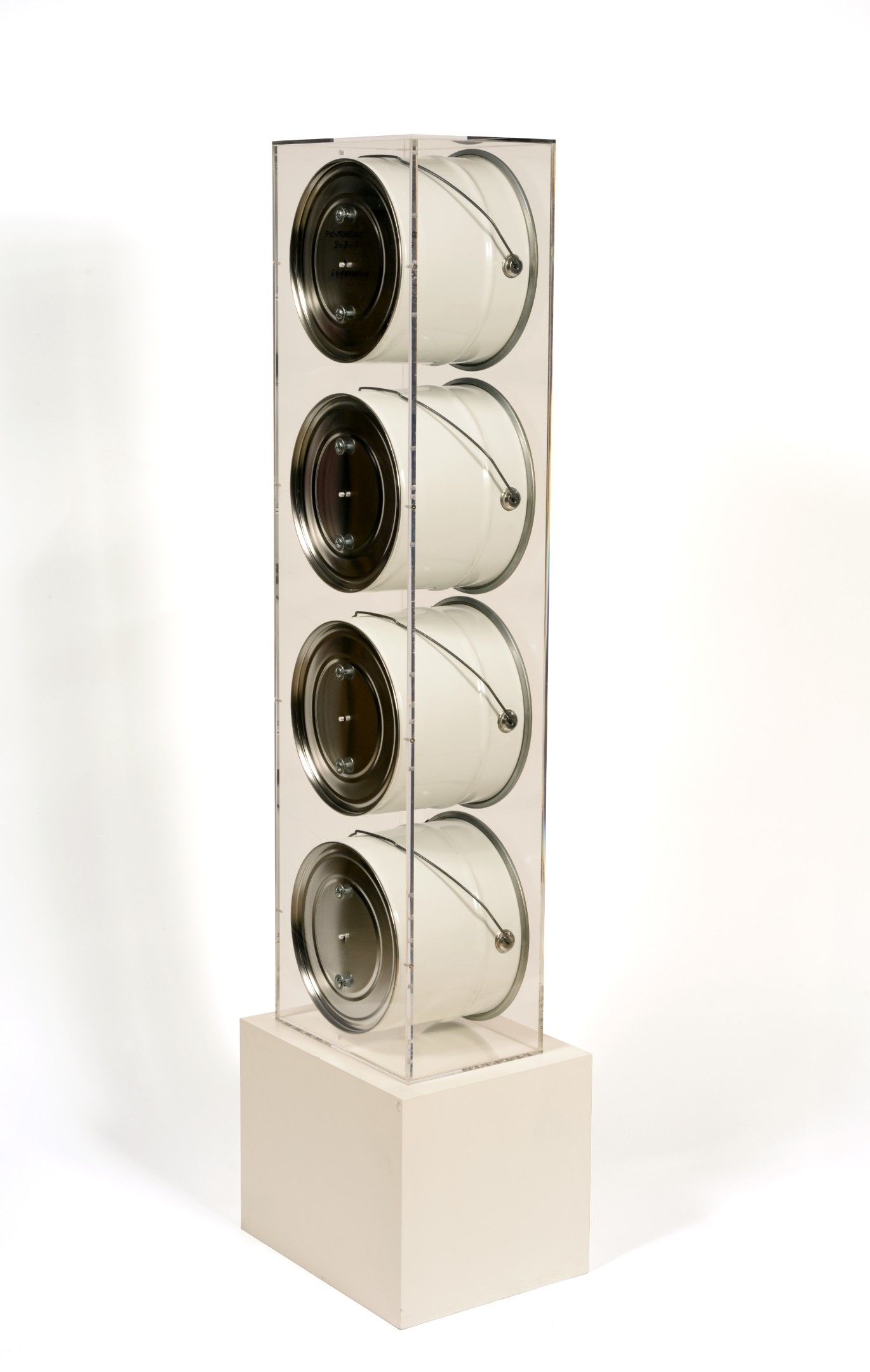 Composition of painted paint buckets, signed, dated and titled on the reverse in its plexiglas box