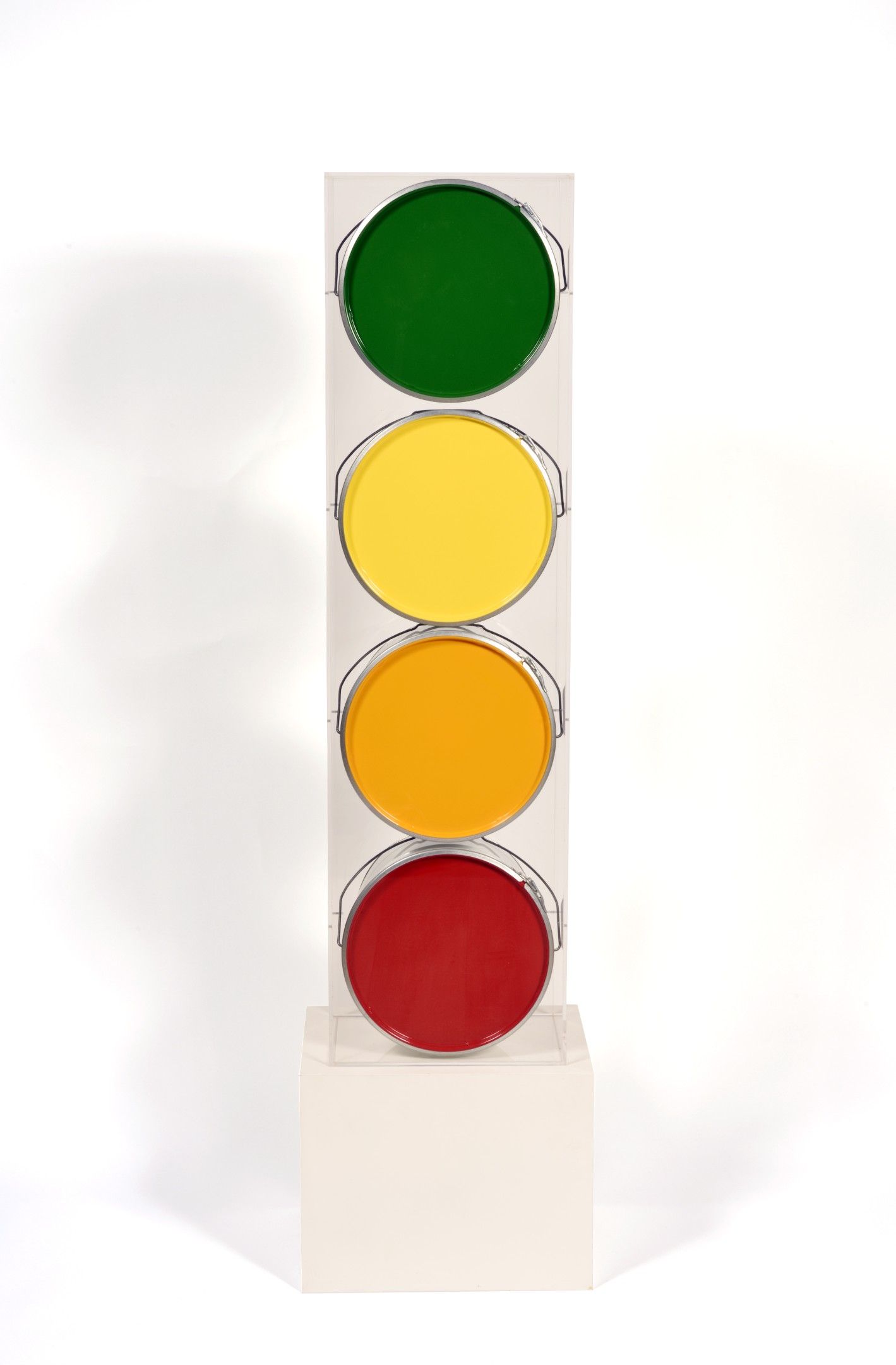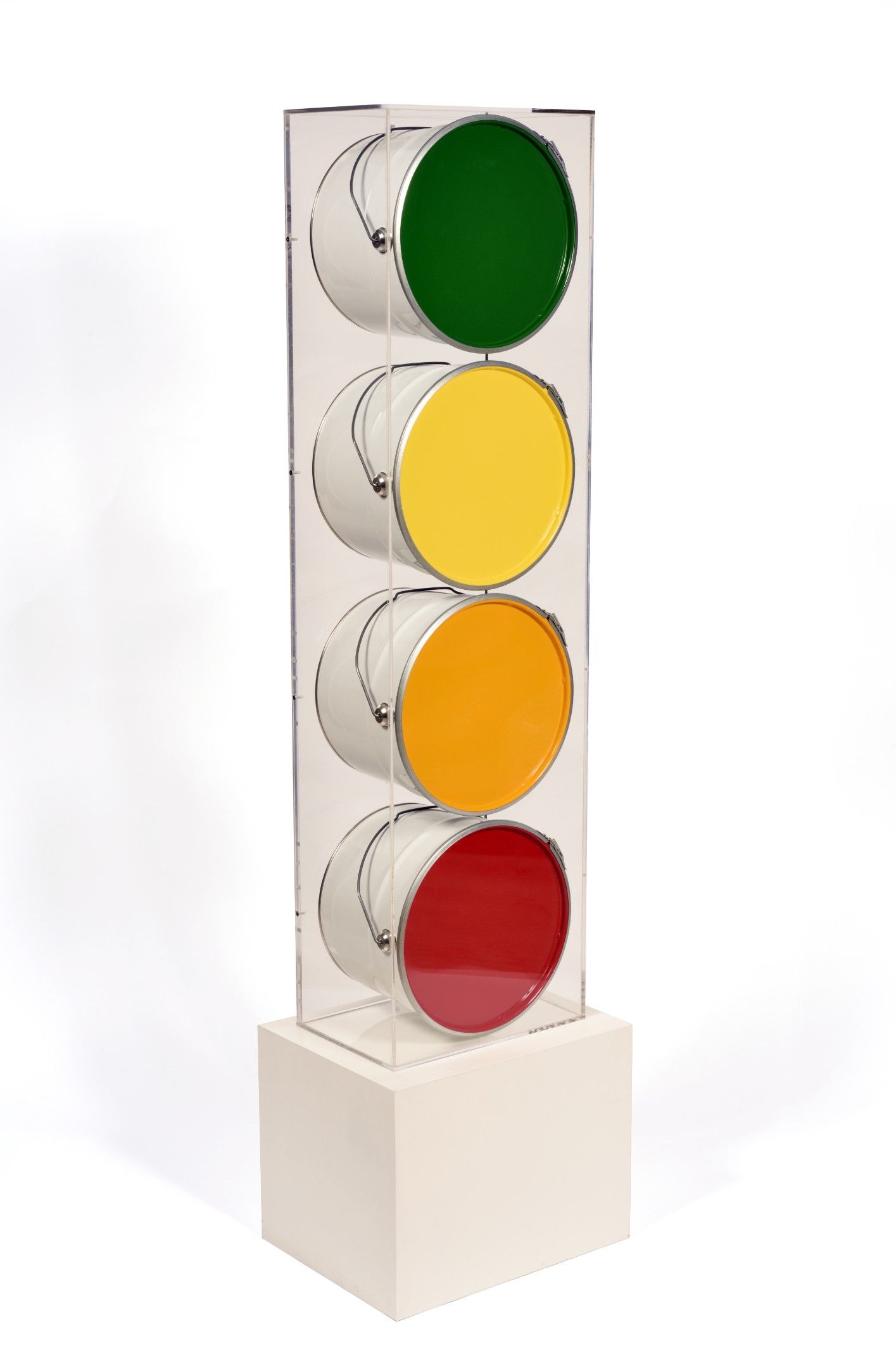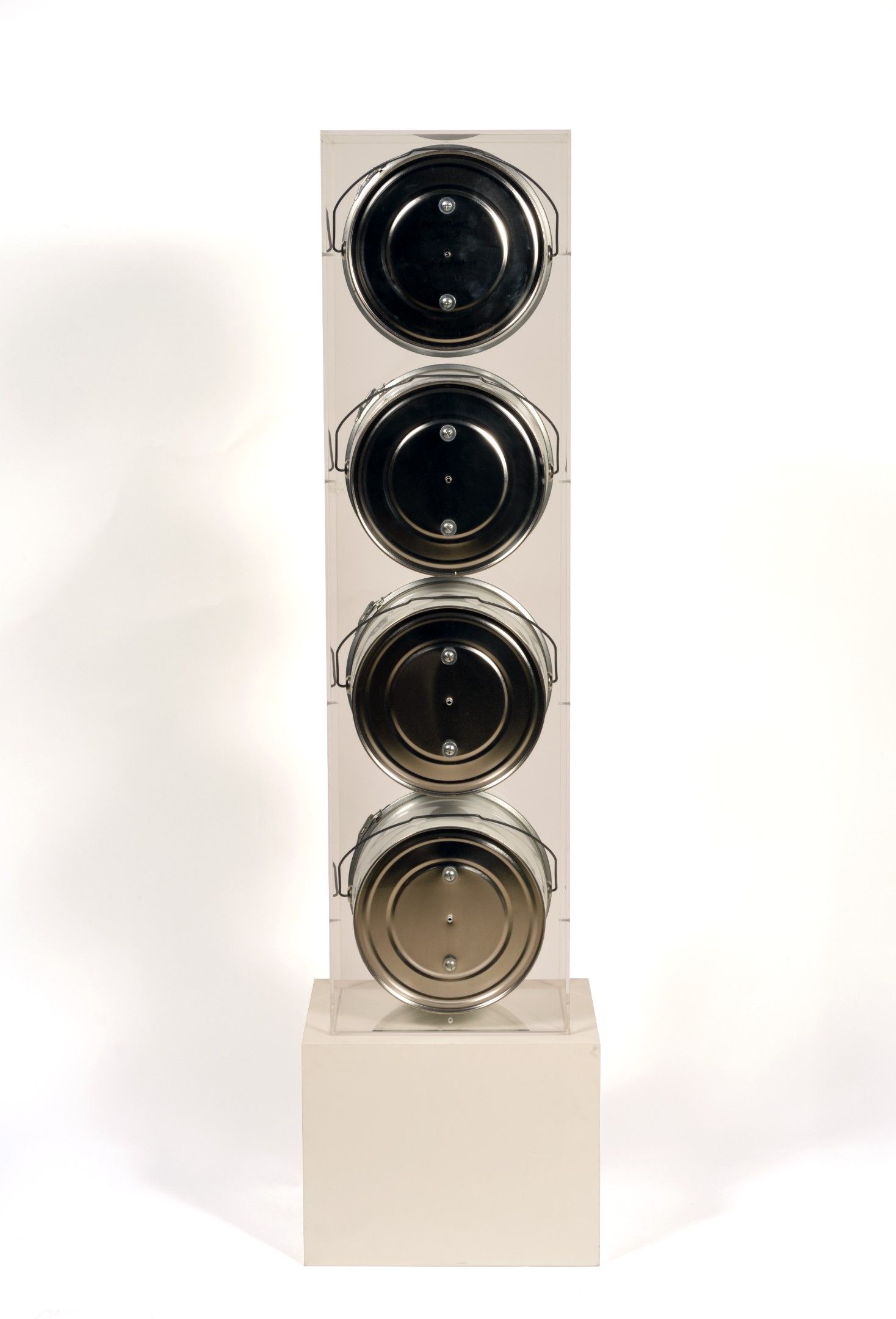 Composition of painted paint buckets, signed, dated and titled on the reverse in its plexiglas box