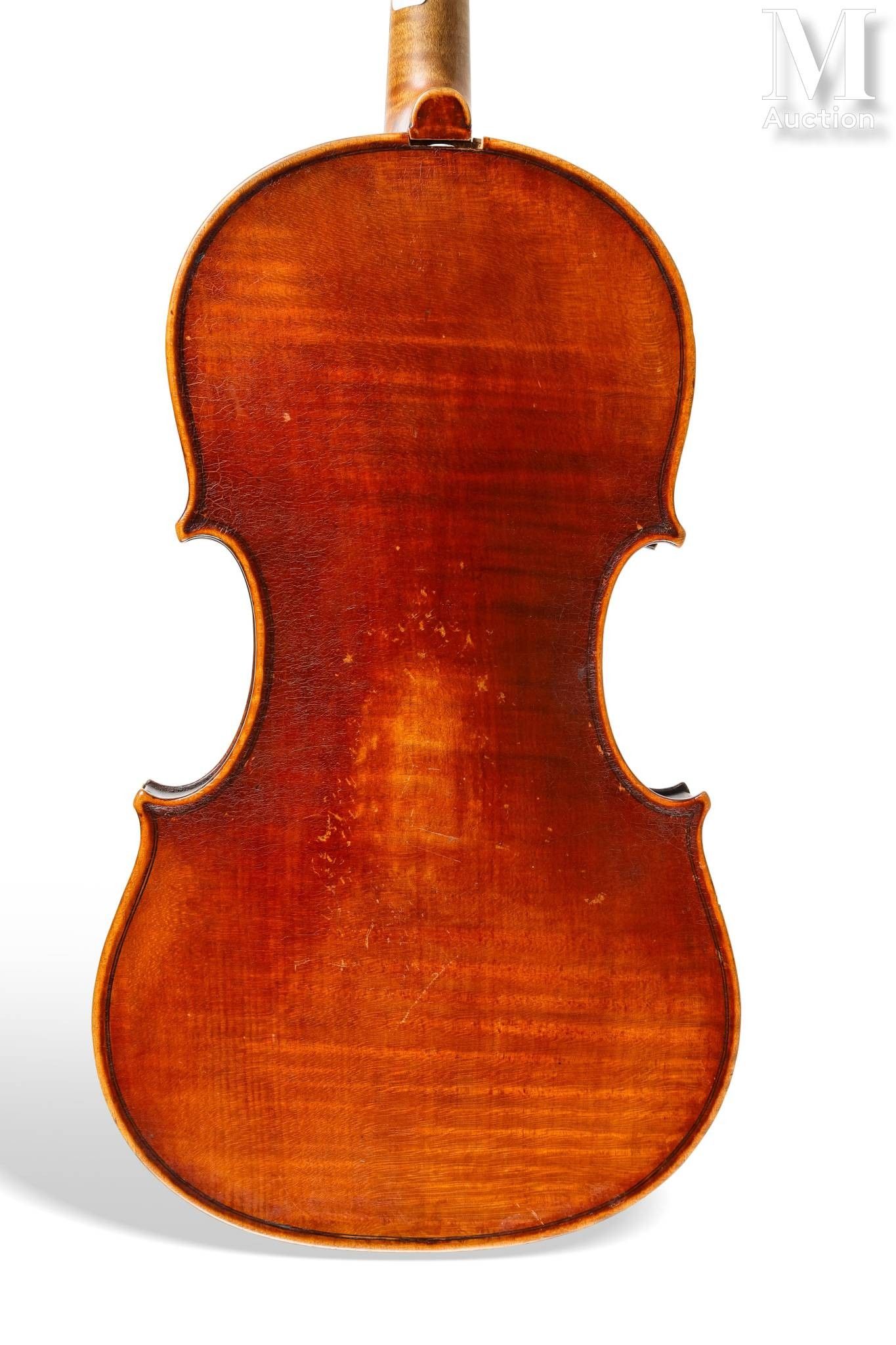 made as a copy of Guarnerius, for which it bears the label "Josef Guanerius...", one-piece maple back, spruce top with rather large pores, burgundy brown varnish on gilded ground. 373 mm.