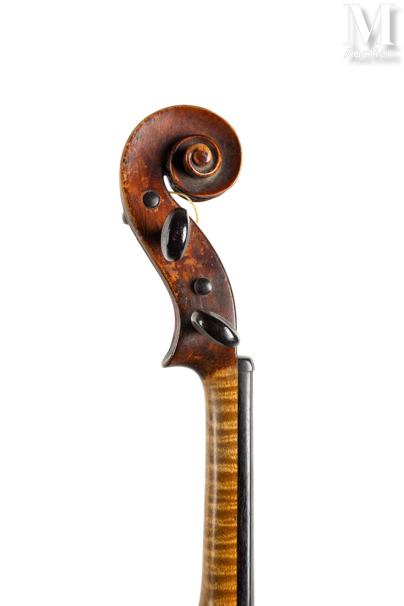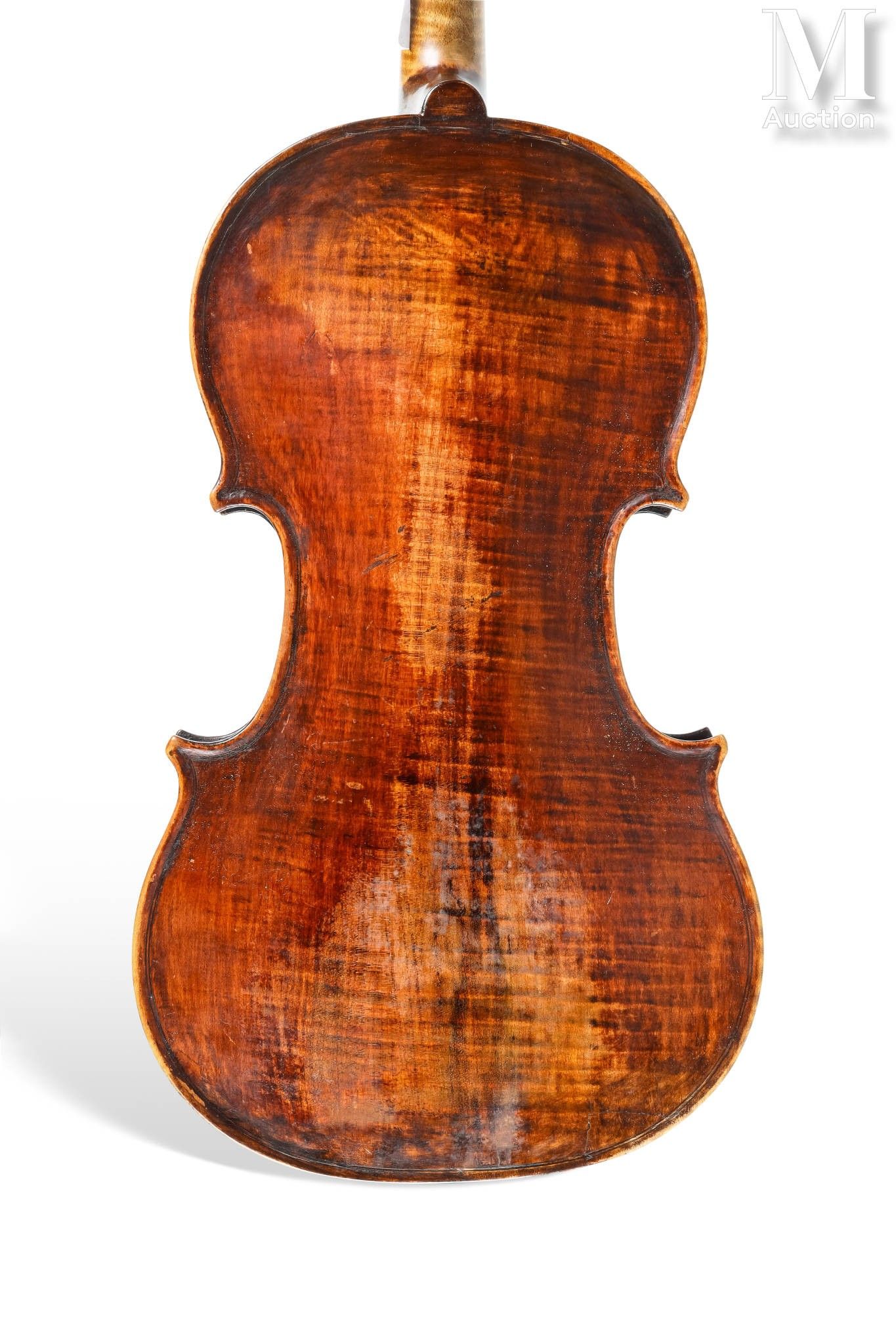 bearing a "Claude Pierray..." label, one-piece flamed maple back, spruce top with irregular pores, brown varnish over gold. 356 mm.