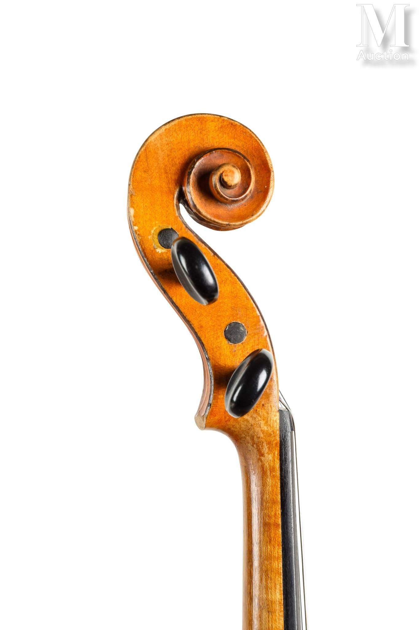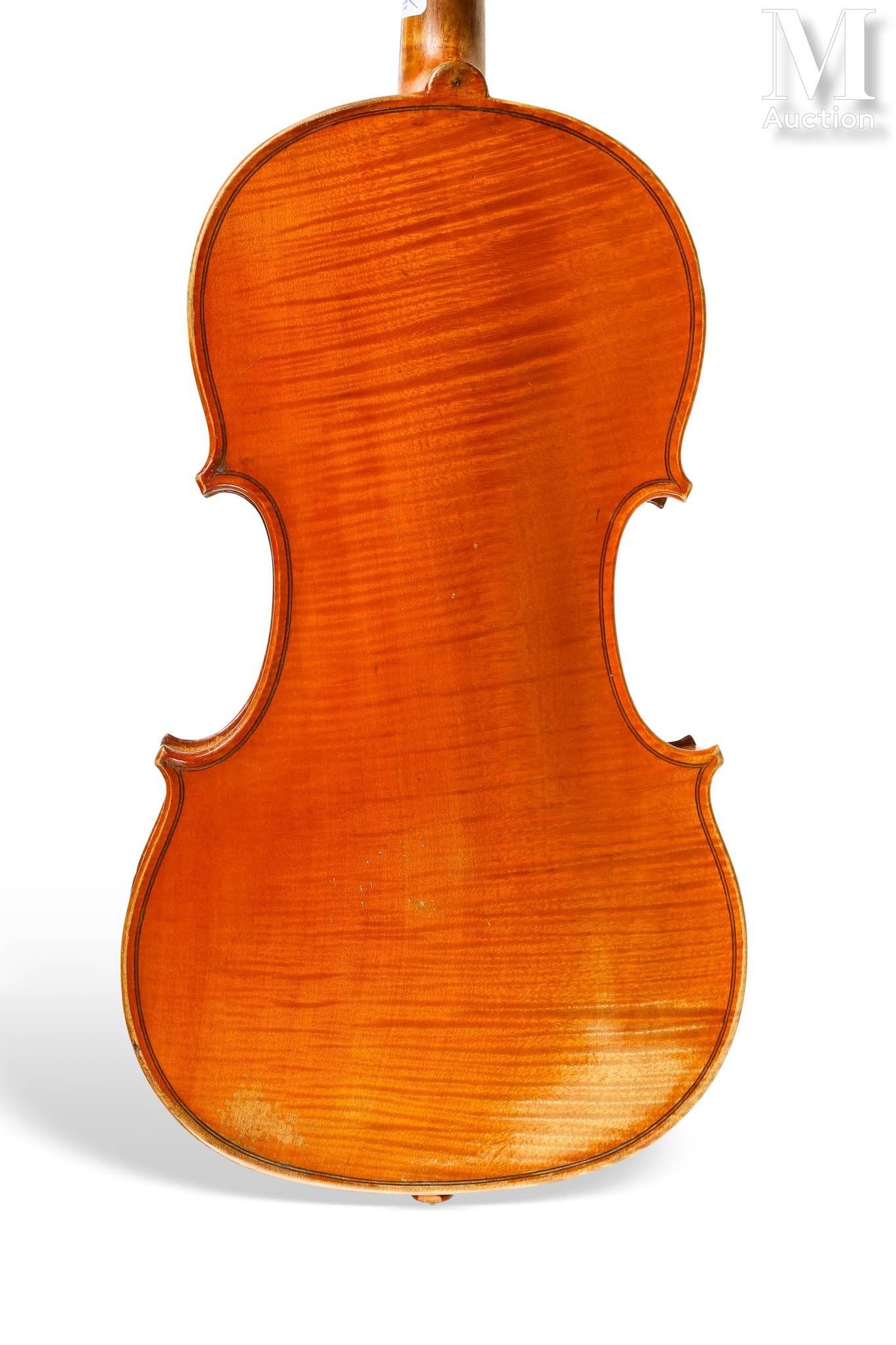 bearing the handwritten label "TIERY à Paris", one-piece maple back, spruce top with tight pores in the centre, widening at the edges. Gilded brown varnish. 361 mm.