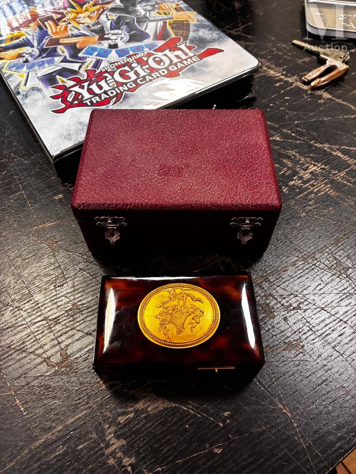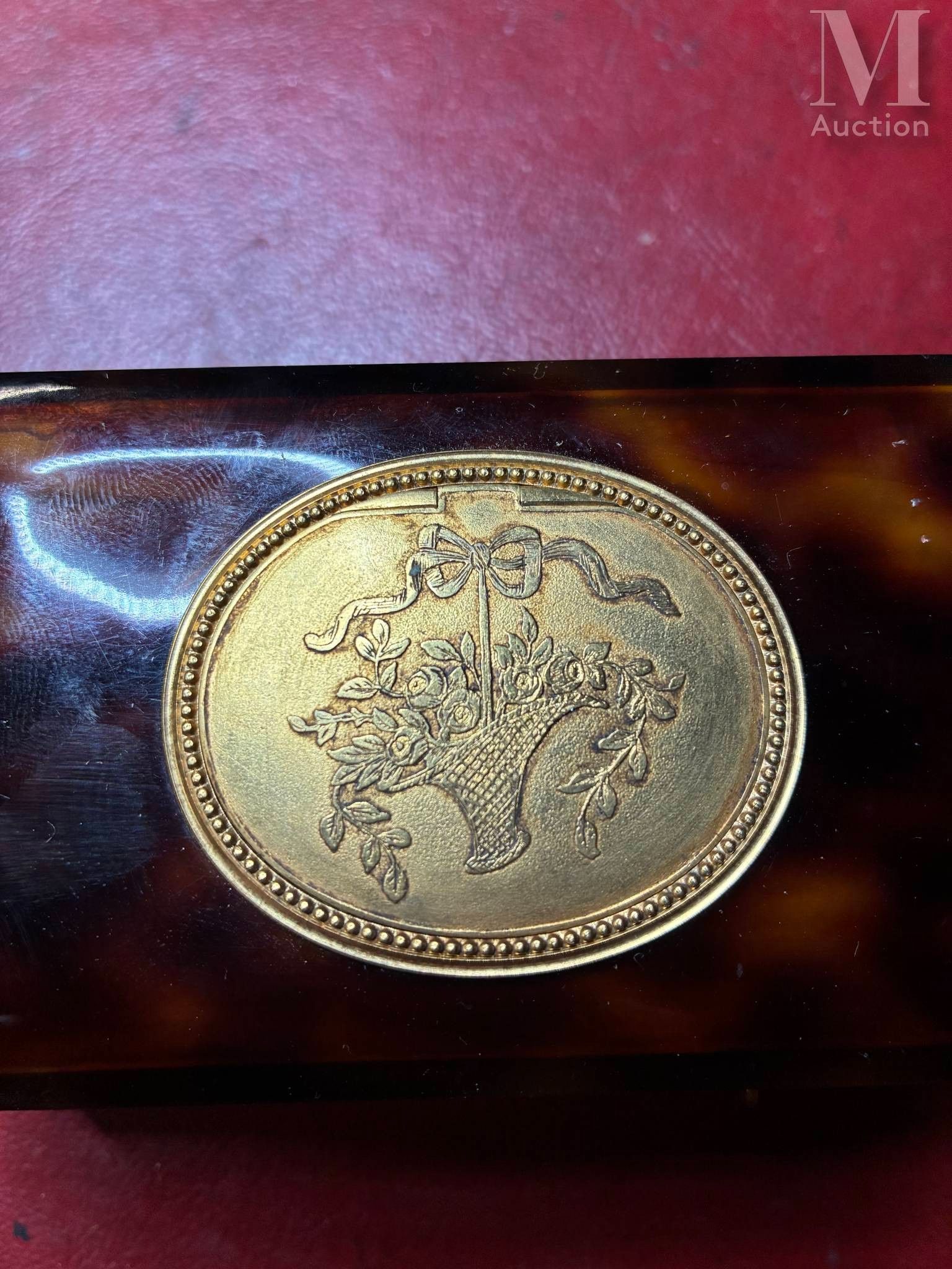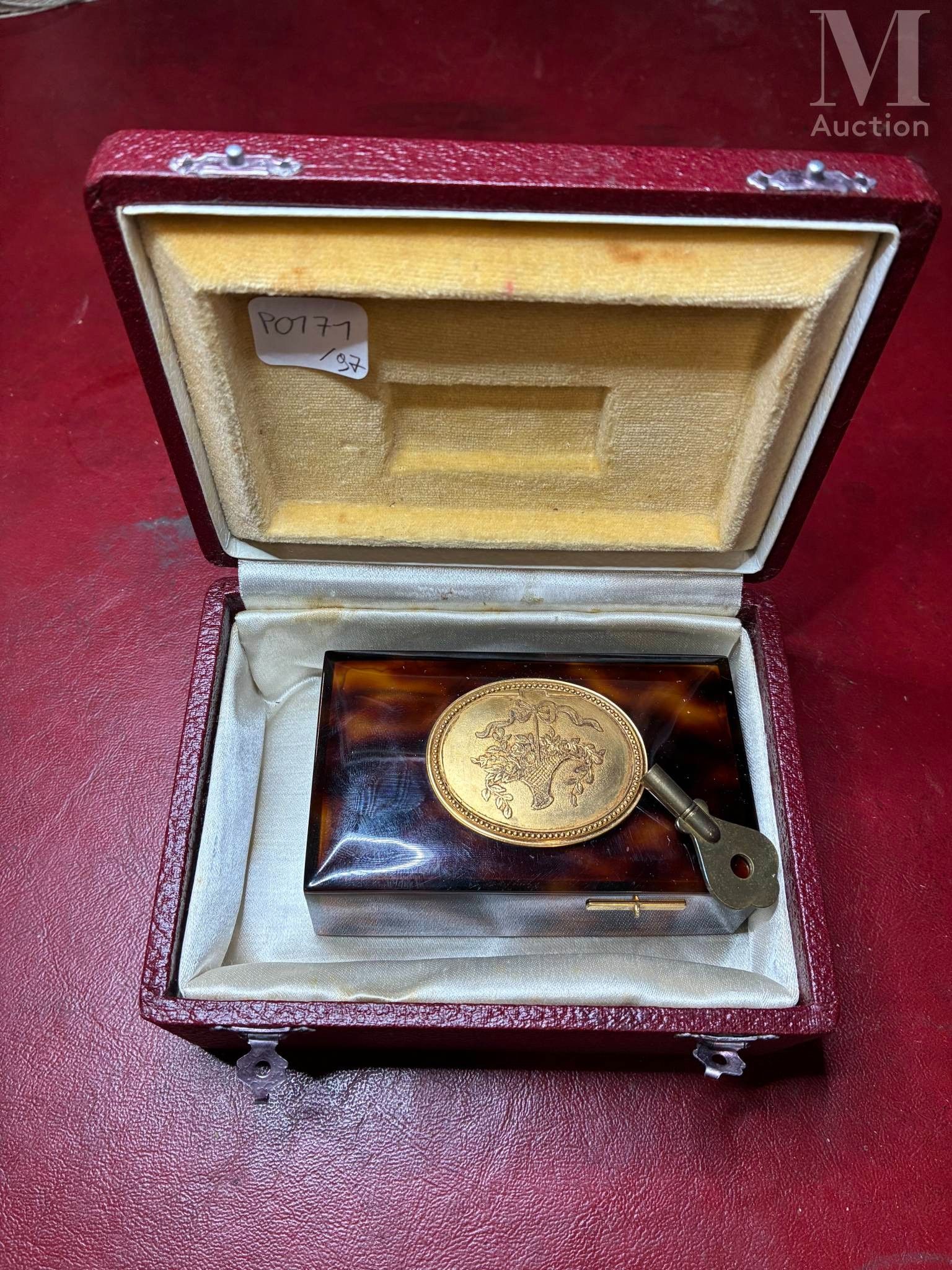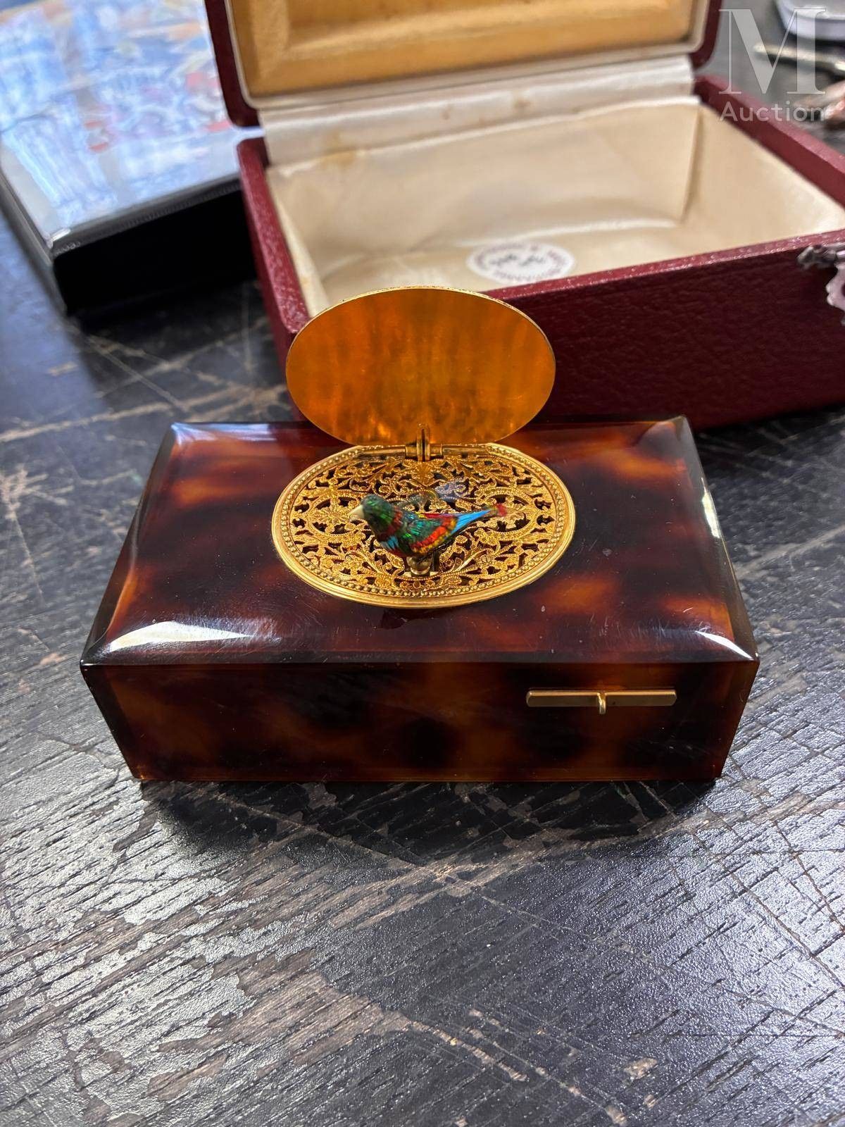 Rectangular music box. The key mechanism is operated by a pull-tab lifting the gilt metal lid engraved with a bouquet of flowers and releasing a bird with iridescent plumage (the bird is missing an eye). Box in a non-original box with key.