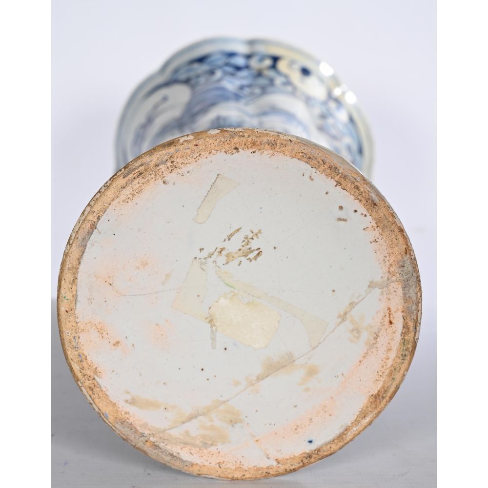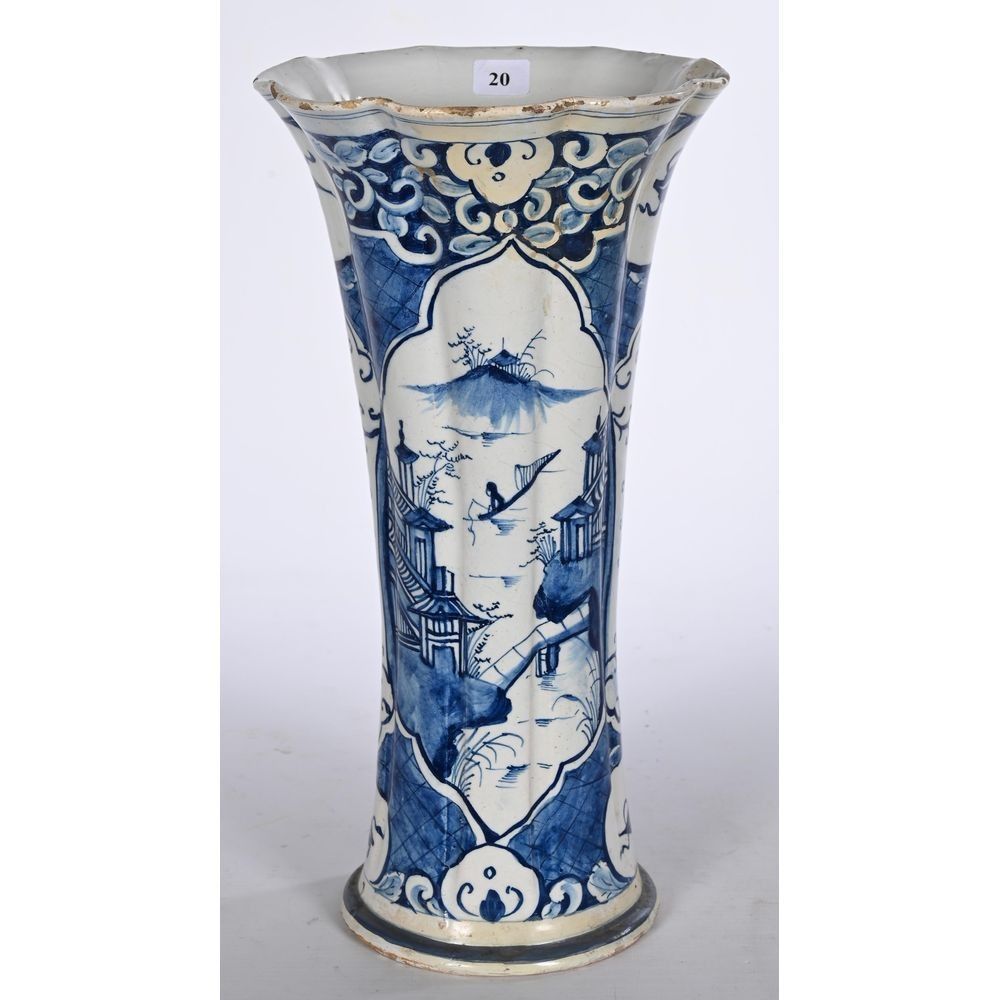 DELFT. An earthenware cone-shaped vase with pagoda and flowe…