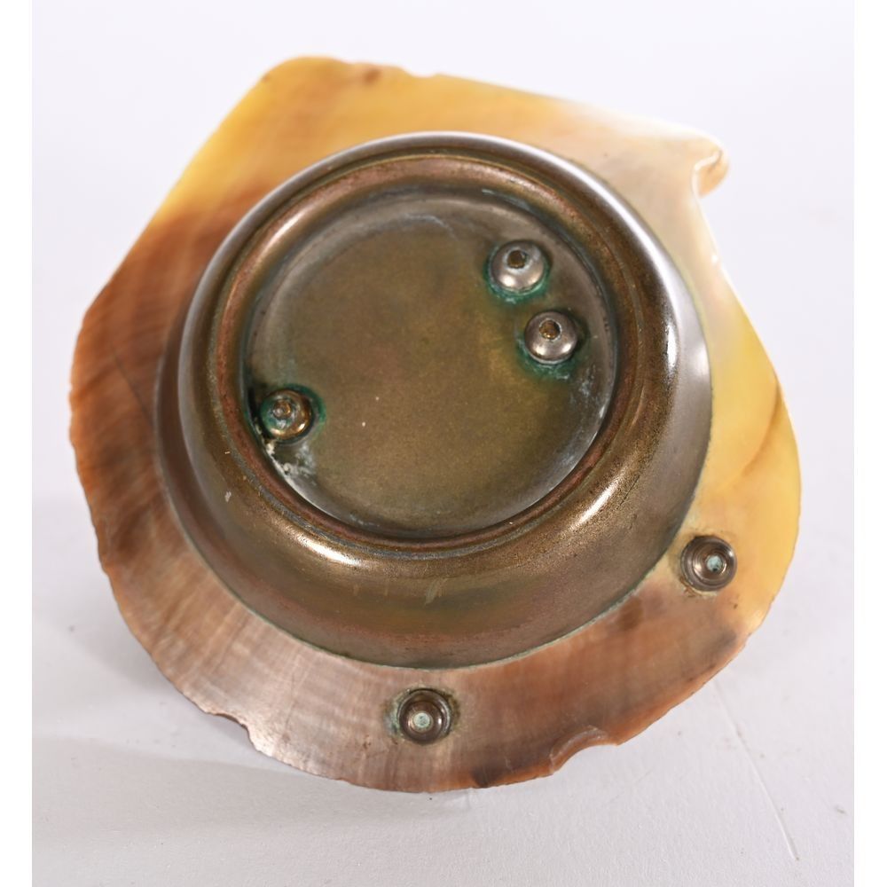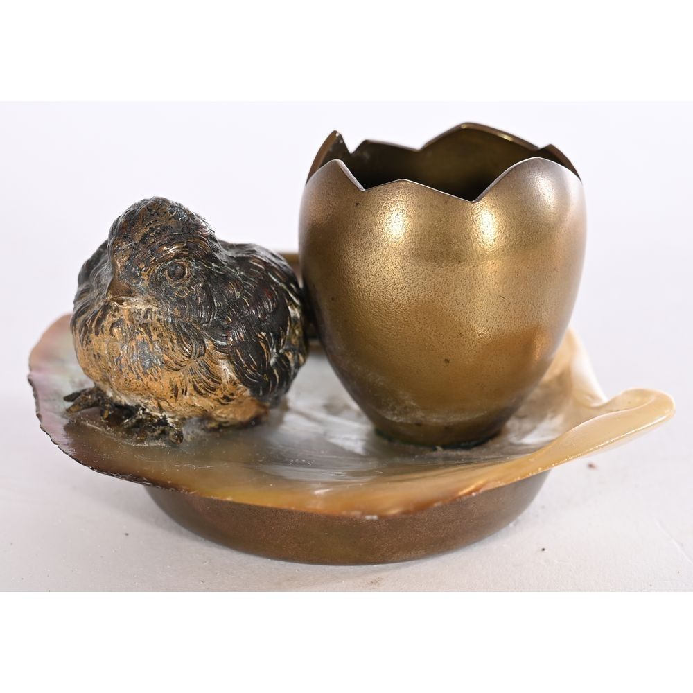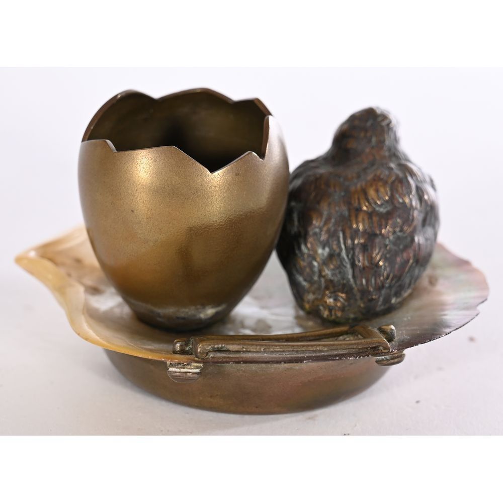 ORIGINAL VIENNA BRONZE depicting a sparrow sitting on a mother-of-pearl bowl next to a bronze egg. Circa 1900. L.8,5 H.5.