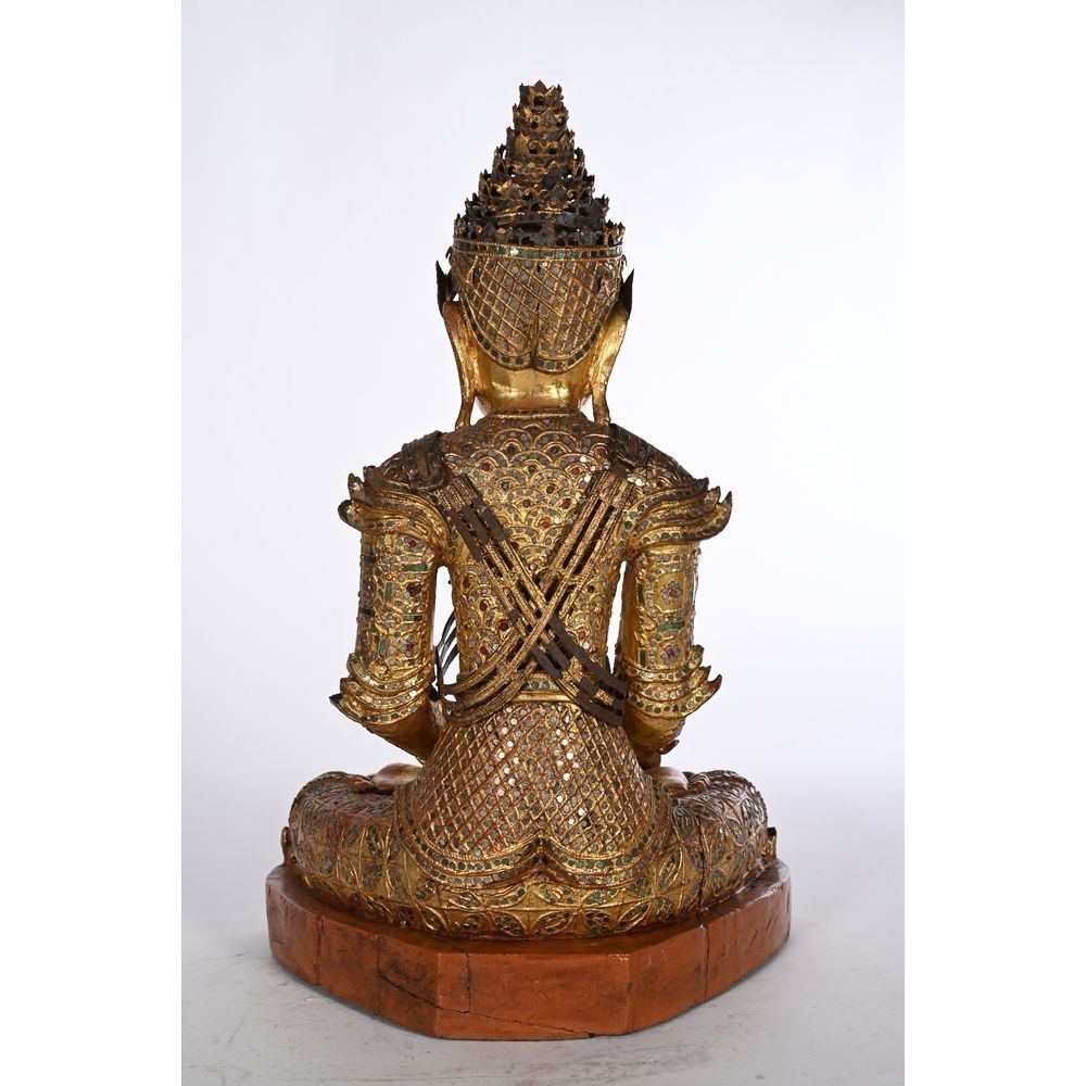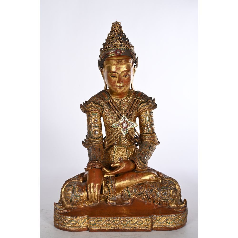 crowned buddha. He is shown seated and wearing a beautiful headdress. Wood carved and gilded with gold leaf, lacquer and coloured glass inlays. Burmese work, late 19th century. H.53 W.35 D.27.