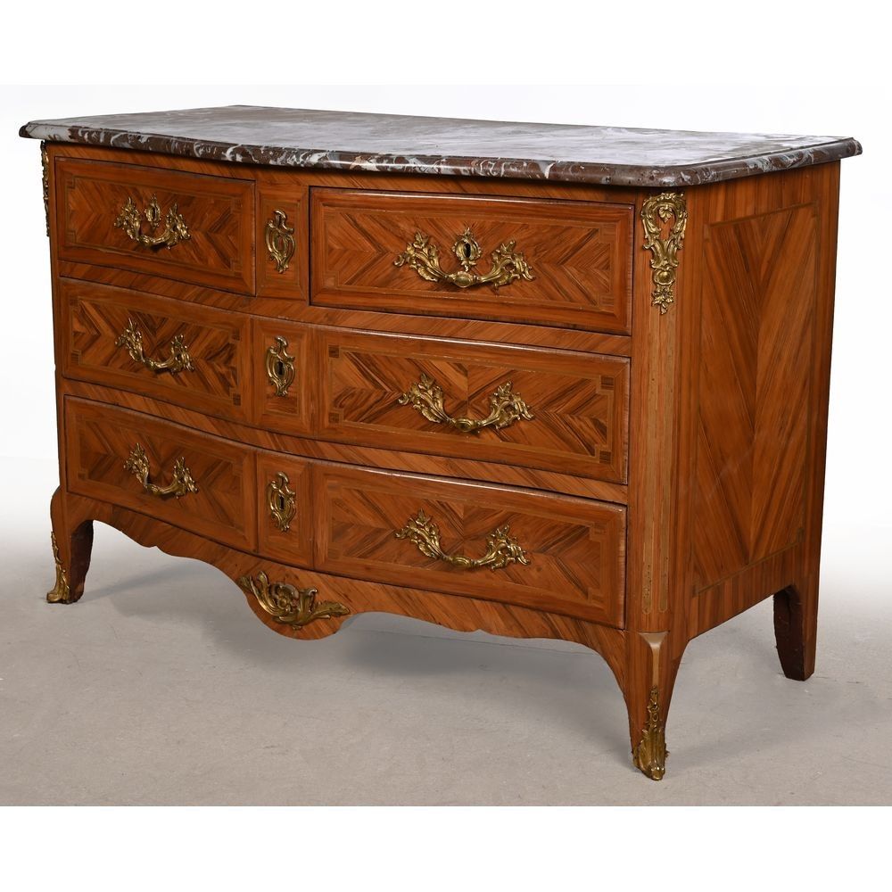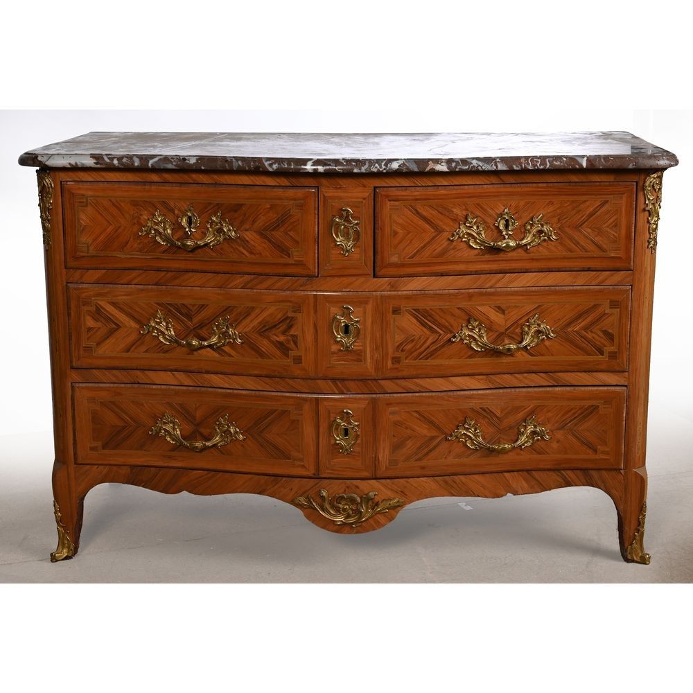 SCHLICHTIG. REGENCE COMMODE with slightly curved front opening with 4 drawers in 3 rows. Rounded jambs. Marble top (glued back). Stamped. 18th century. H.85 W.130 D.63.