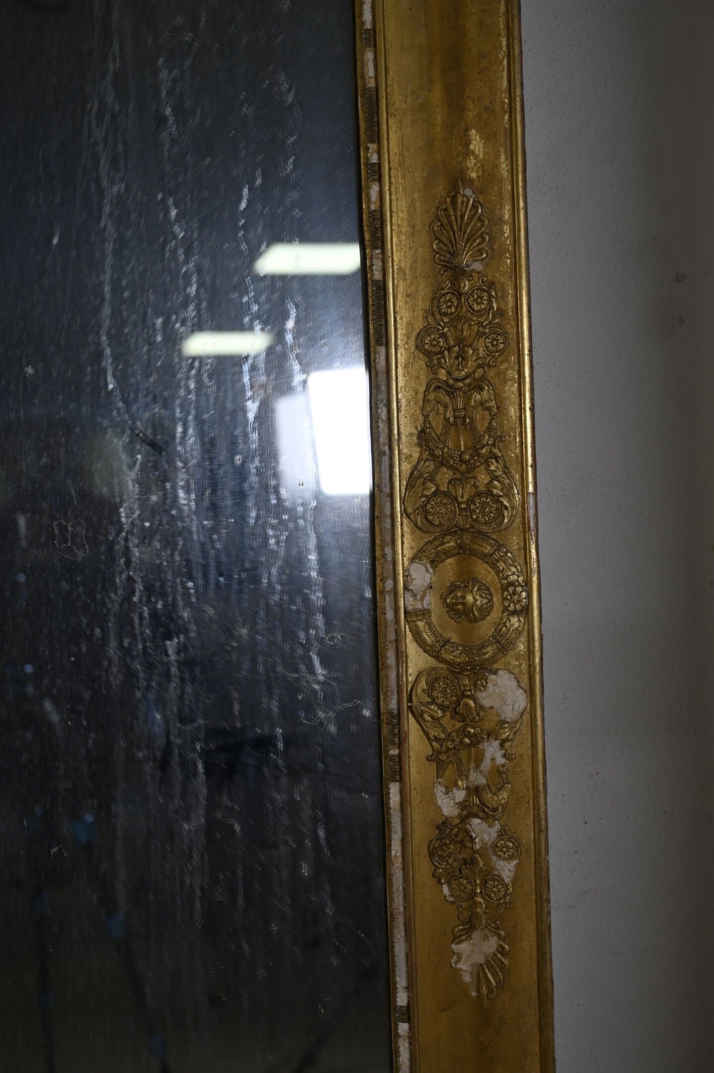 Large wooden and gilded plaster mirror decorated with caducei, palmettes, mascarons and goats' heads