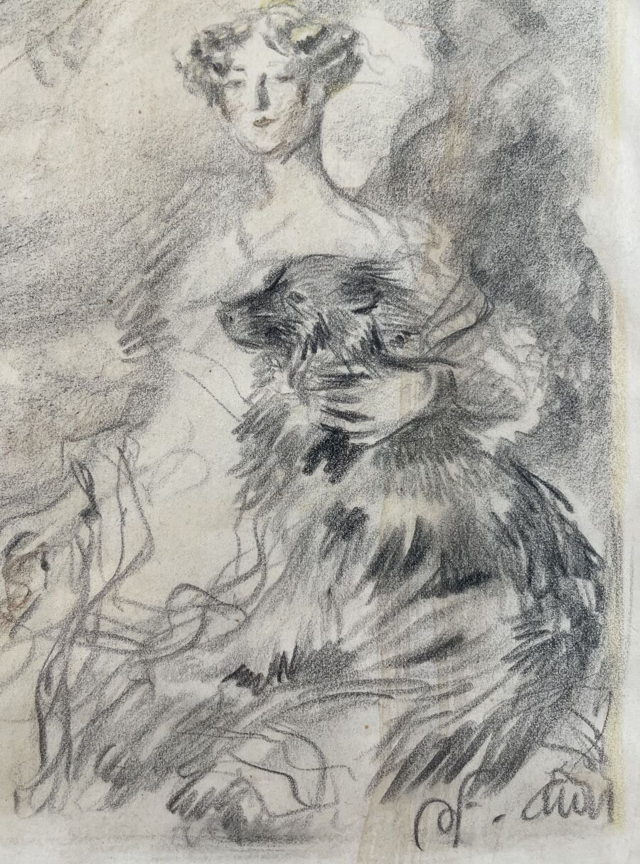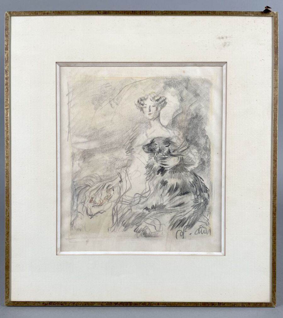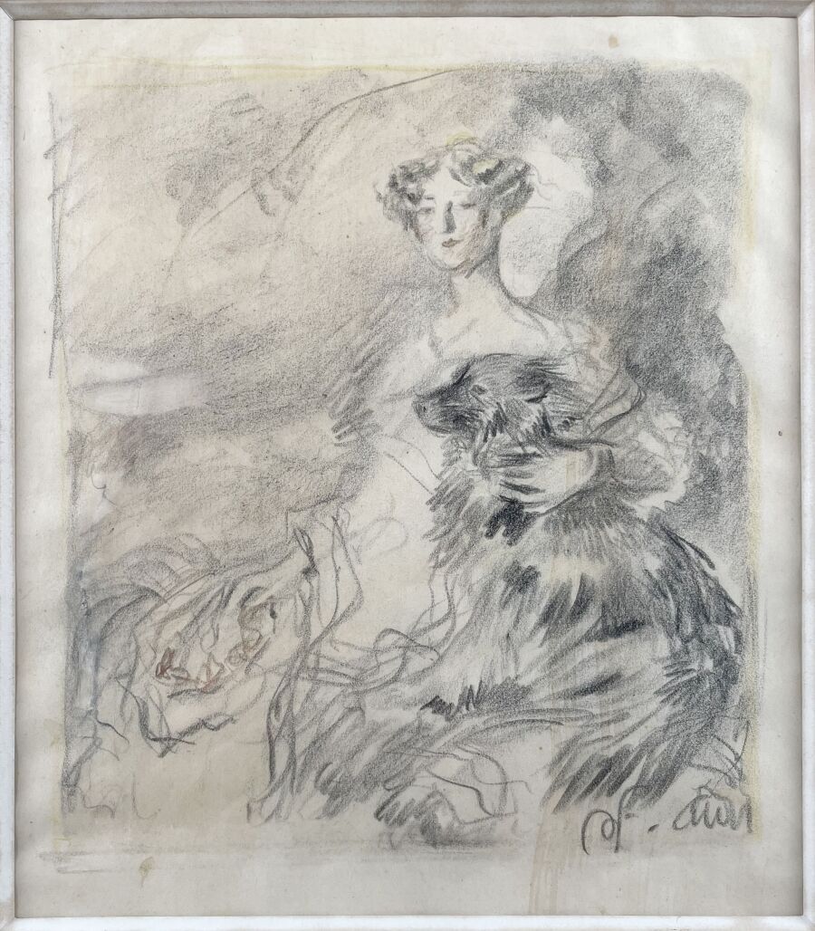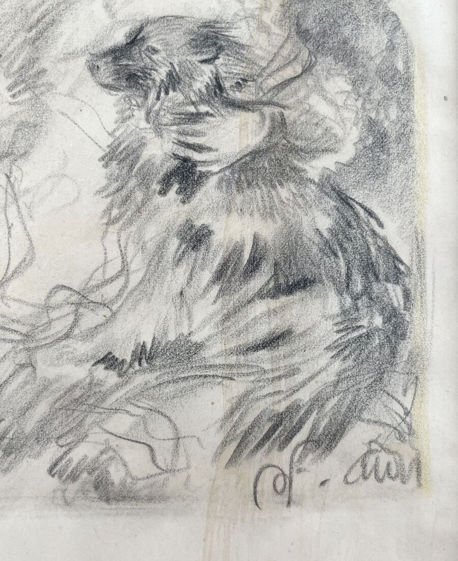Charcoal and stump drawing, bears an unidentified monogram lower right; framed, under glass.