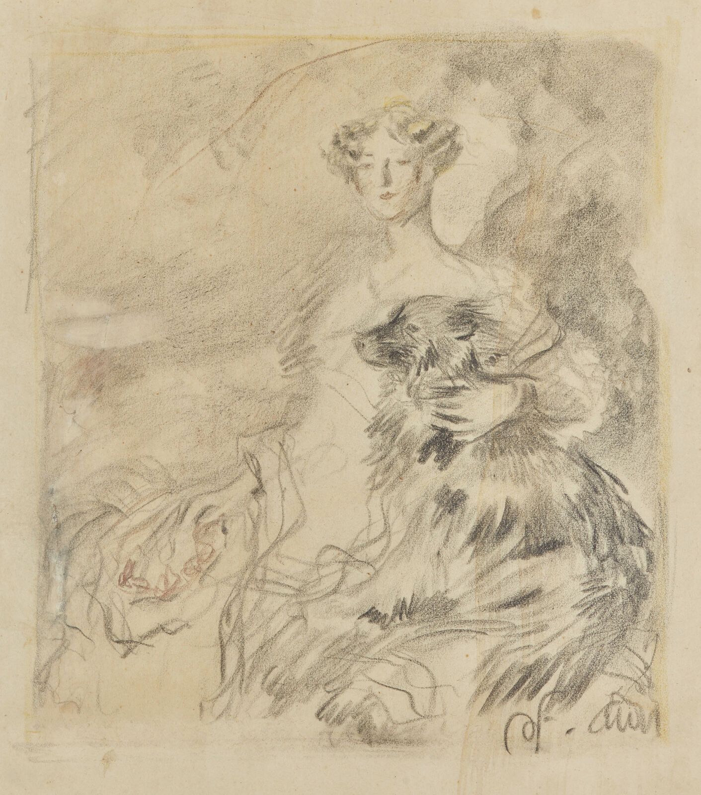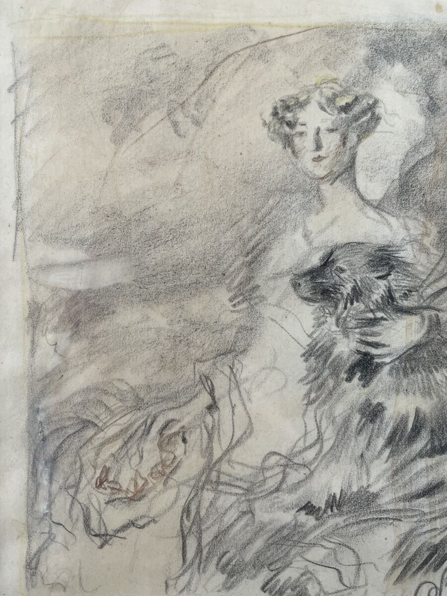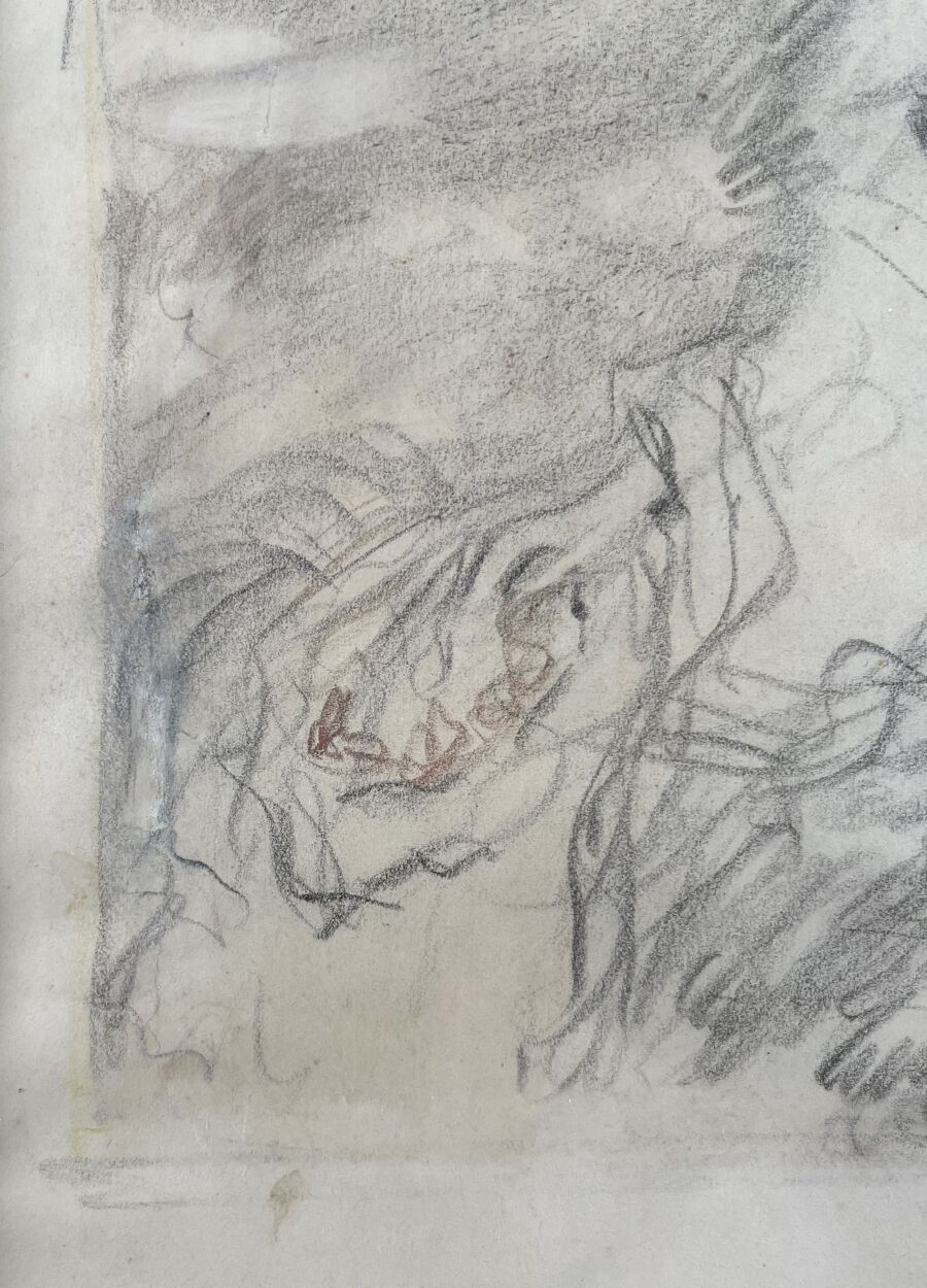 Charcoal and stump drawing, bears an unidentified monogram lower right; framed, under glass.