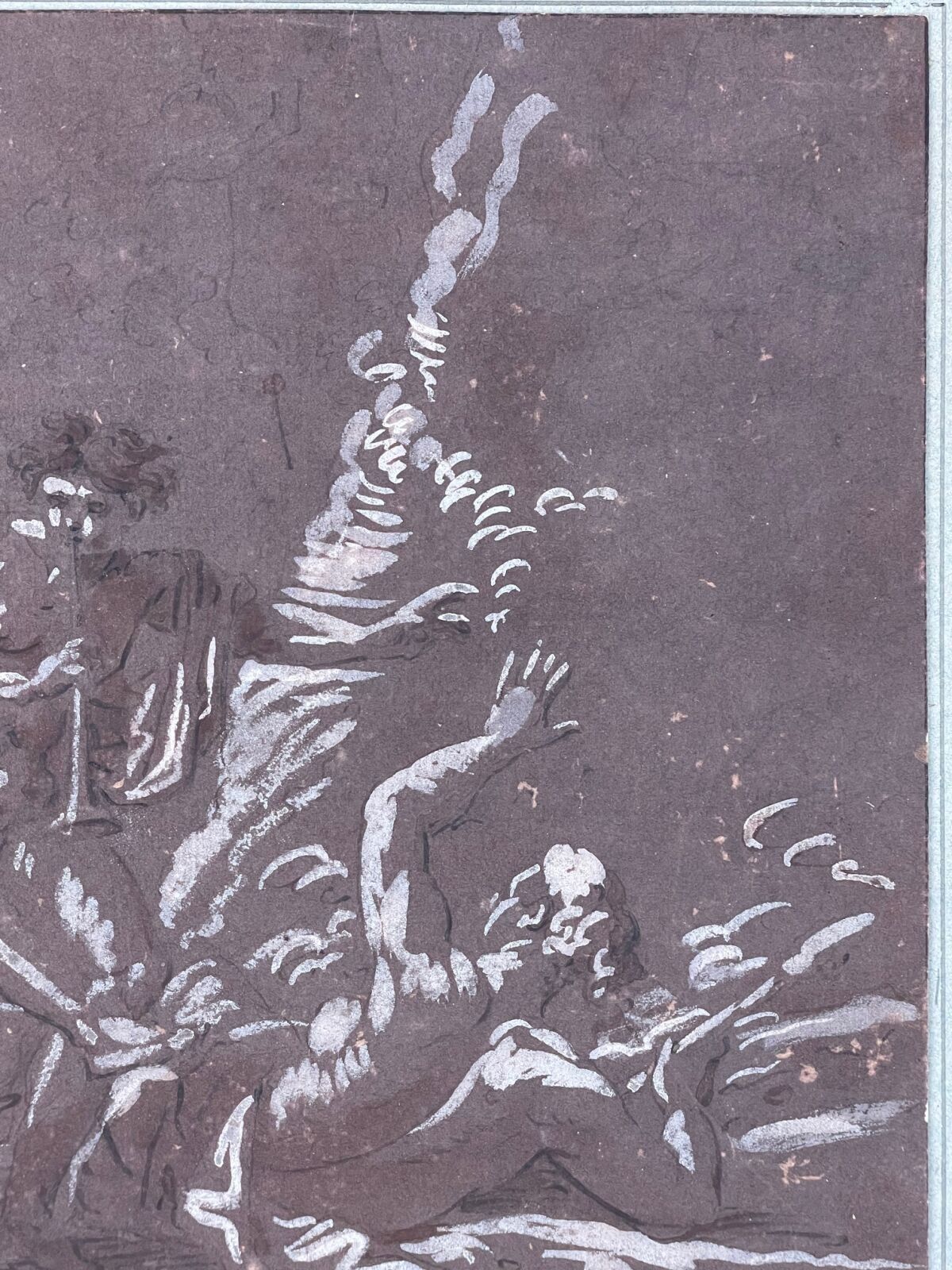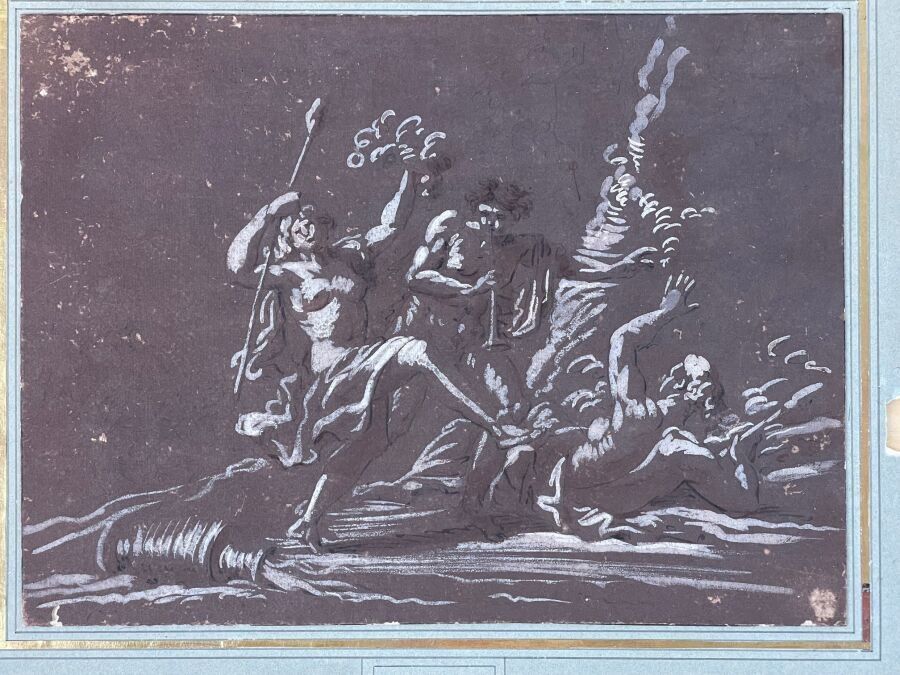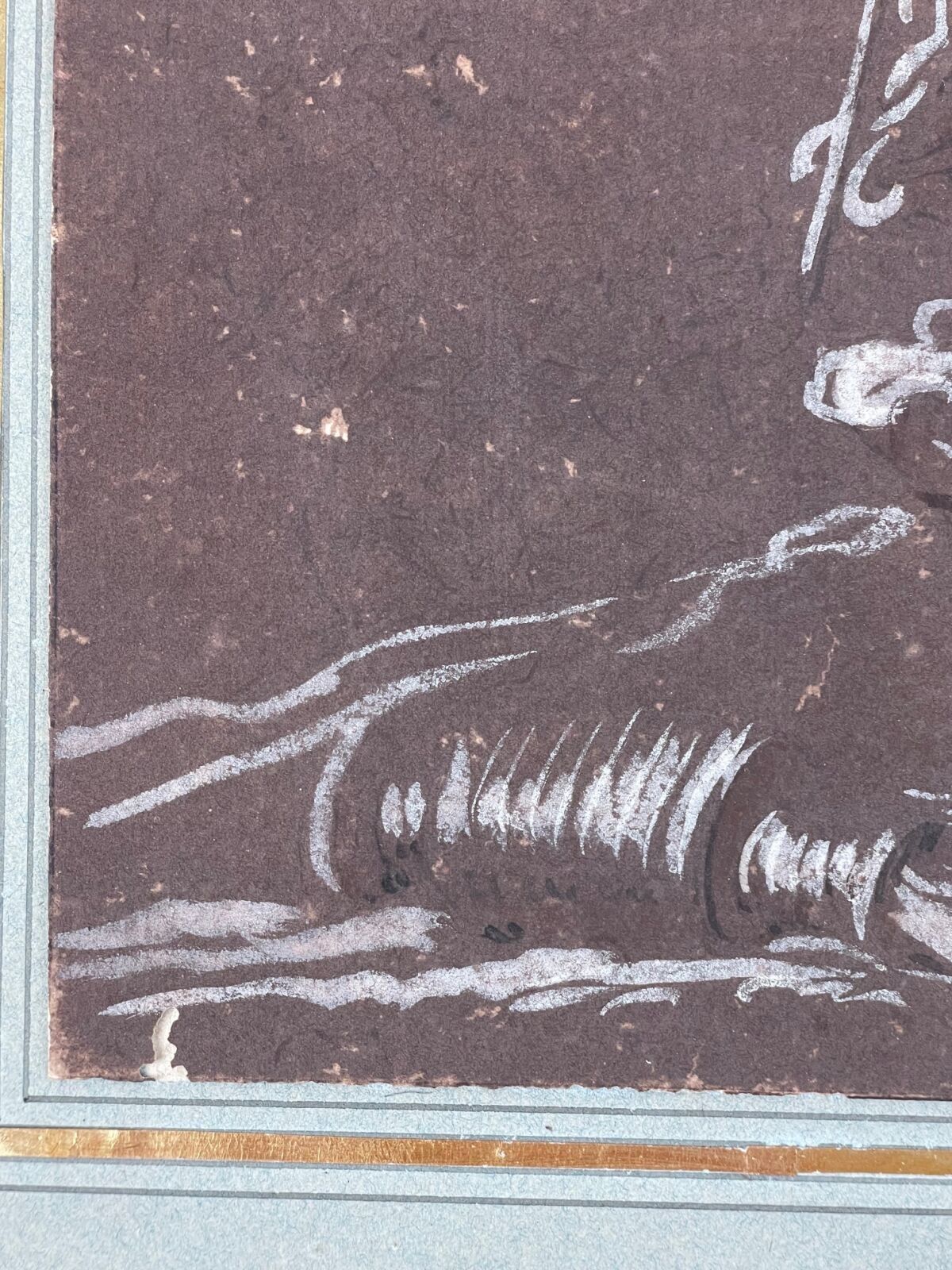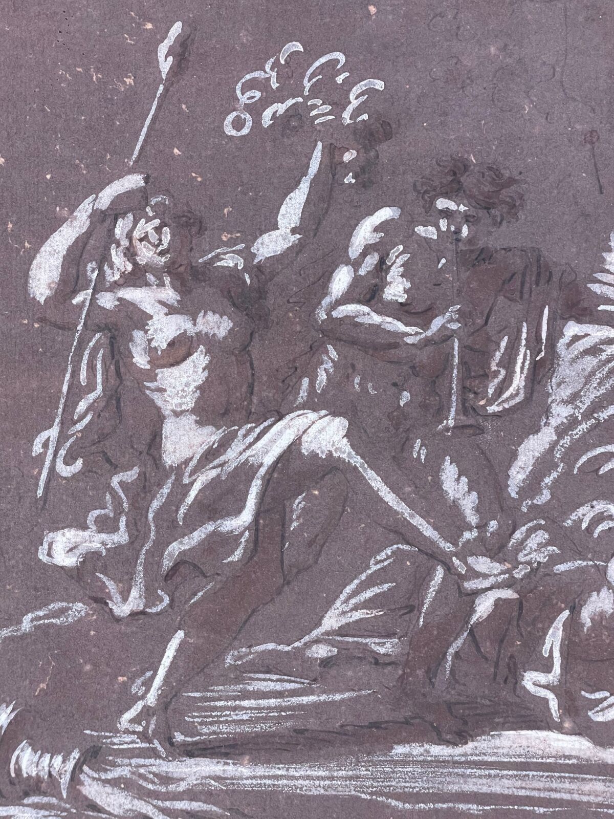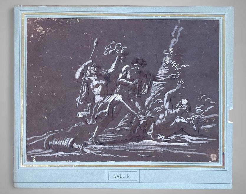 Pen and black ink, brown wash, highlights of white gouache on paper prepared in brown with gouache; annotated "Vallin" lower centre in the margin of the mount.