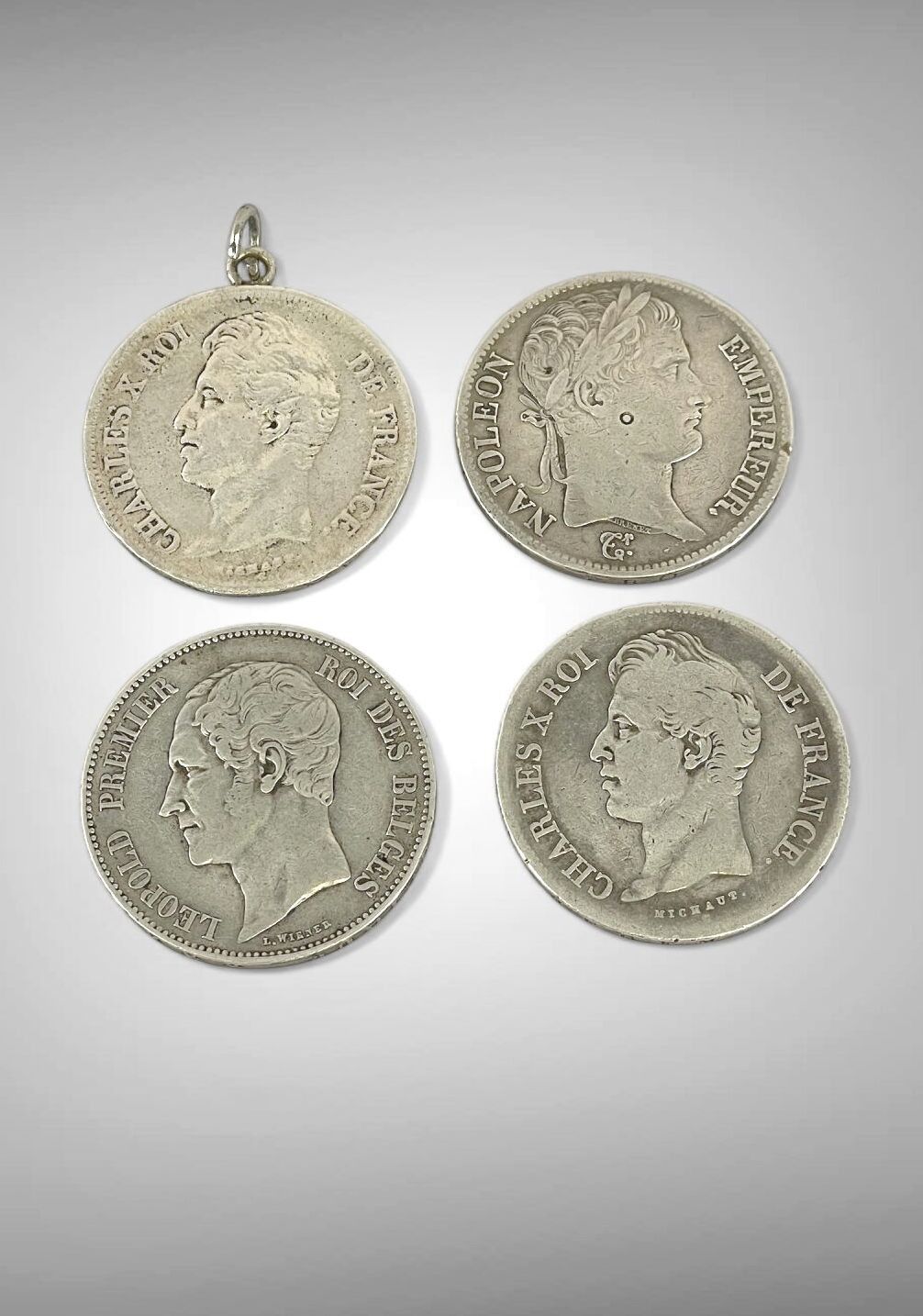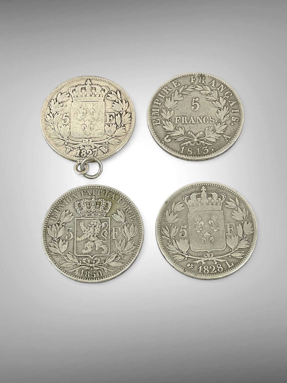 Four silver five-franc coins, 1813, 1827, 1828 and 1850, one with hoop.