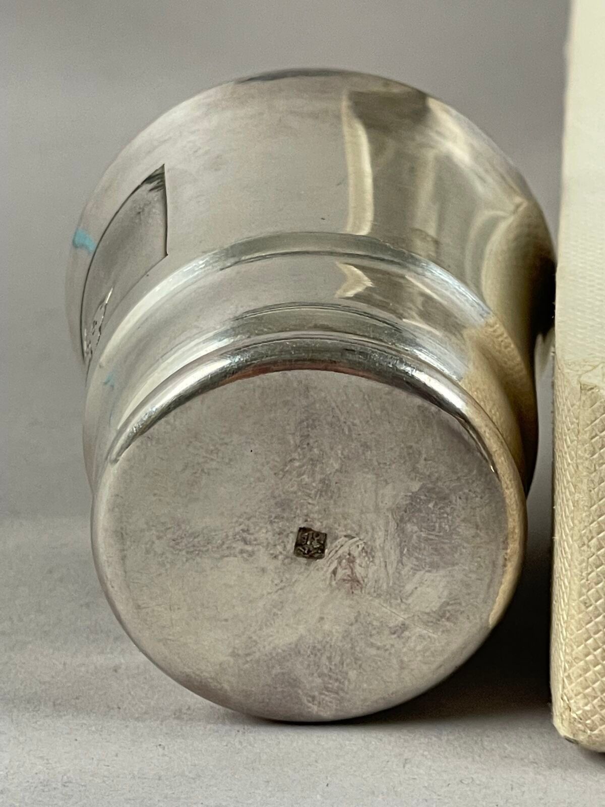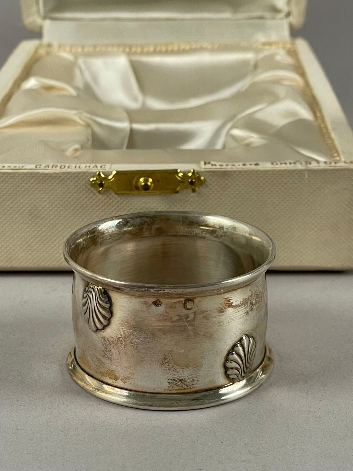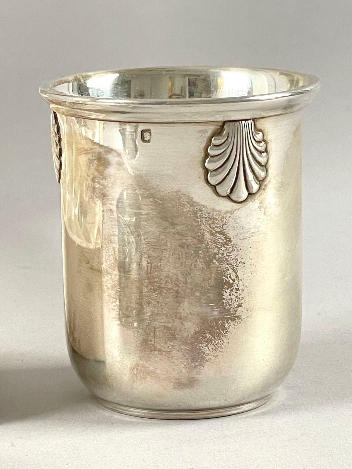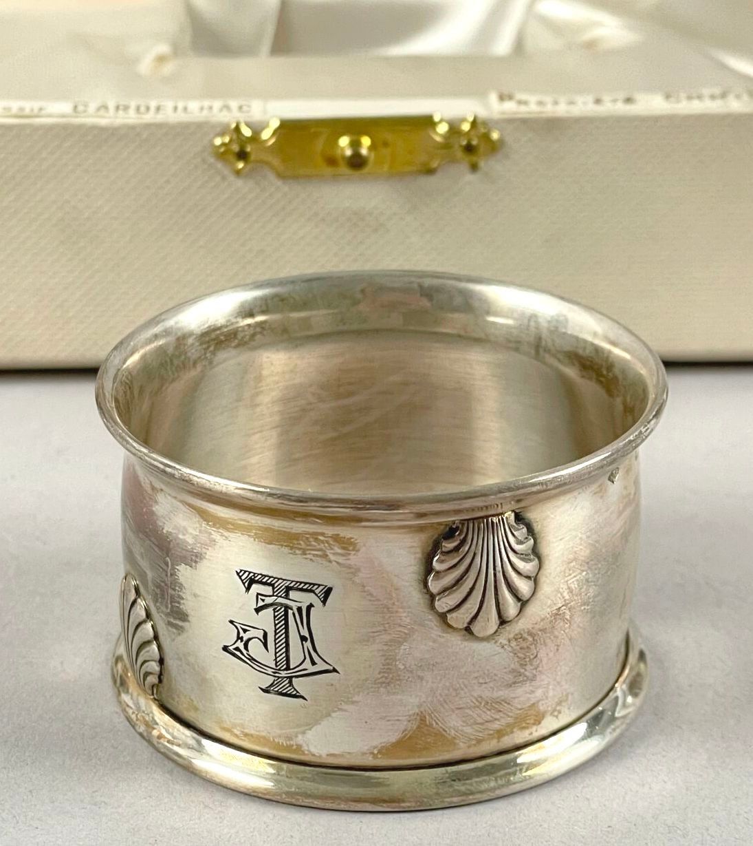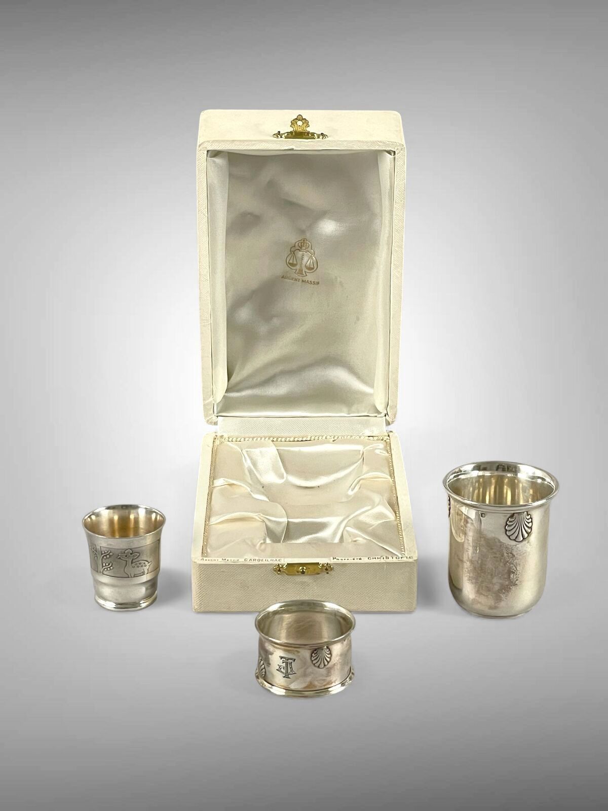 Silver set with shell decoration and monogrammed "TJ" comprising a tumbler and napkin ring.
