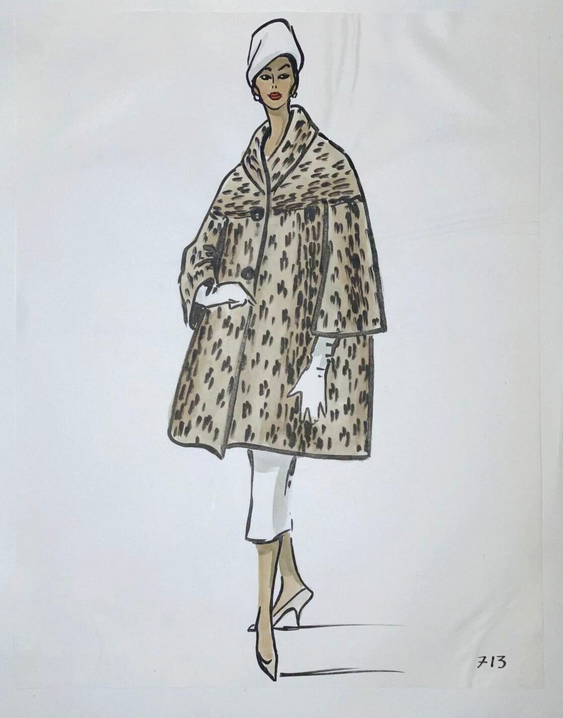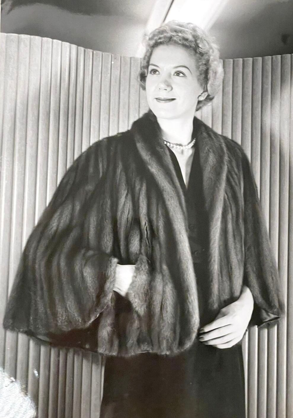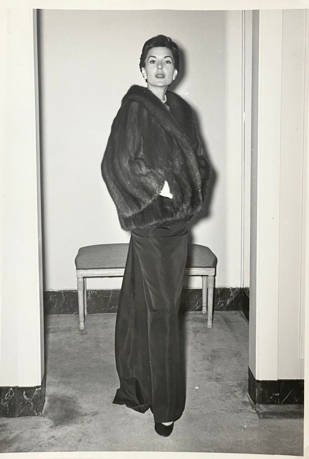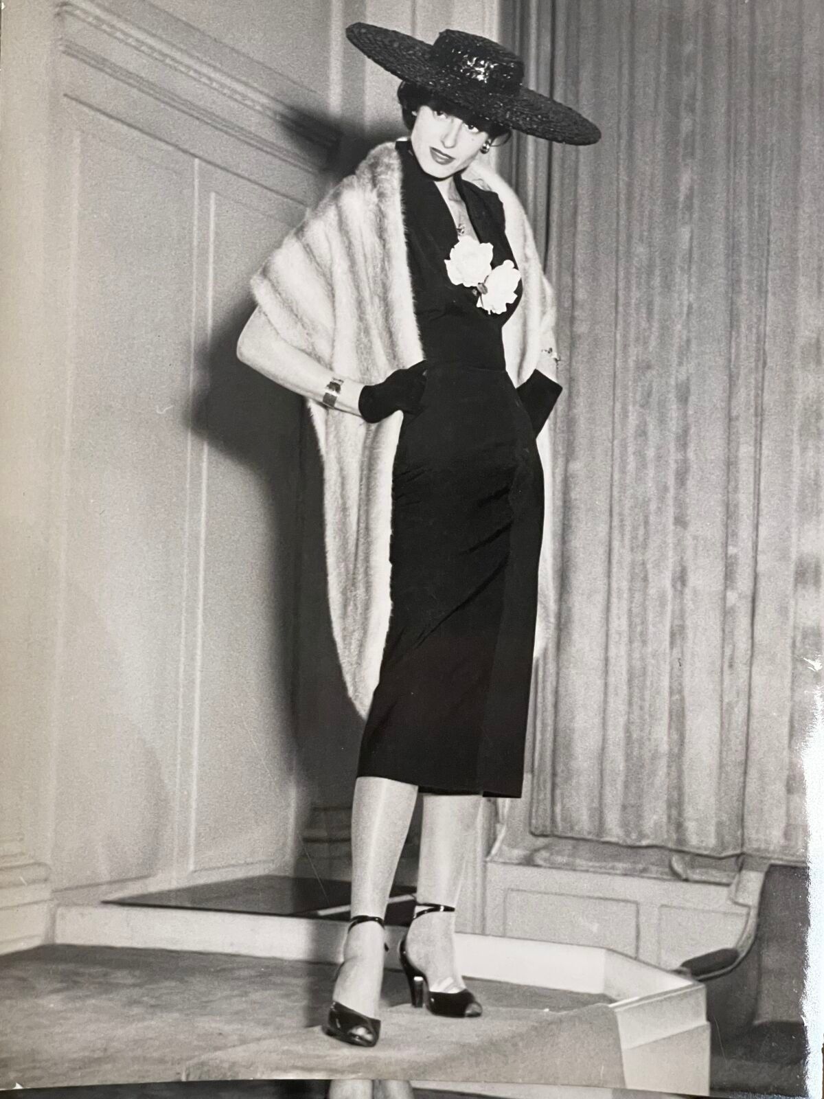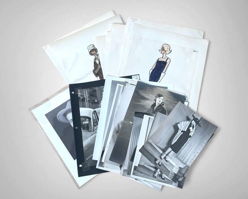 Fashion documentation set from the 1950s comprising 27 black and white photographs, with a beautiful range of furs, and 7 silhouettes of women enhanced in ink, mostly in daywear, some in mink or panther furs.