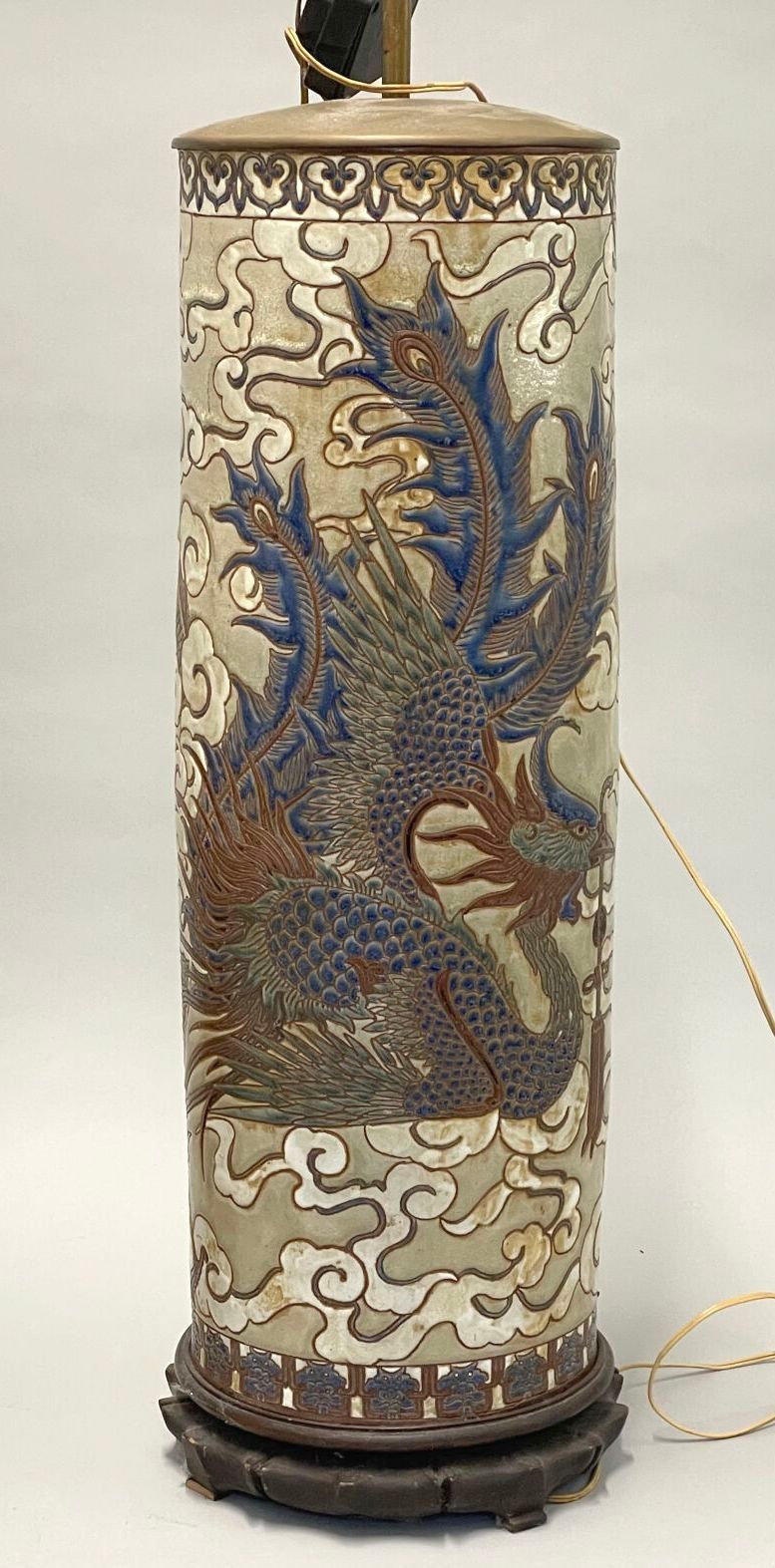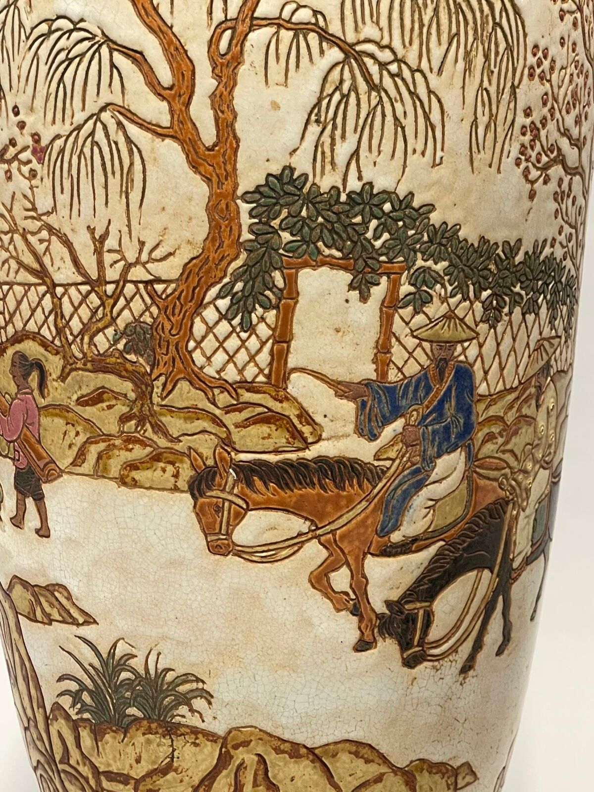 Reunion of two vases, one glazed ceramic scroll decorated with birds and ideograms, the other glazed ceramic garden scene. Two wooden bases.