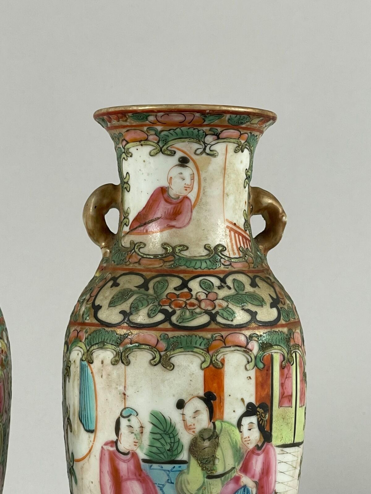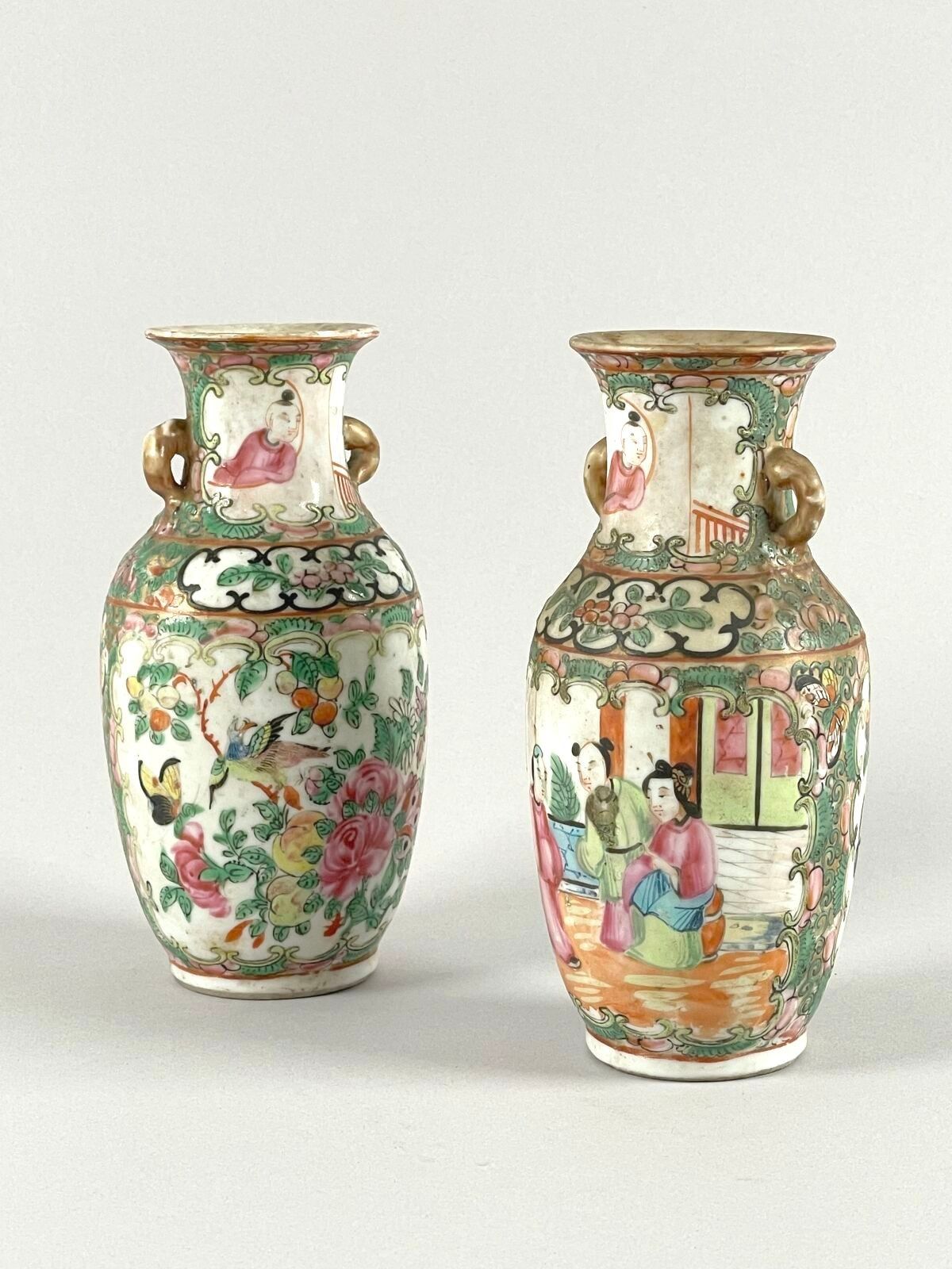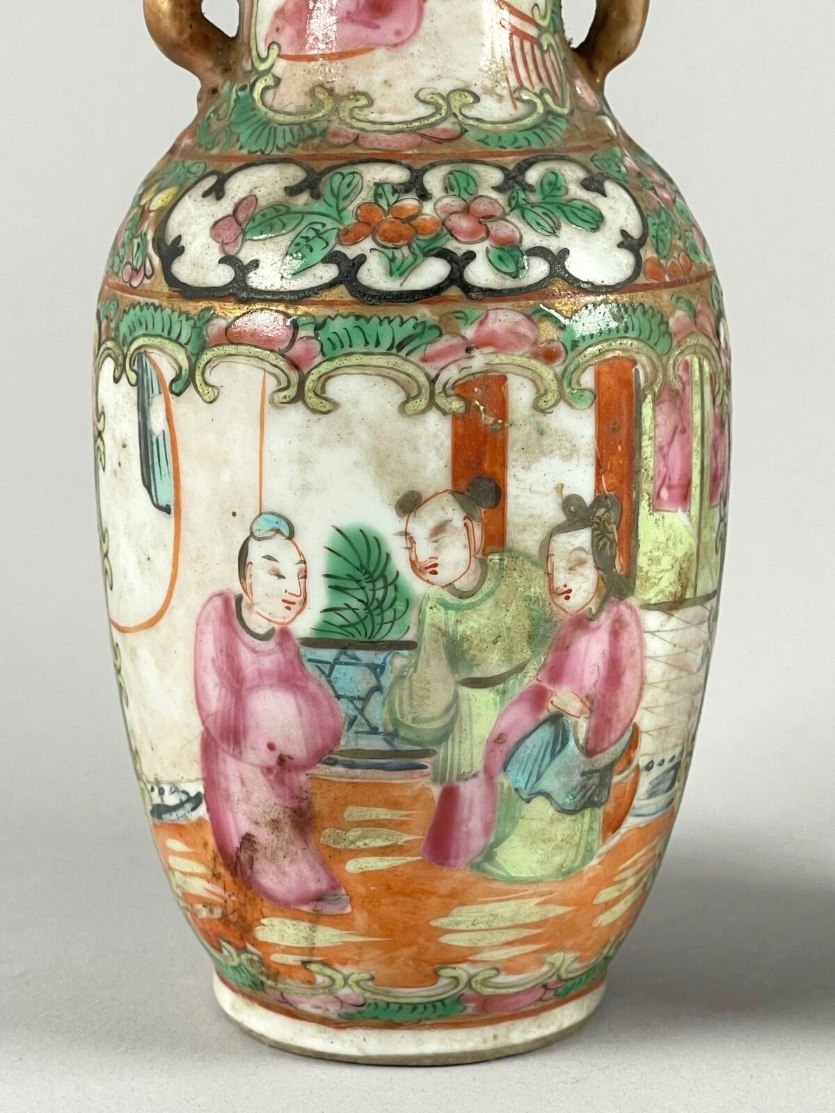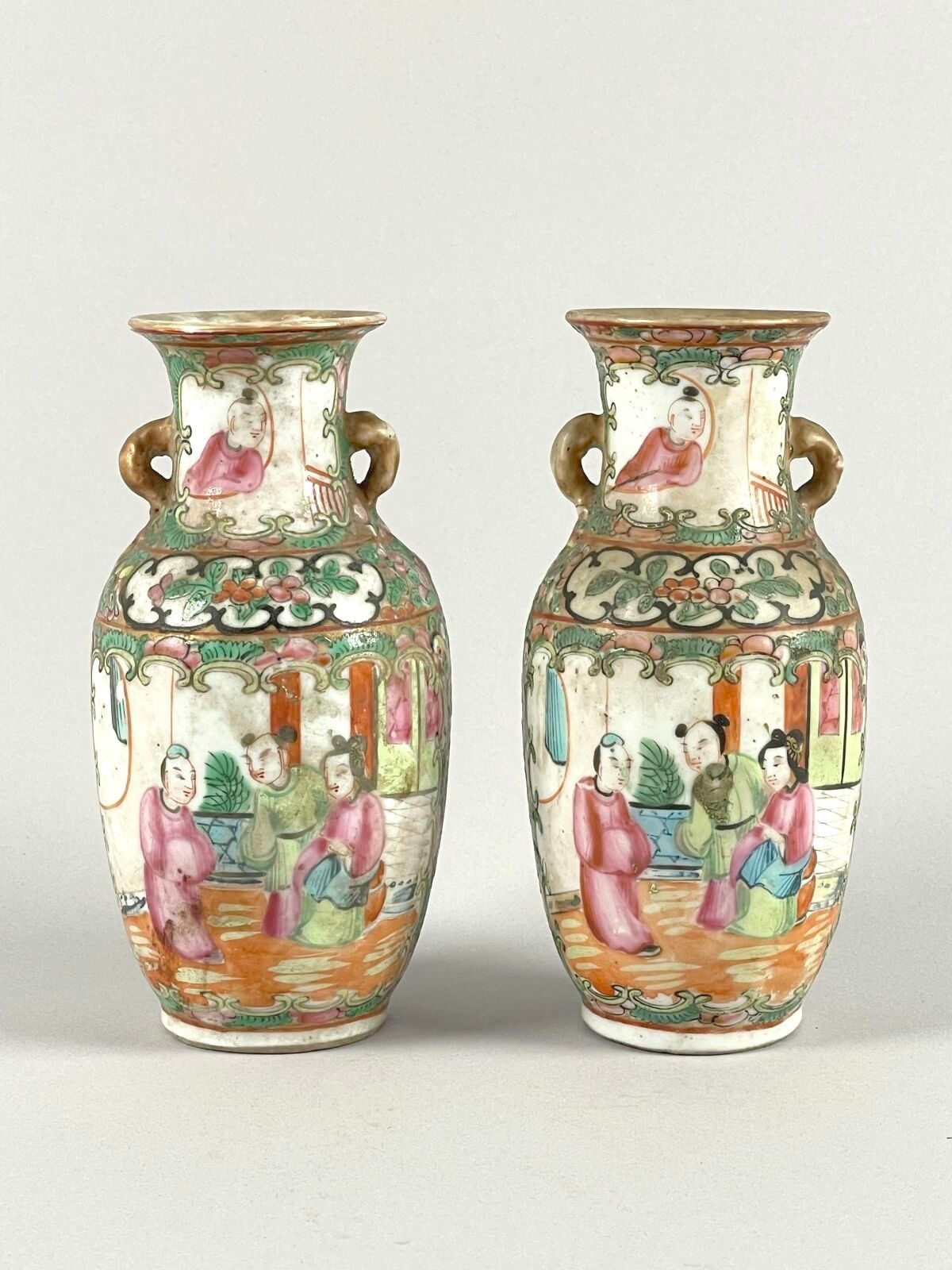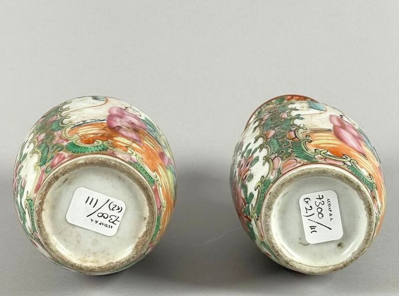 Pair of small porcelain vases with polychrome enamel decoration of interior scenes in reserves.