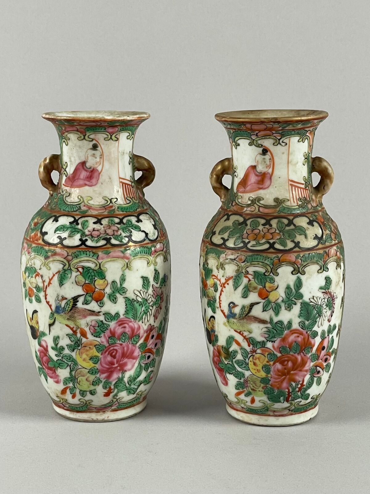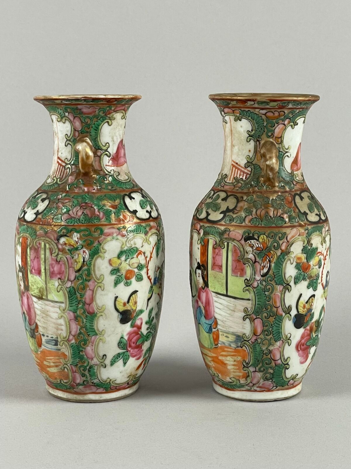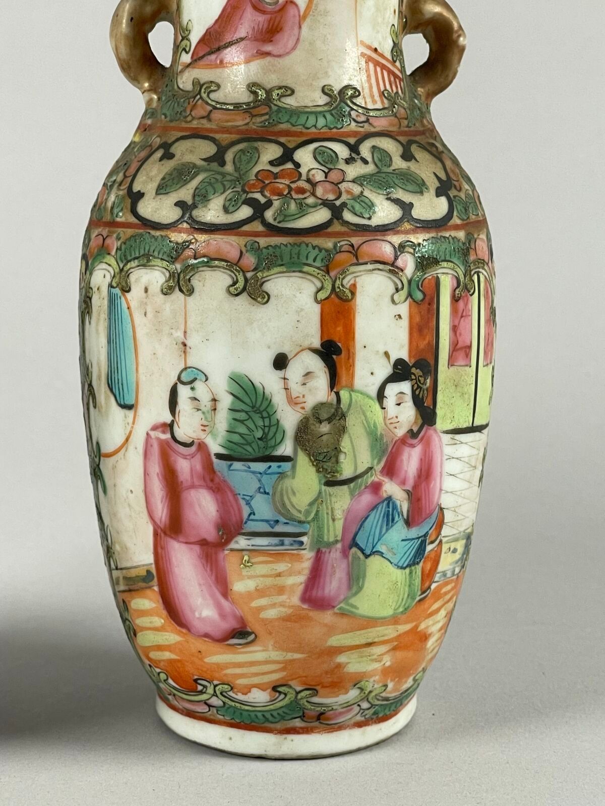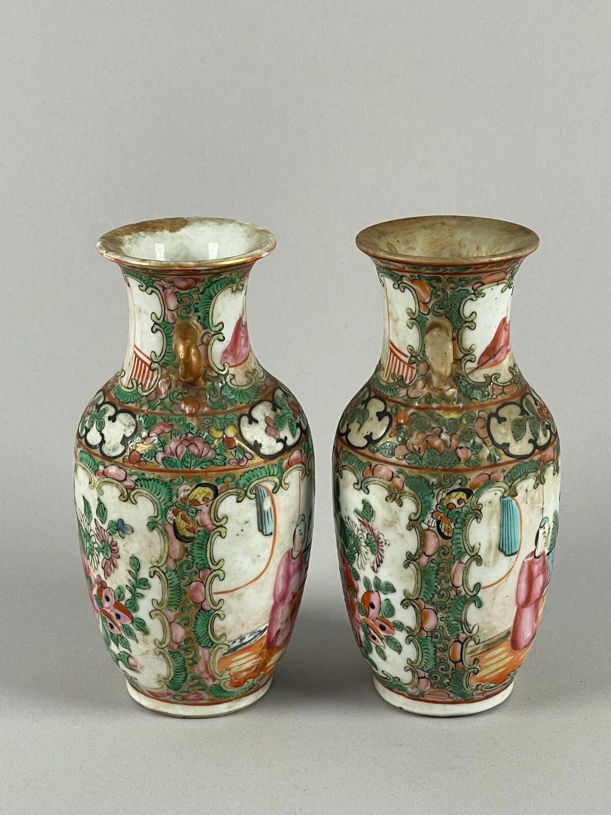 Pair of small porcelain vases with polychrome enamel decoration of interior scenes in reserves.