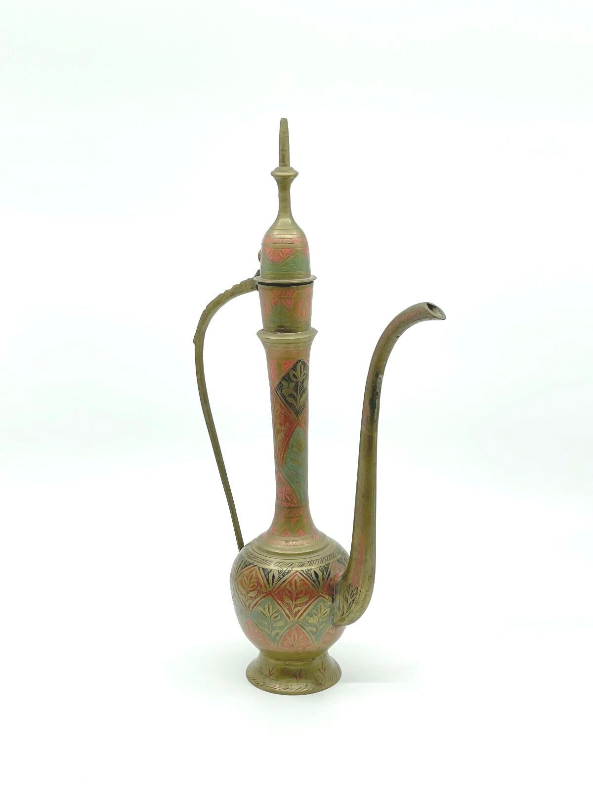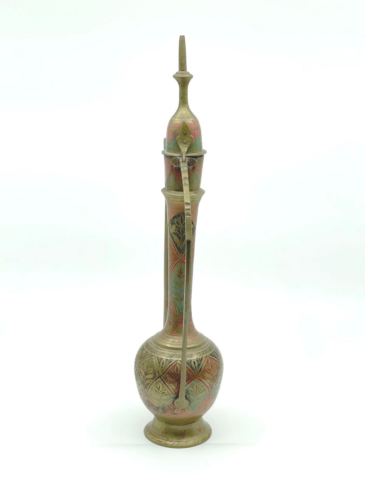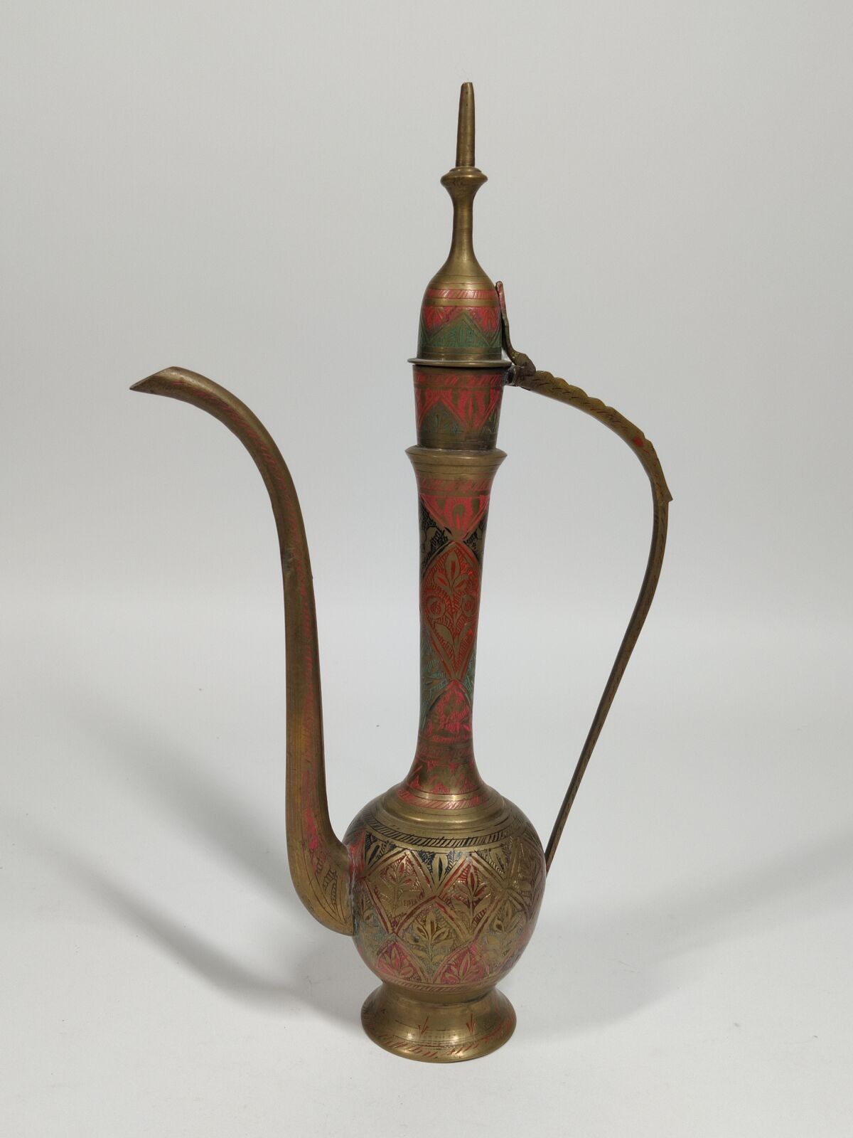 Polychrome brass ewer engraved with stylised plant motifs, hinged lid.