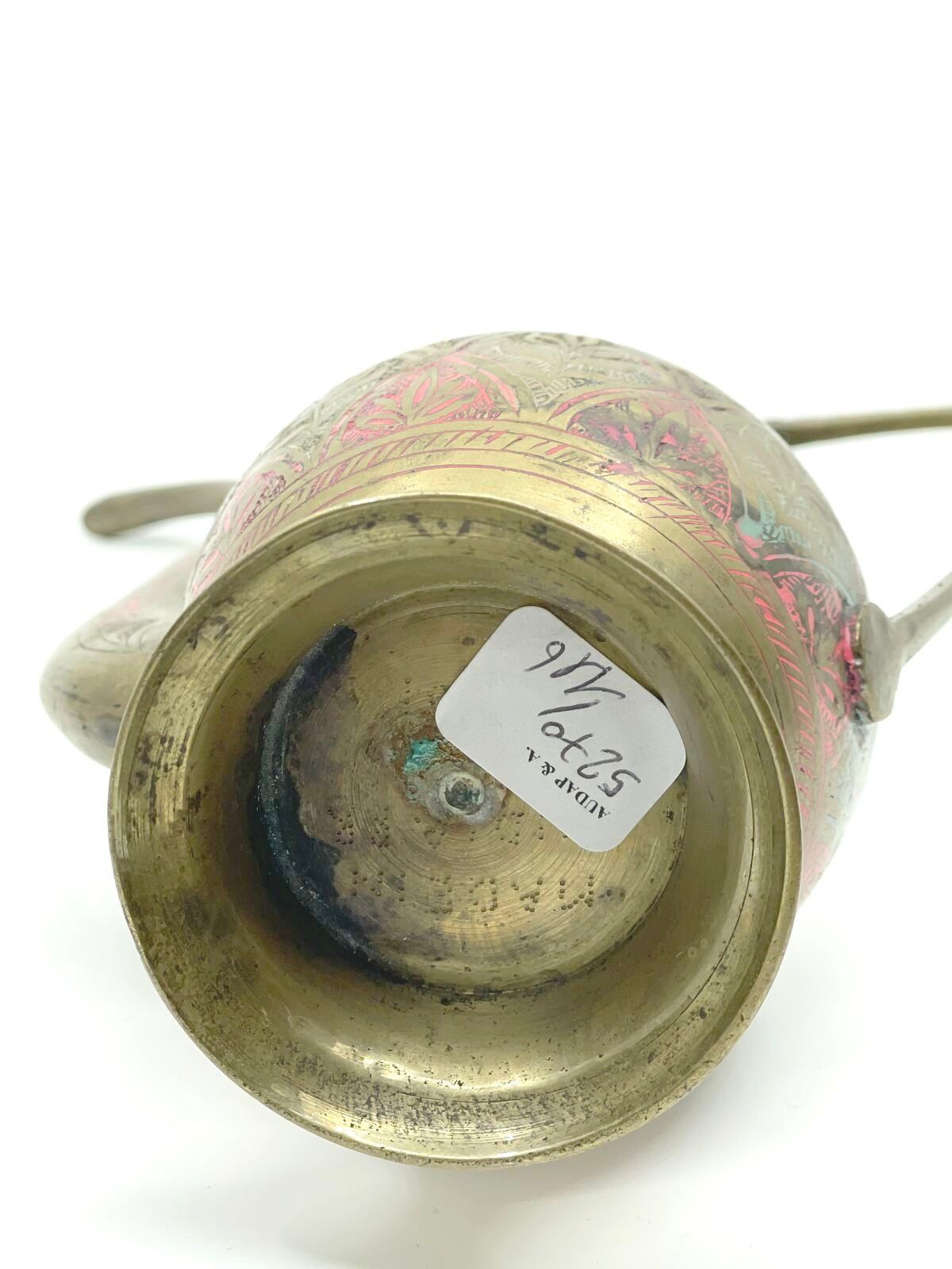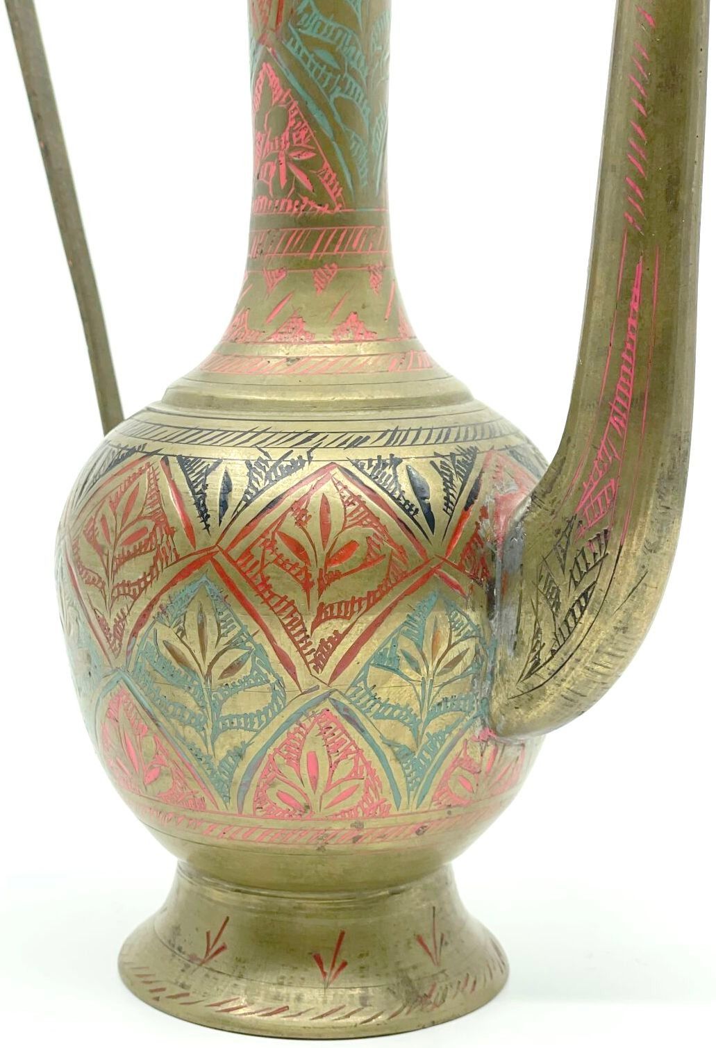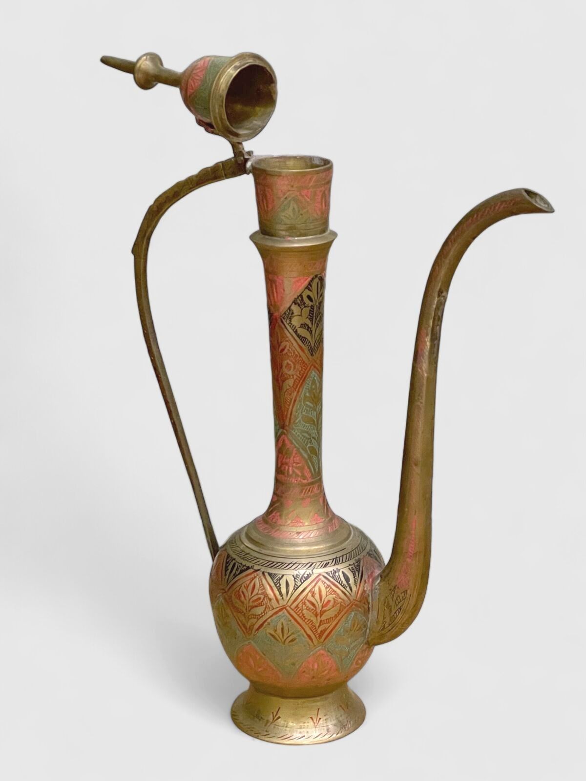 Polychrome brass ewer engraved with stylised plant motifs, h…