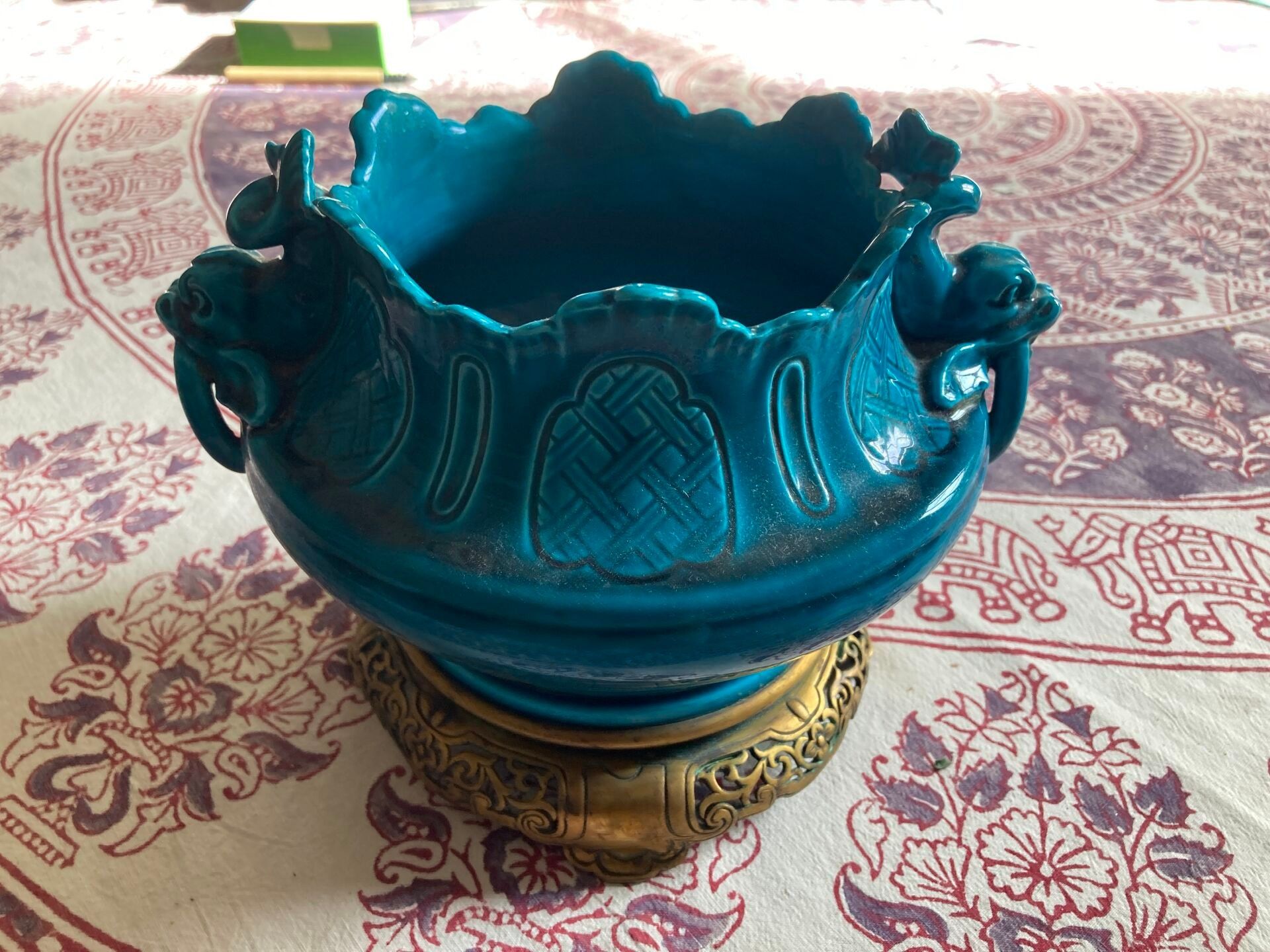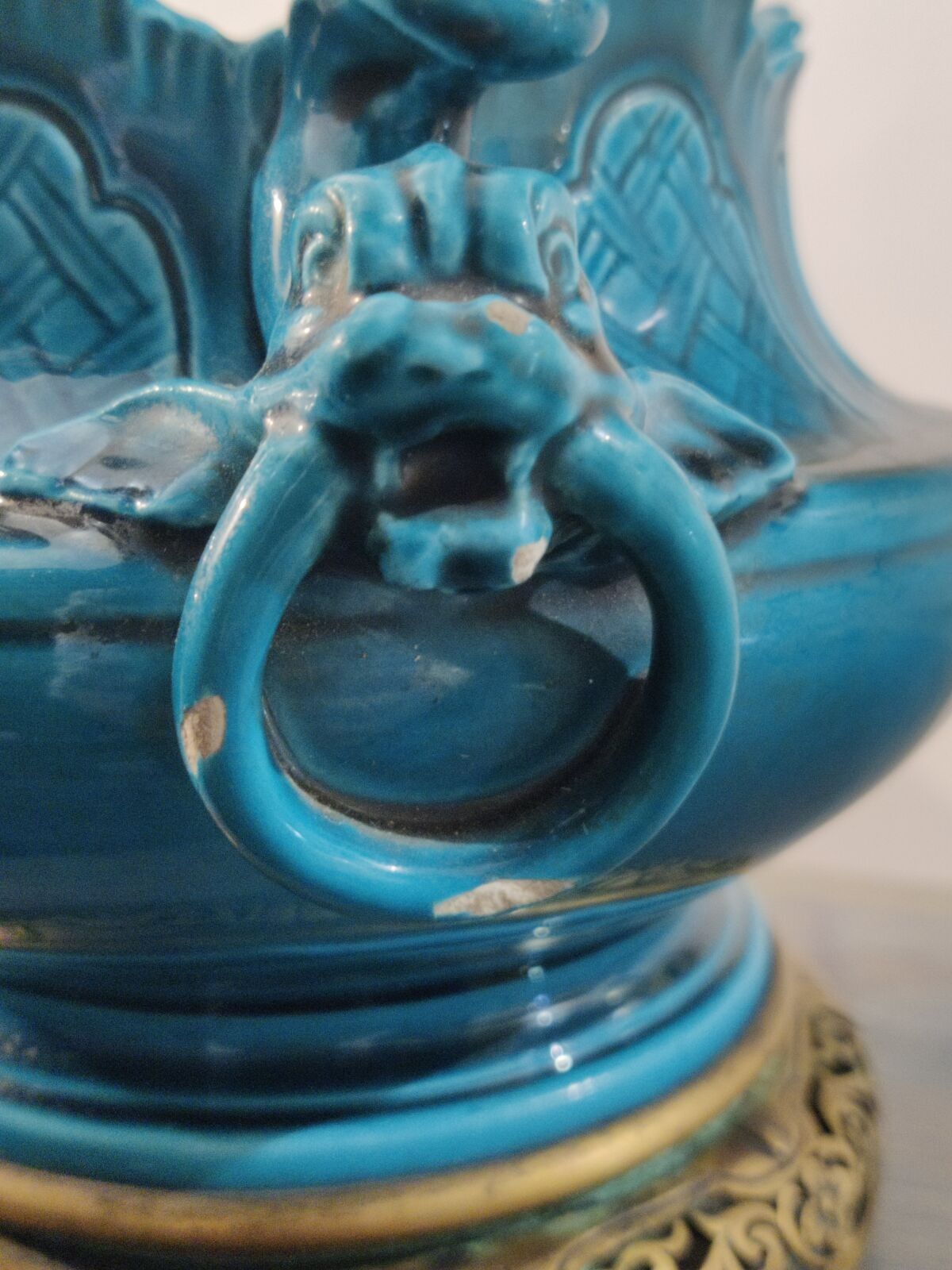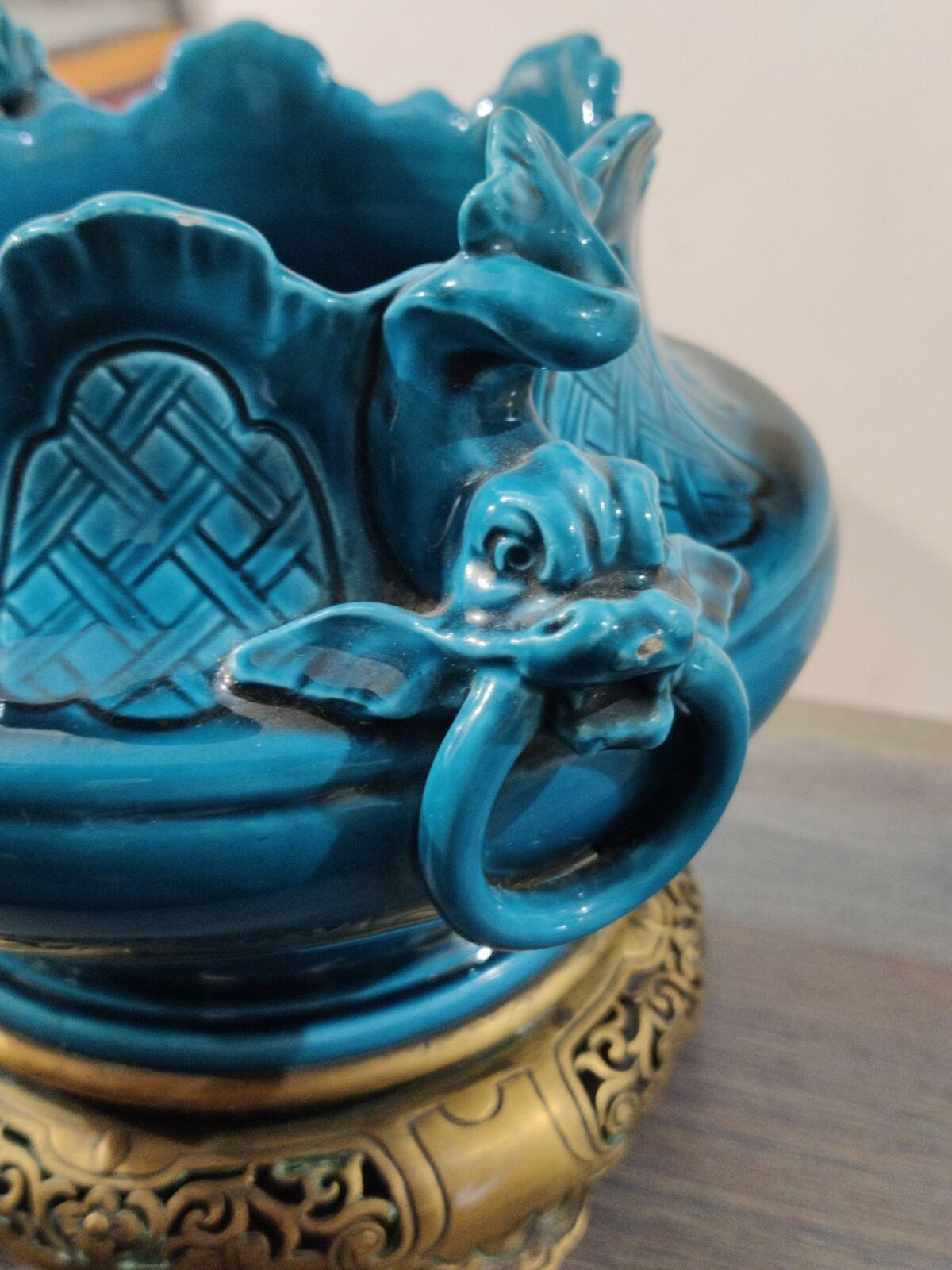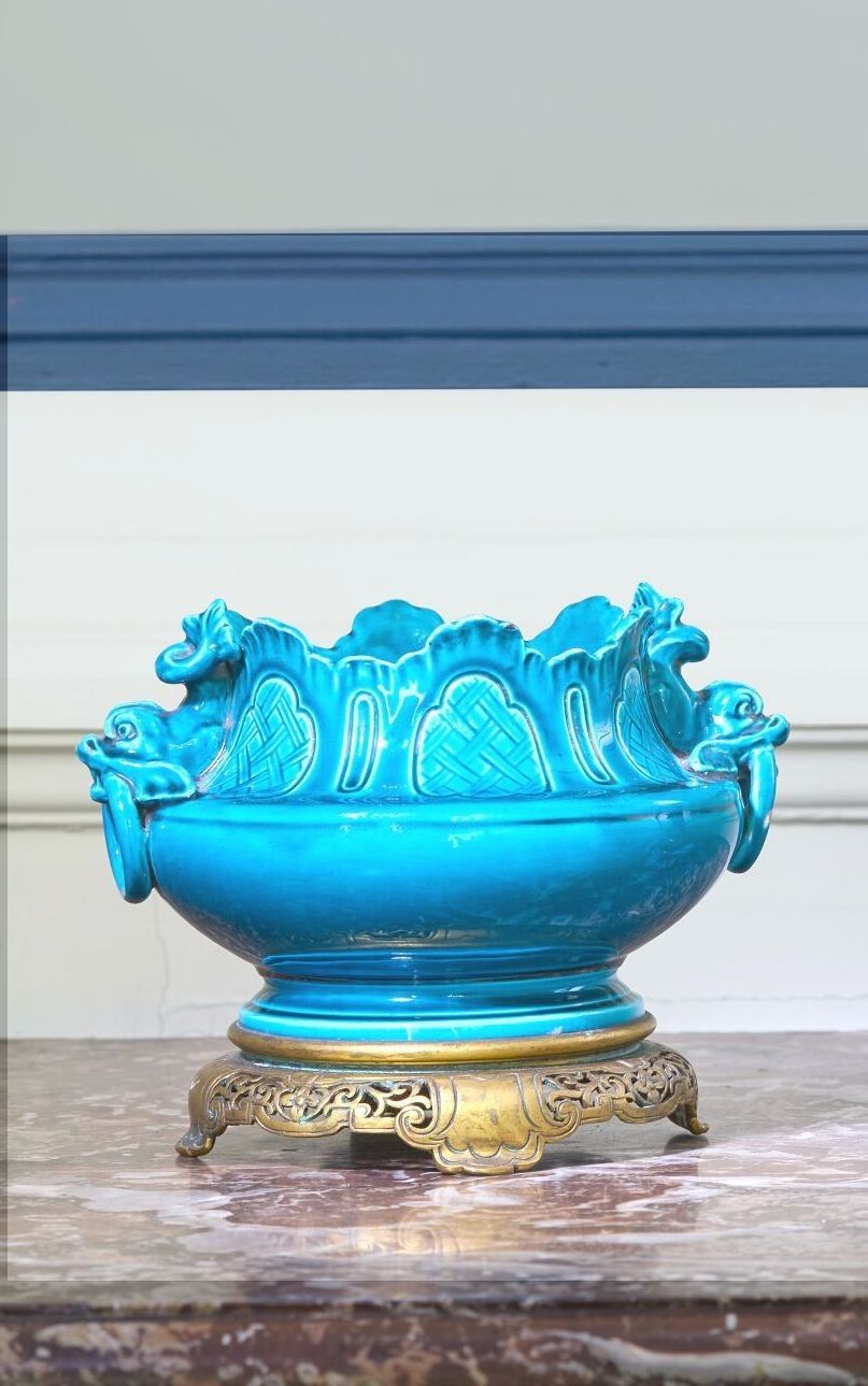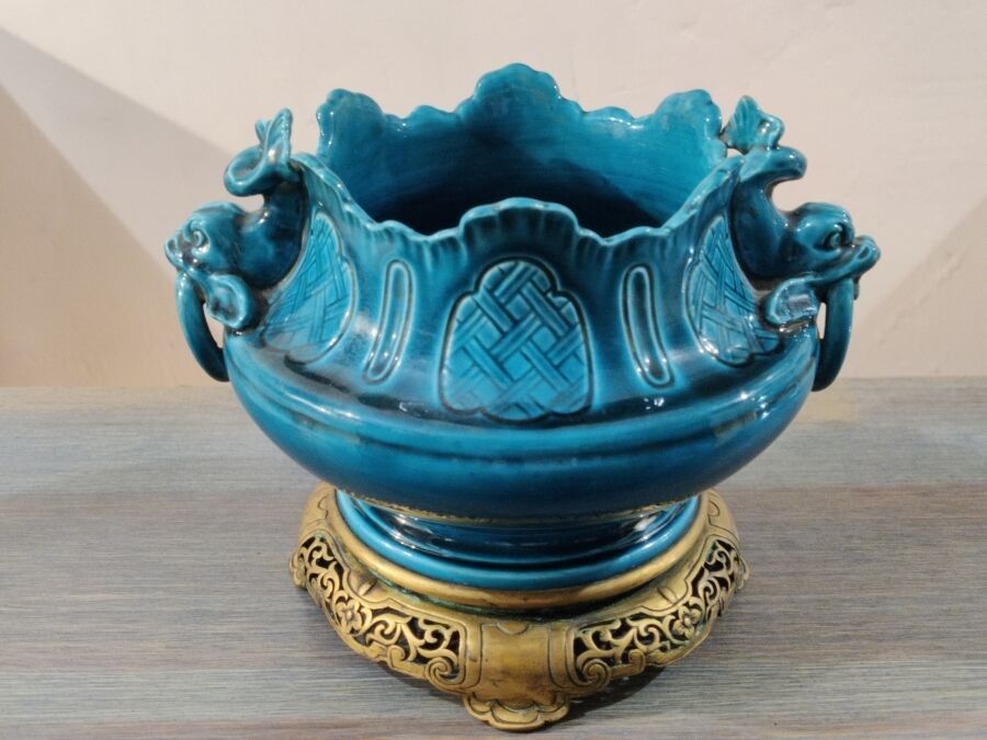 A celestial blue earthenware bowl decorated in relief with dolphins holding a ring, the gilt bronze mounting.