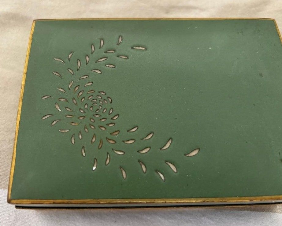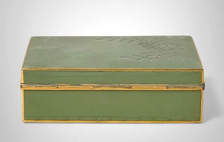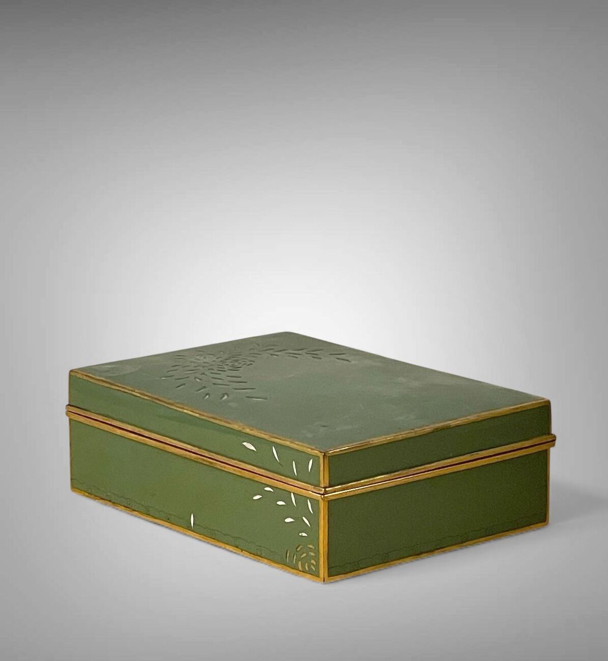 Green lacquered metal box, revealing a gilded interior decor…