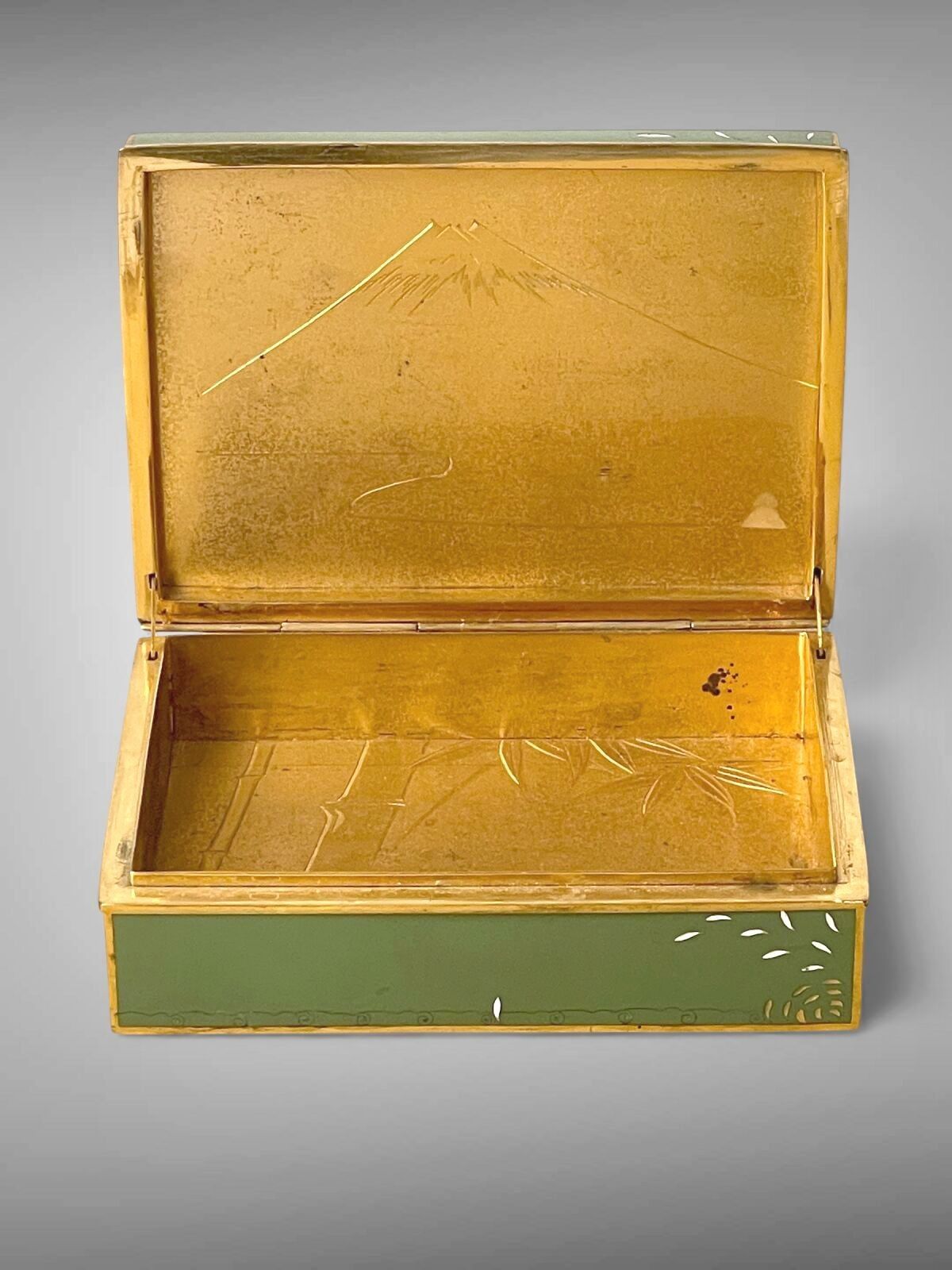 Green lacquered metal box, revealing a gilded interior decorated with a landscape of Mount Fuji and bamboo, the hinged lid.