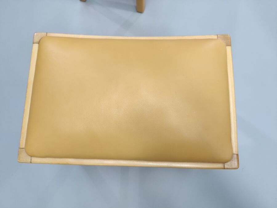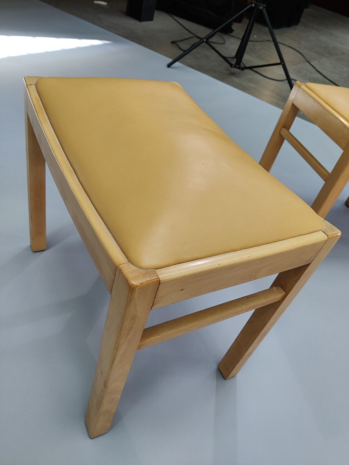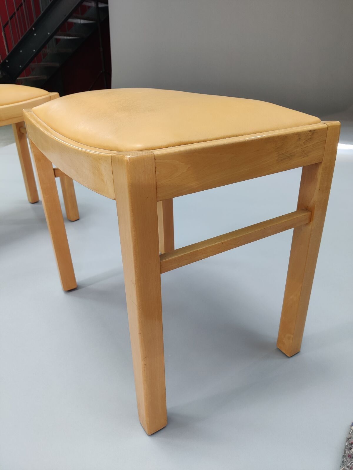 Pair of stools in sycamore with a rectangular seat on a corner base with straight square legs.