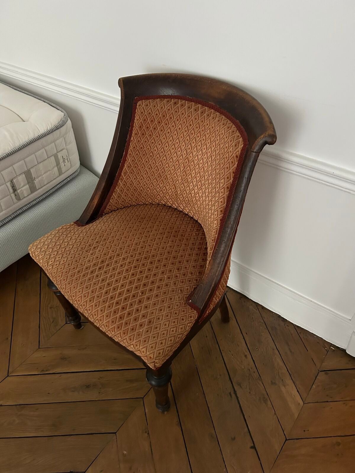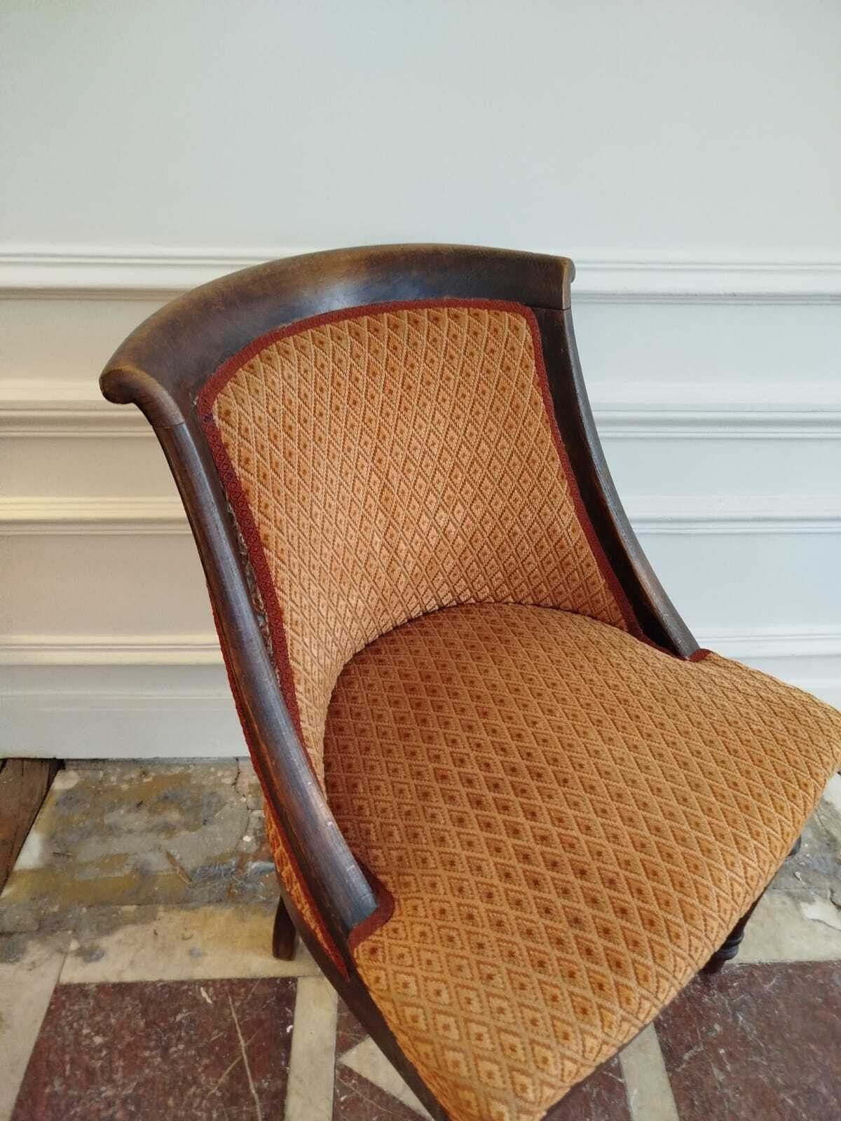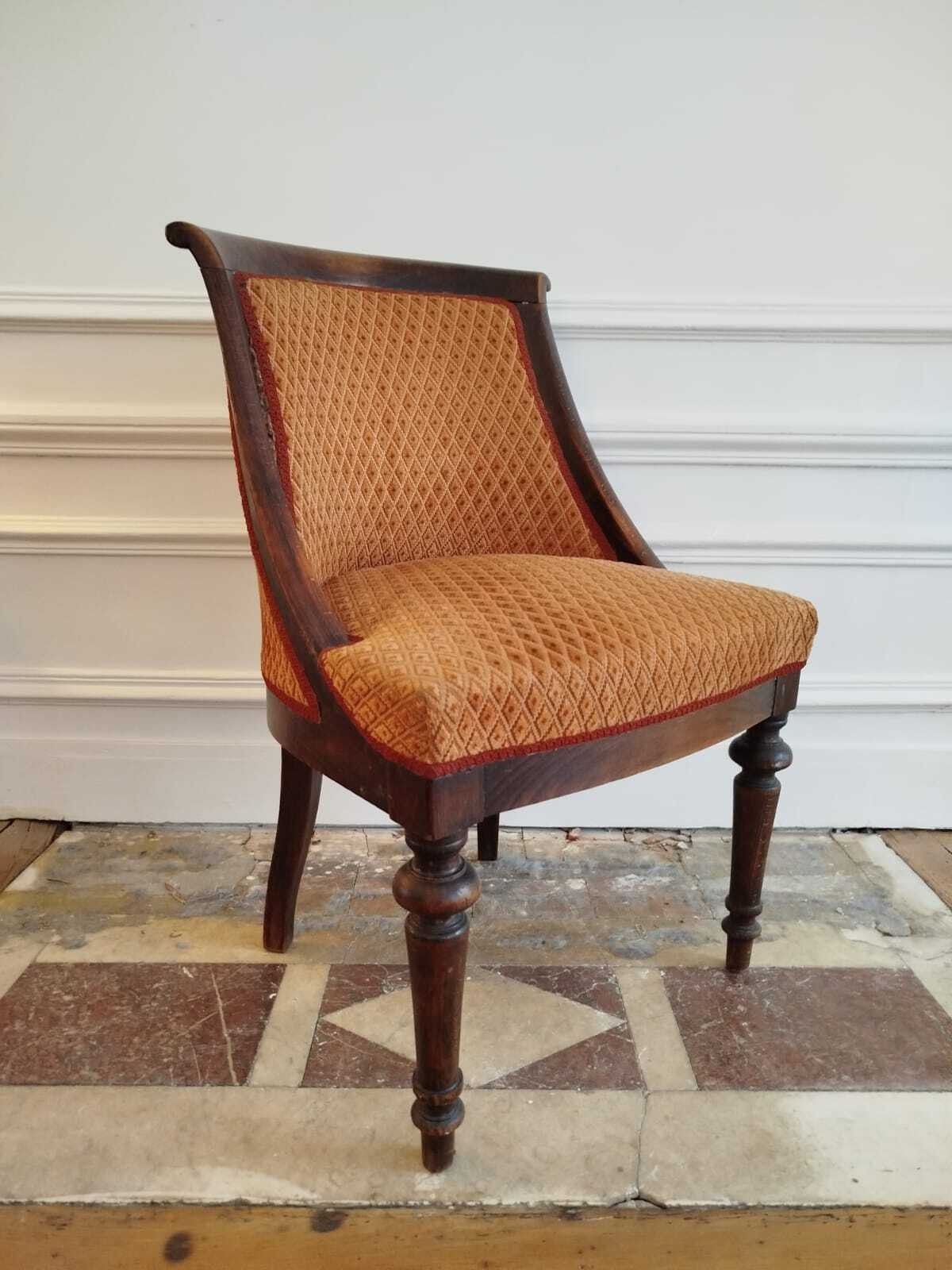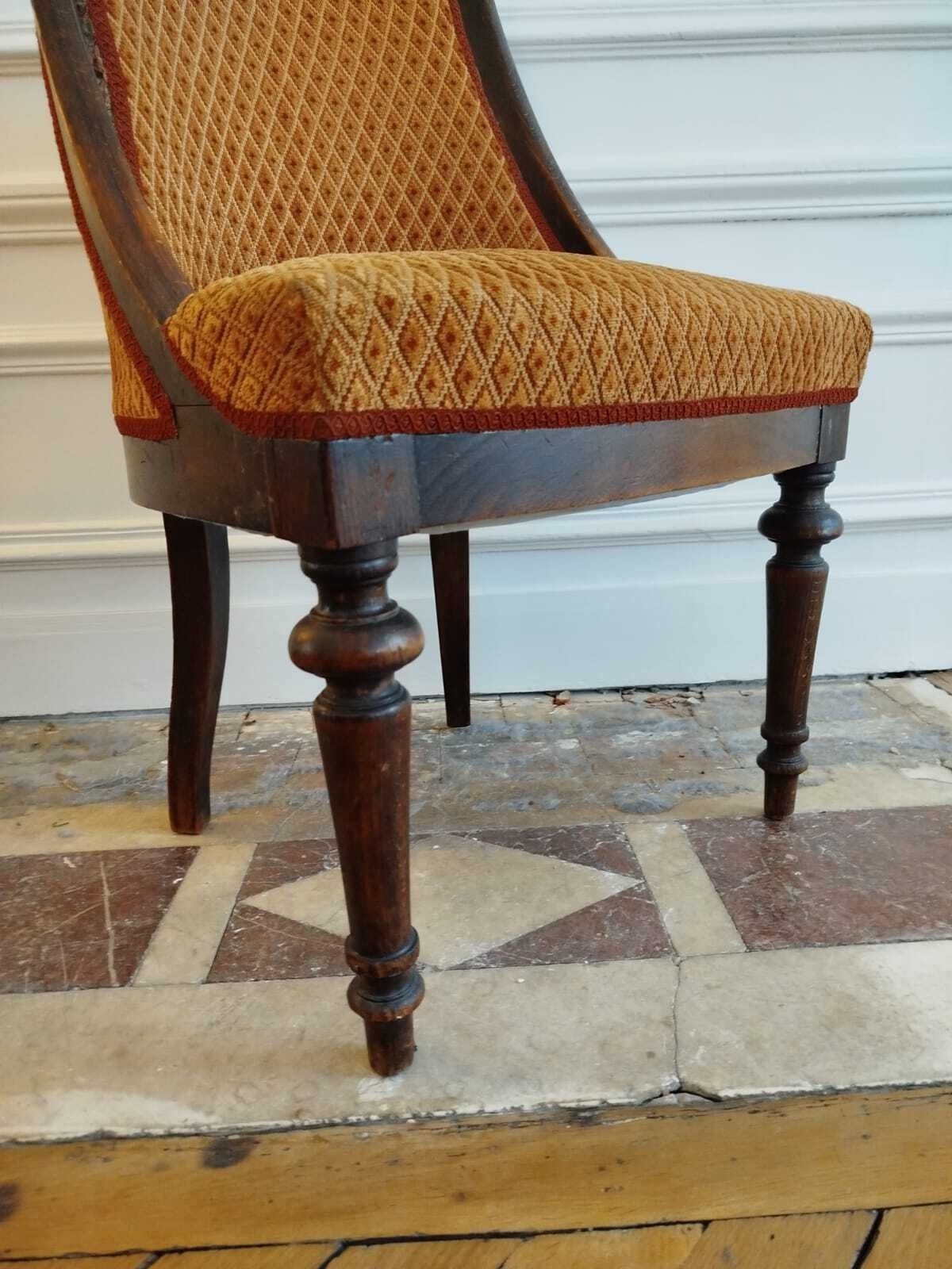 Gondola armchair resting on two baluster front legs and two curved back legs, the back finished in a scroll.