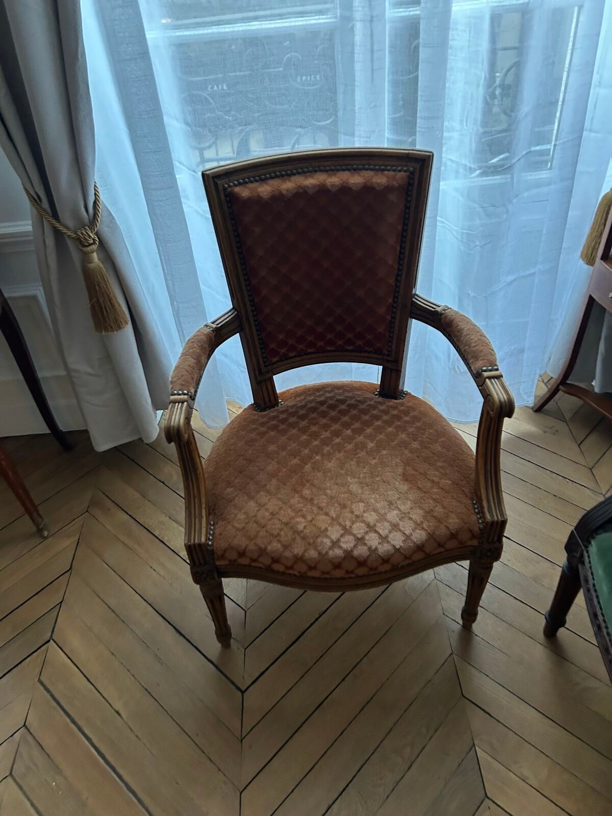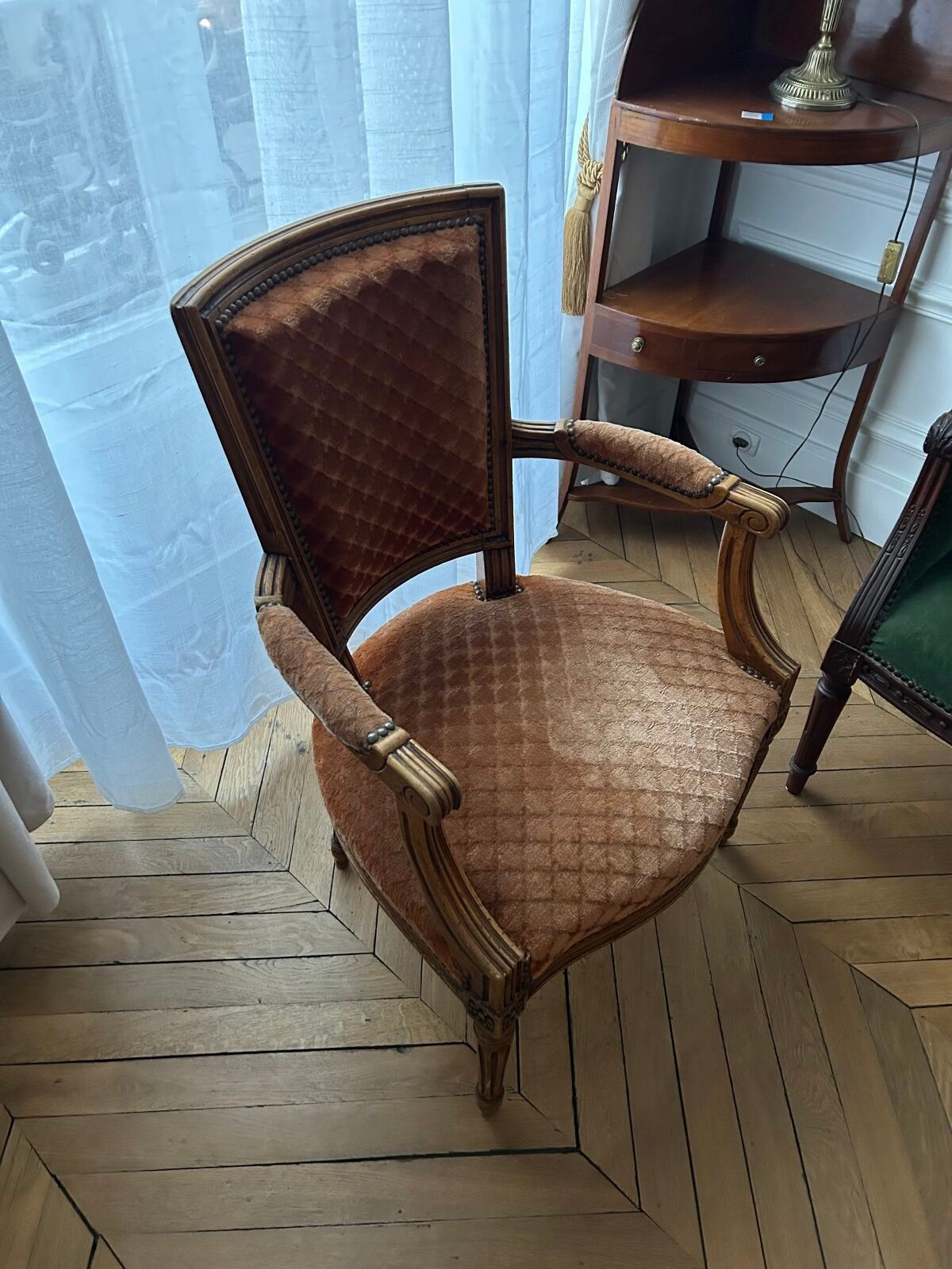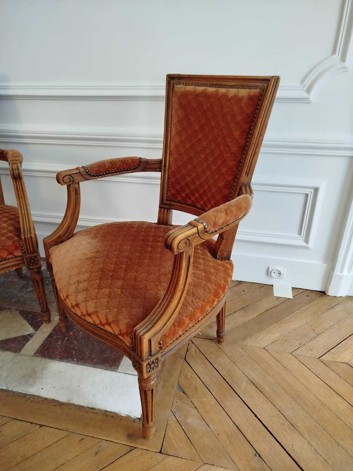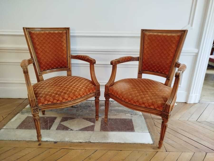 Pair of moulded and carved wooden armchairs resting on four fluted and filleted legs, the armrests with cuffs, tile back.