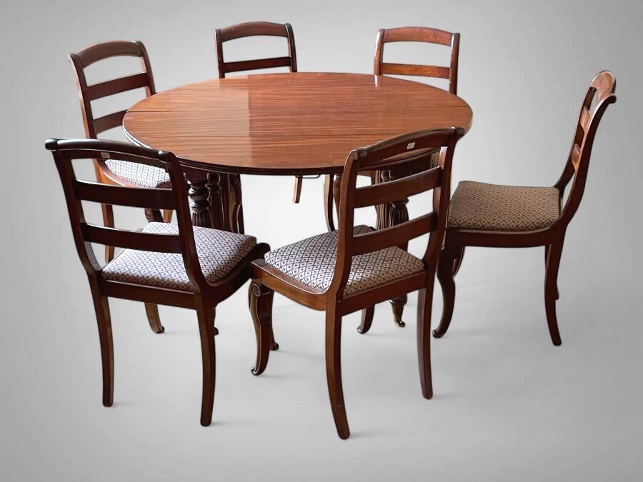 Mahogany dining table with shutters, fluted baluster legs, two white wood extensions, and six chairs with banded backs, later sabre legs, front arched.