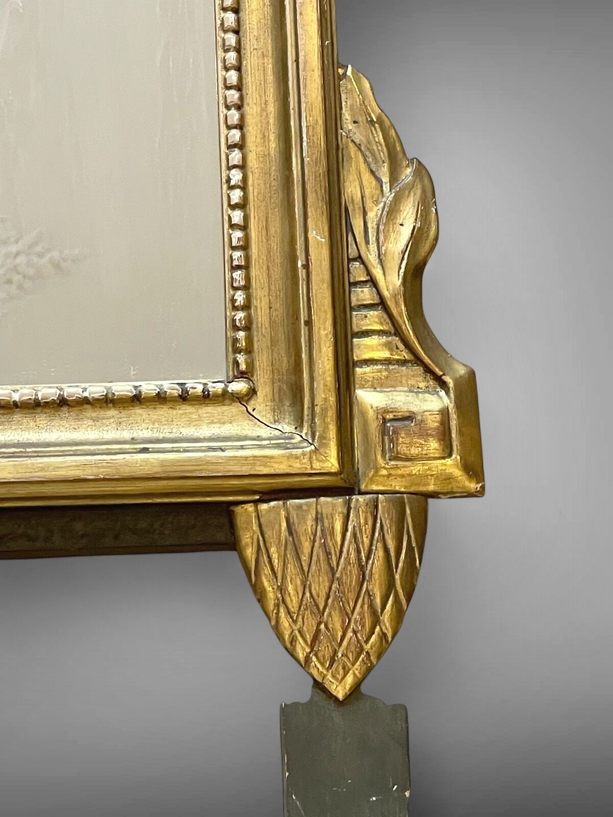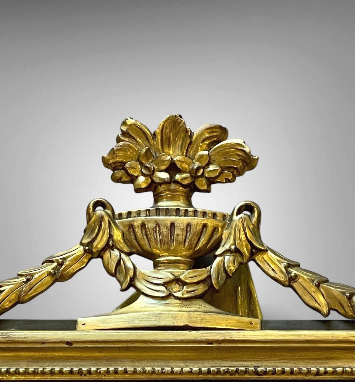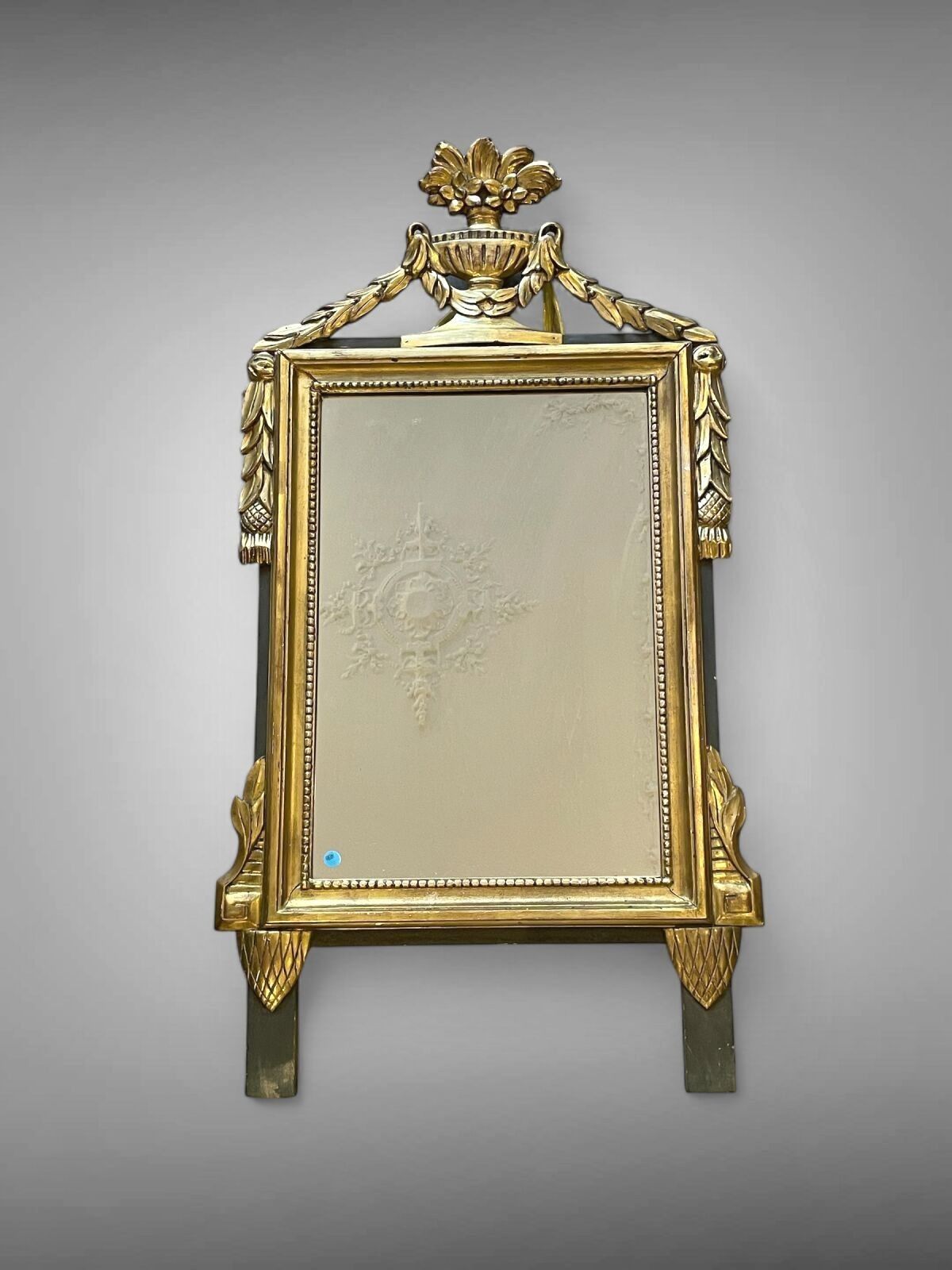 Mirror with rectangular carved and gilded wood frame surmounted by a flowering urn.