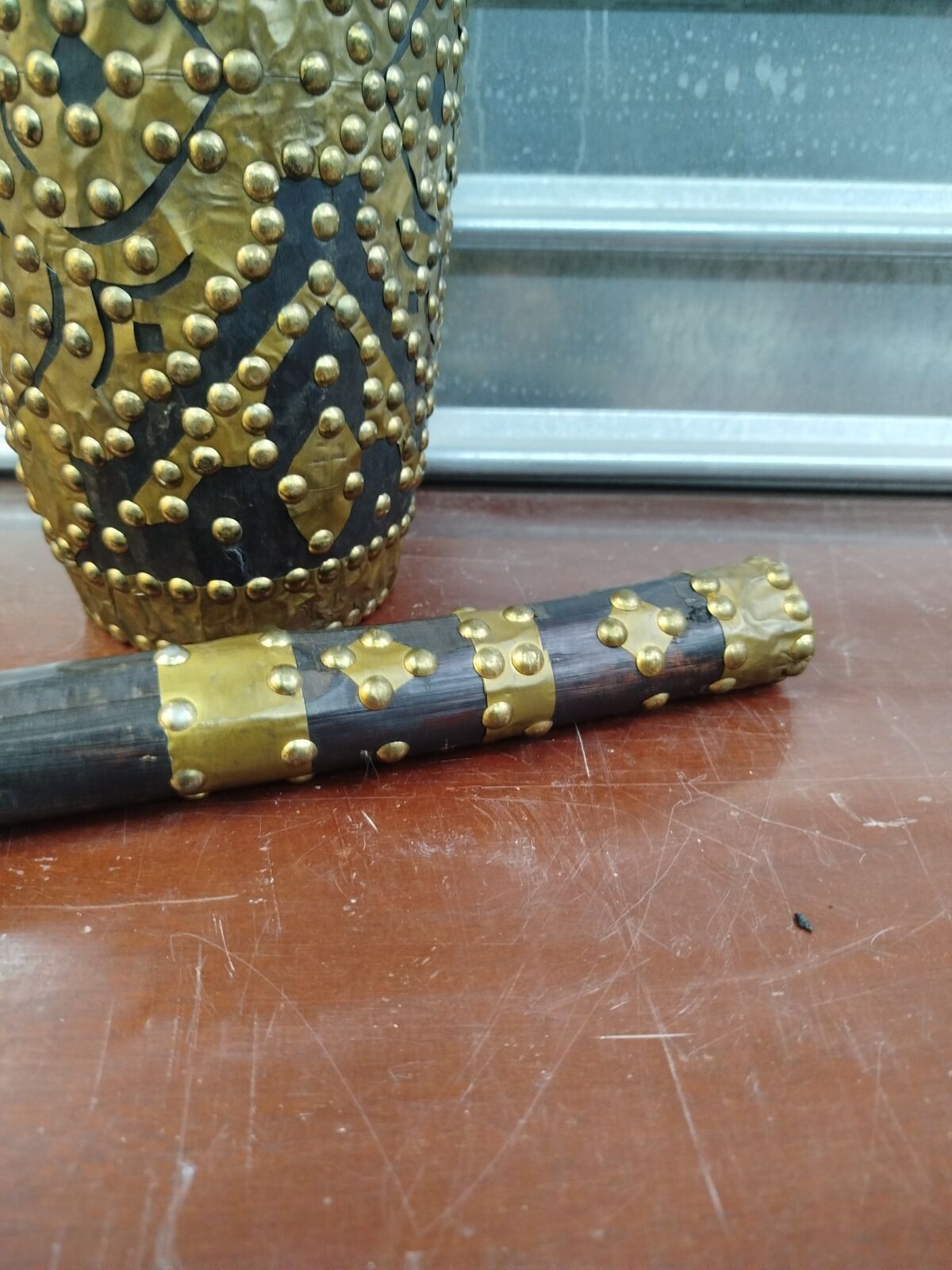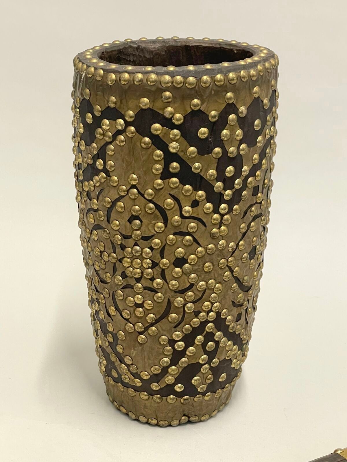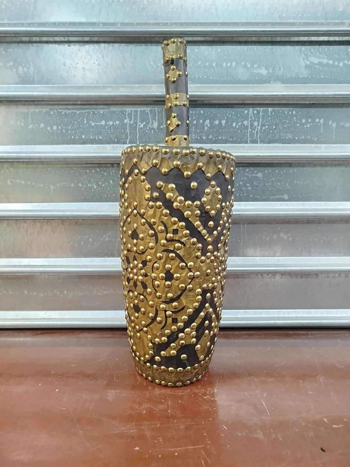 Obusal-shaped vase in wood covered with leaves and gilded nails