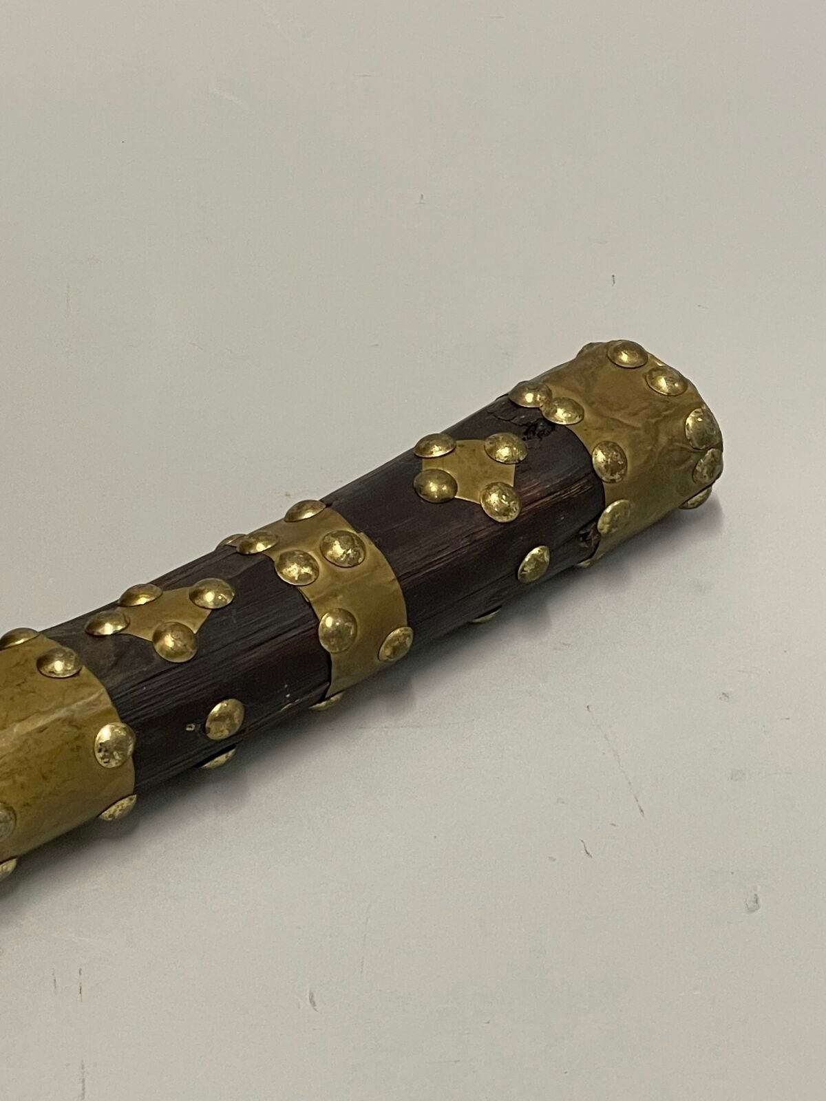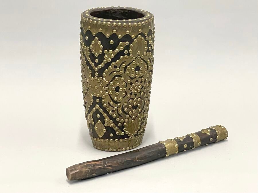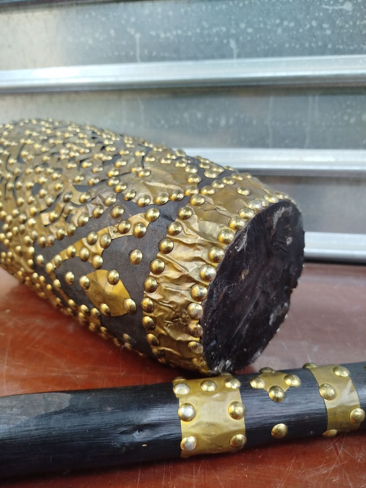 Obusal-shaped vase in wood covered with leaves and gilded nails