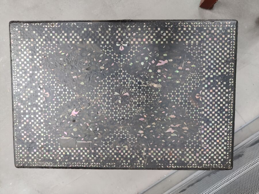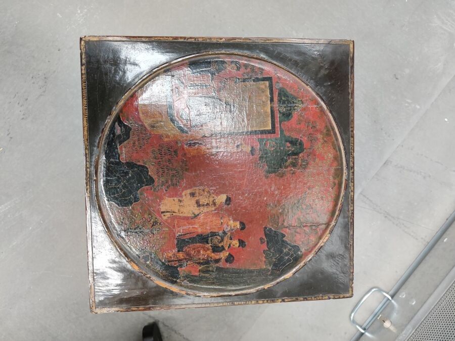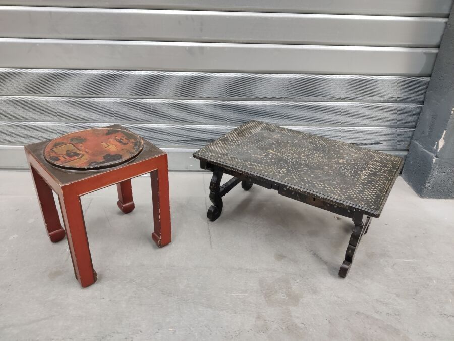 Set of two small tables, one in lacquered wood decorated with an oriental scene, the other in the Napoleon III style in wood and mother-of-pearl inlays.