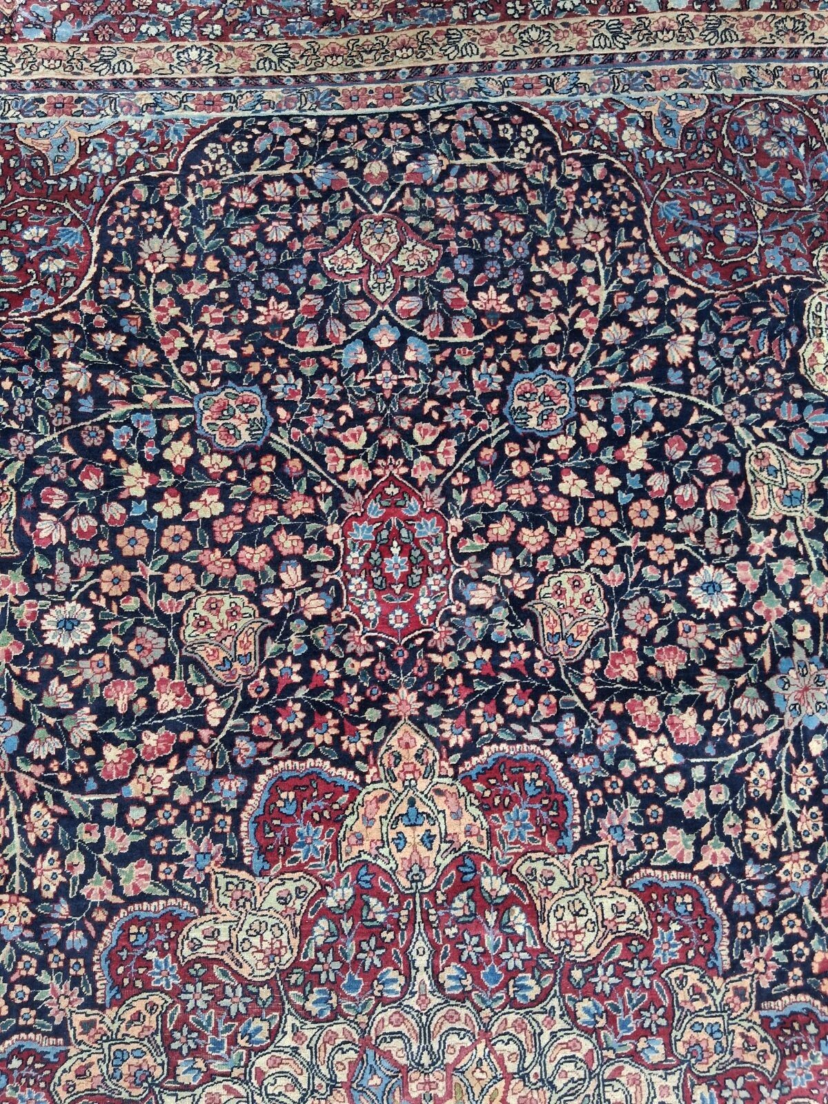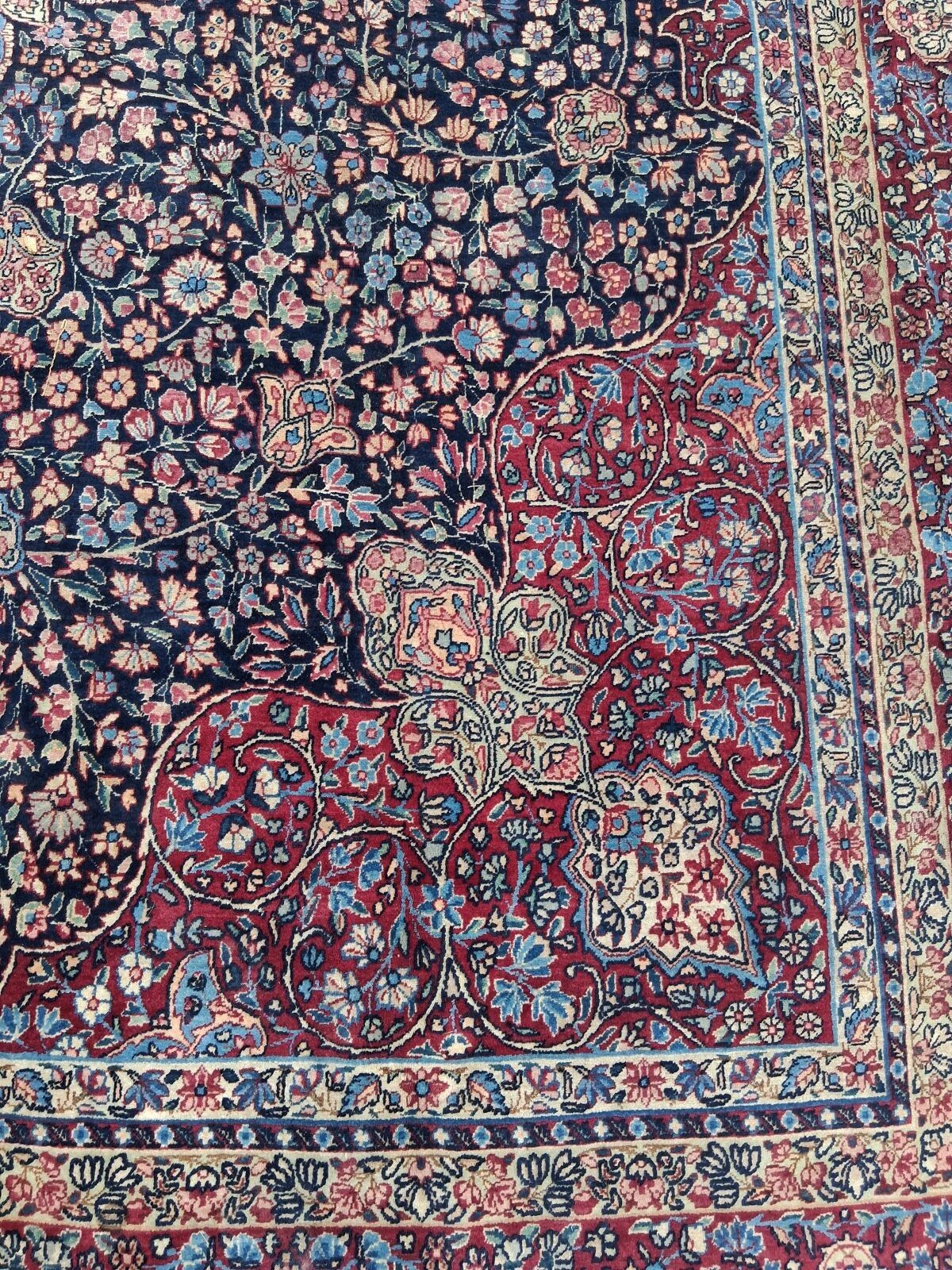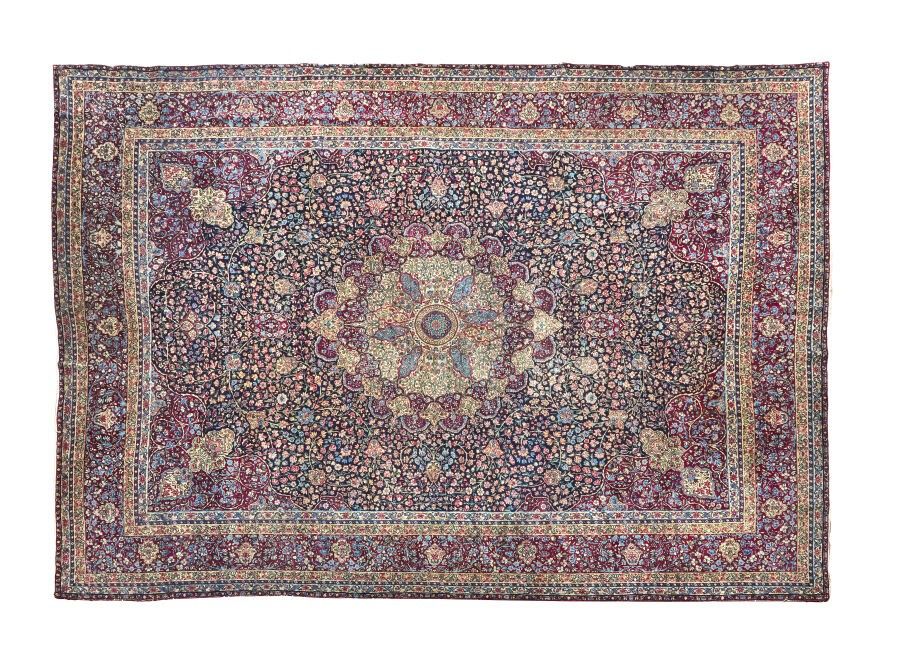 The carpet is decorated with a central polychrome rosette on a navy blue background enhanced by an elegant stylised floral design. The whole composition is embellished with four wine-red spandrels, and a wide border with garlands of flowers is framed by four counter-borders.