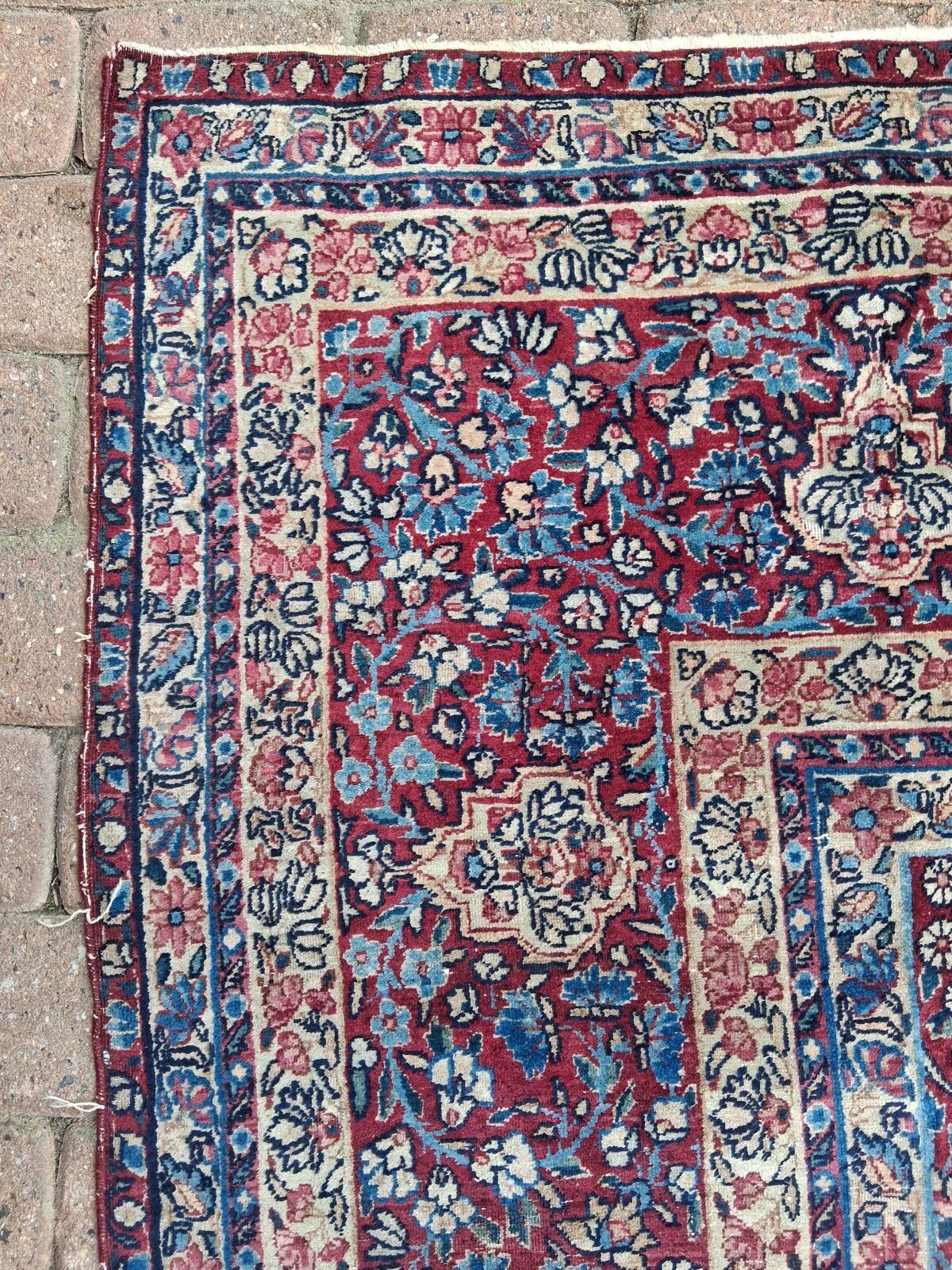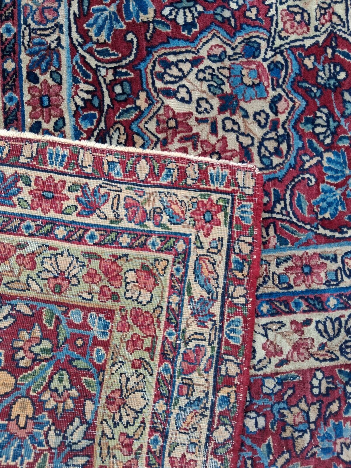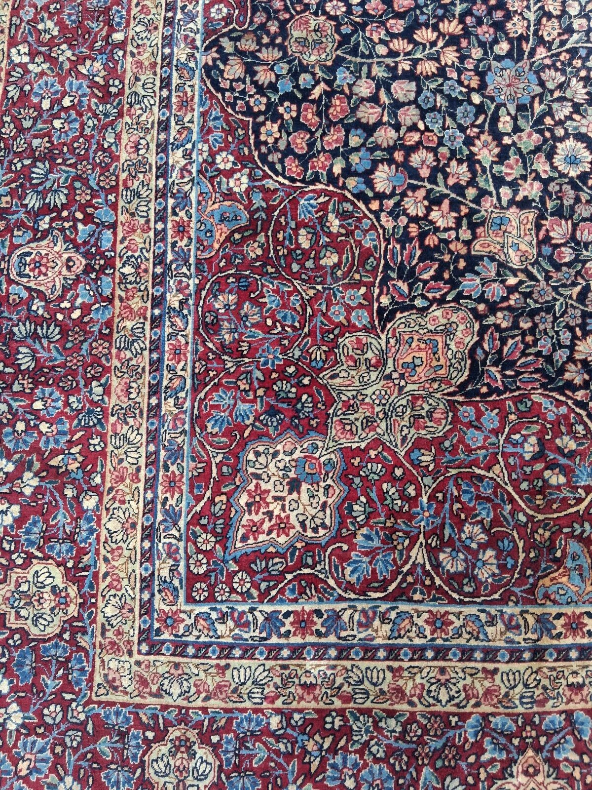 The carpet is decorated with a central polychrome rosette on a navy blue background enhanced by an elegant stylised floral design. The whole composition is embellished with four wine-red spandrels, and a wide border with garlands of flowers is framed by four counter-borders.