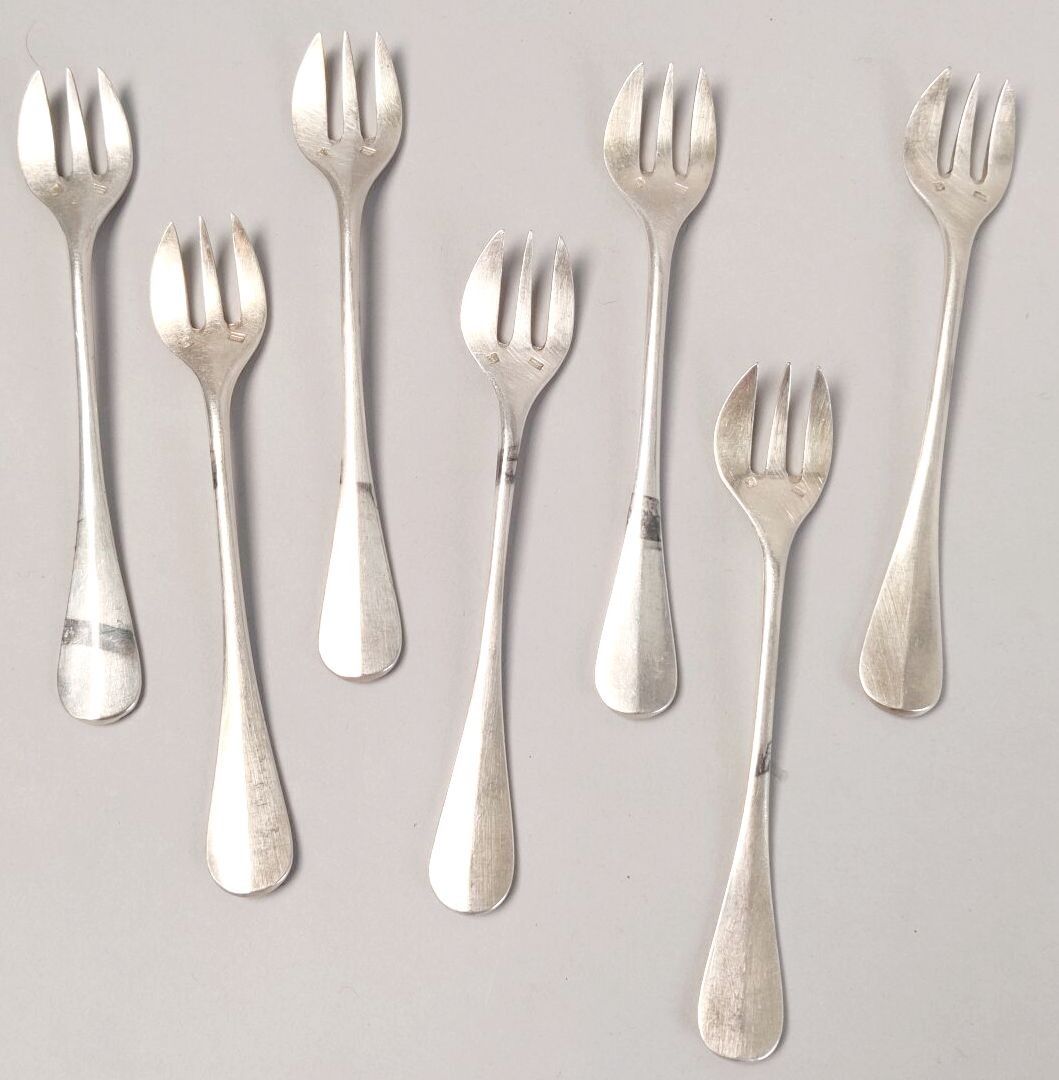 Eight silver-plated oyster forks.