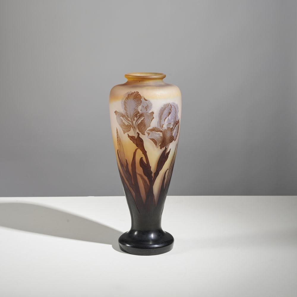 A signed baluster-shaped vase in acid-etched multilayered glass with a rotating iris blossoms decoration by Établissements Gallé.