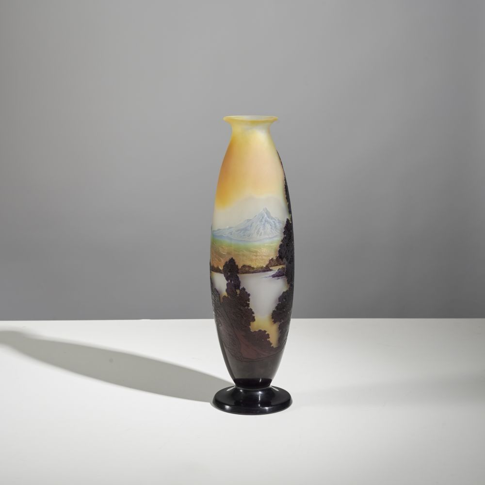 A signed baluster-shaped vase in acid-etched multilayered glass with a rotating wooded alpine lakeside landscape decoration by Établissements Gallé.