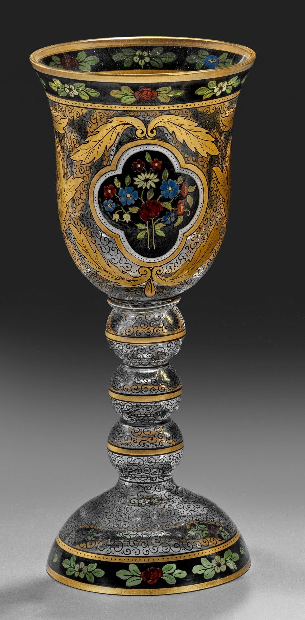 A Bohemian glass goblet. The style is strongly reminiscent of objects by Julius Mühlhaus & Co. in Haida (Nový Bor/Bohemia). Enamel and gold decor.
