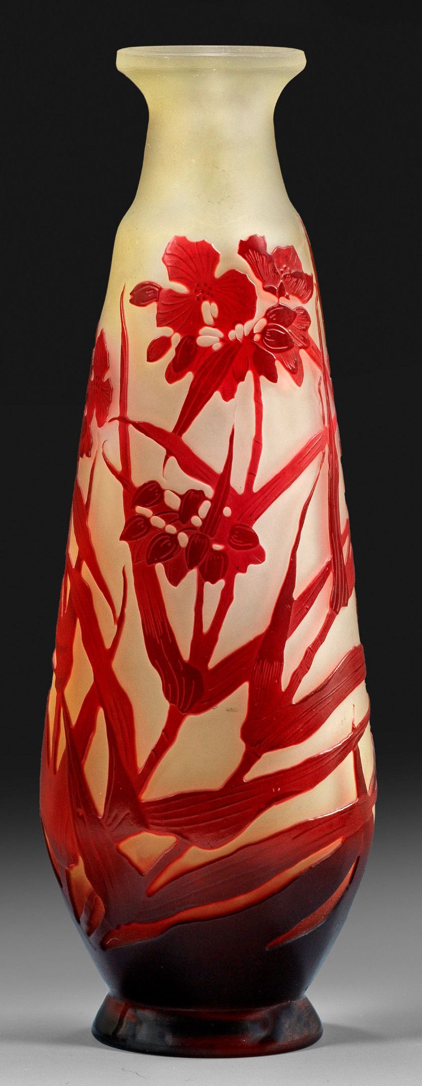 Jugendstil-Ziervase mit Blumen-Dekor von Gallé Längsovale Form mit Fuß. Überfangglas, farblos, gelblich-grün, Rottöne. In mehreren Arbeitsgängen geätzter Dekor aus Blüten- und Blattwerk. Sign. "Gallé". H. 25 cm.