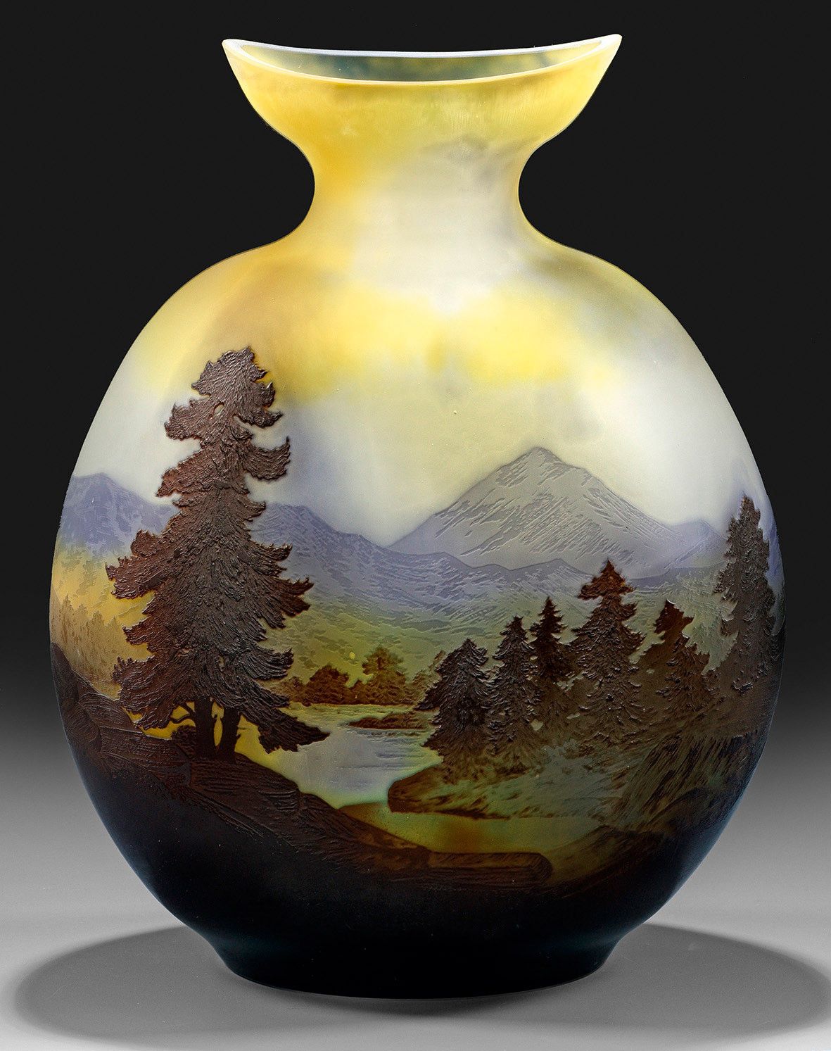 Große Gallé-Vase mit Alpenlandschaftsdekor "Paysage alpin" Stark ins Oval gedrückte, beidseitig abgeplattete Beutelform mit kurzem Hals und korrespondierend zu einem breiten Spitzoval (bzw. einer Navetteform) ausgezogener Mündung. Überfangglas, farblos, bernsteingelb, hellblau, violett und dunkelbraun. In mehreren Arbeitsgängen geätzter und polierter Dekor mit abendlich gestimmtem Landschaftsmotiv und Blick auf einen von Bäumen umstandenen See und Alpengipfel. Sign. "Gallé". H. 31,5 cm.
