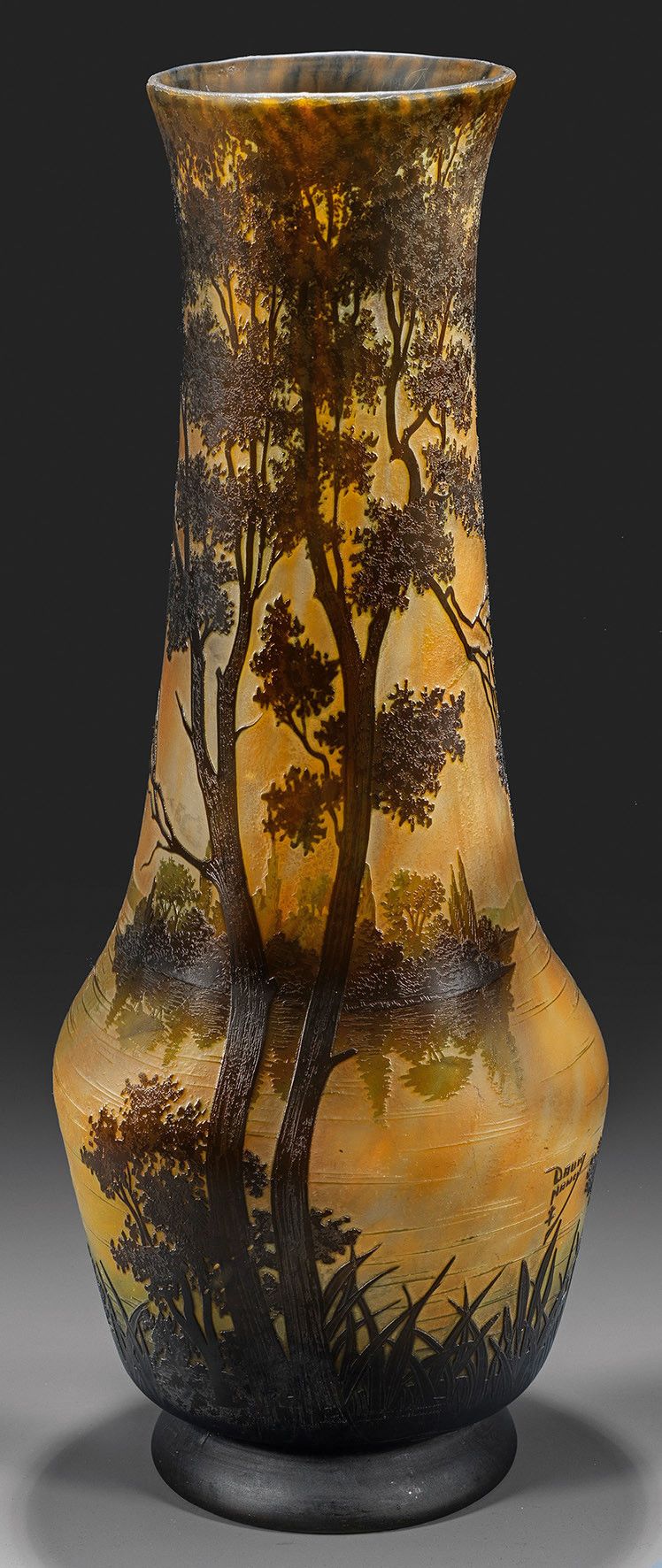 Balusterform. Überfangglas, farblos, gelbe Pulvereinschmelzungen, dunkelgrüner Überfang. Geätzter Dekor aus einer baumbestandenen, abendlichen Ufer- oder Küstenlandschaft im Gegenlicht. Sign. "DAUM NANCY" in Verbindung mit Lothringer Kreuz. H. 53 cm.