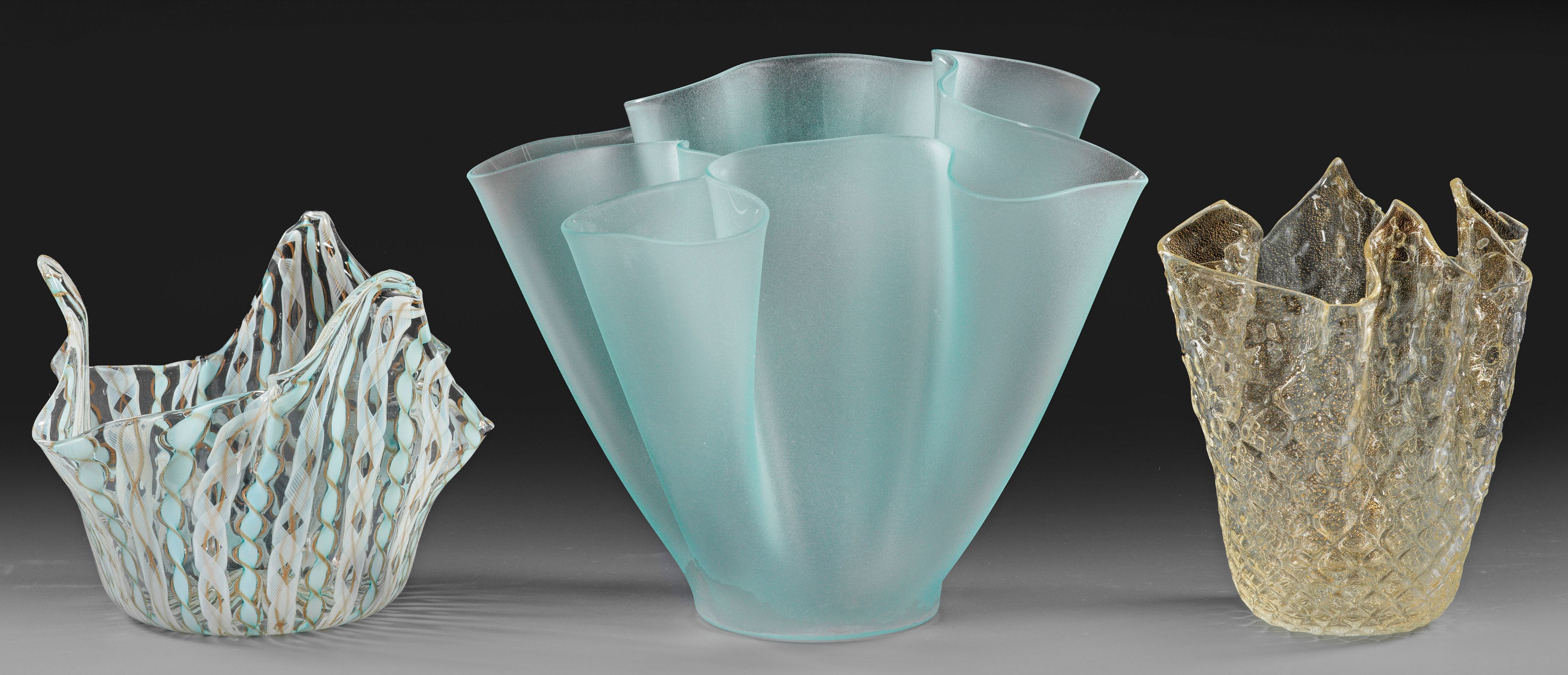 Three Italian Murano "Fazzoletto" glass vases. The big one probably designed by Pietro Chiesa for Fontana Arte.