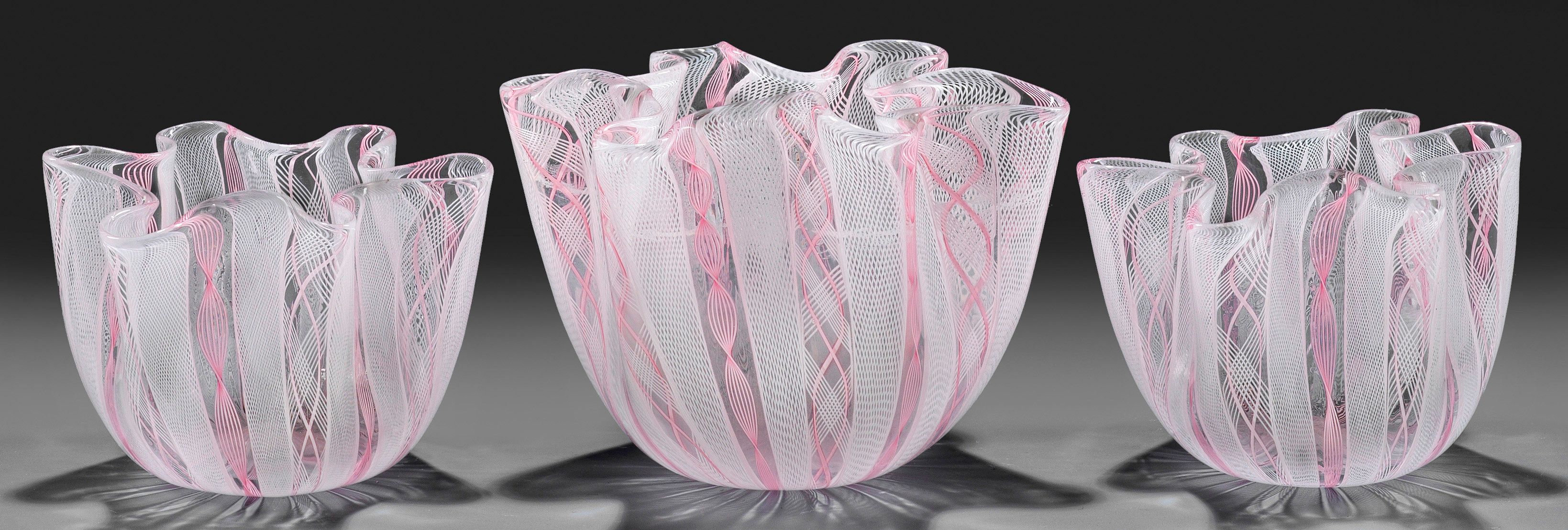 Drei "Fazzoletto"-Vasen von Venini Farbloses Glas mit Bandeinlagen in Rosa und Weiß. Firmen-Sign. von Venini. H. 5,5 cm - 7,5 cm.